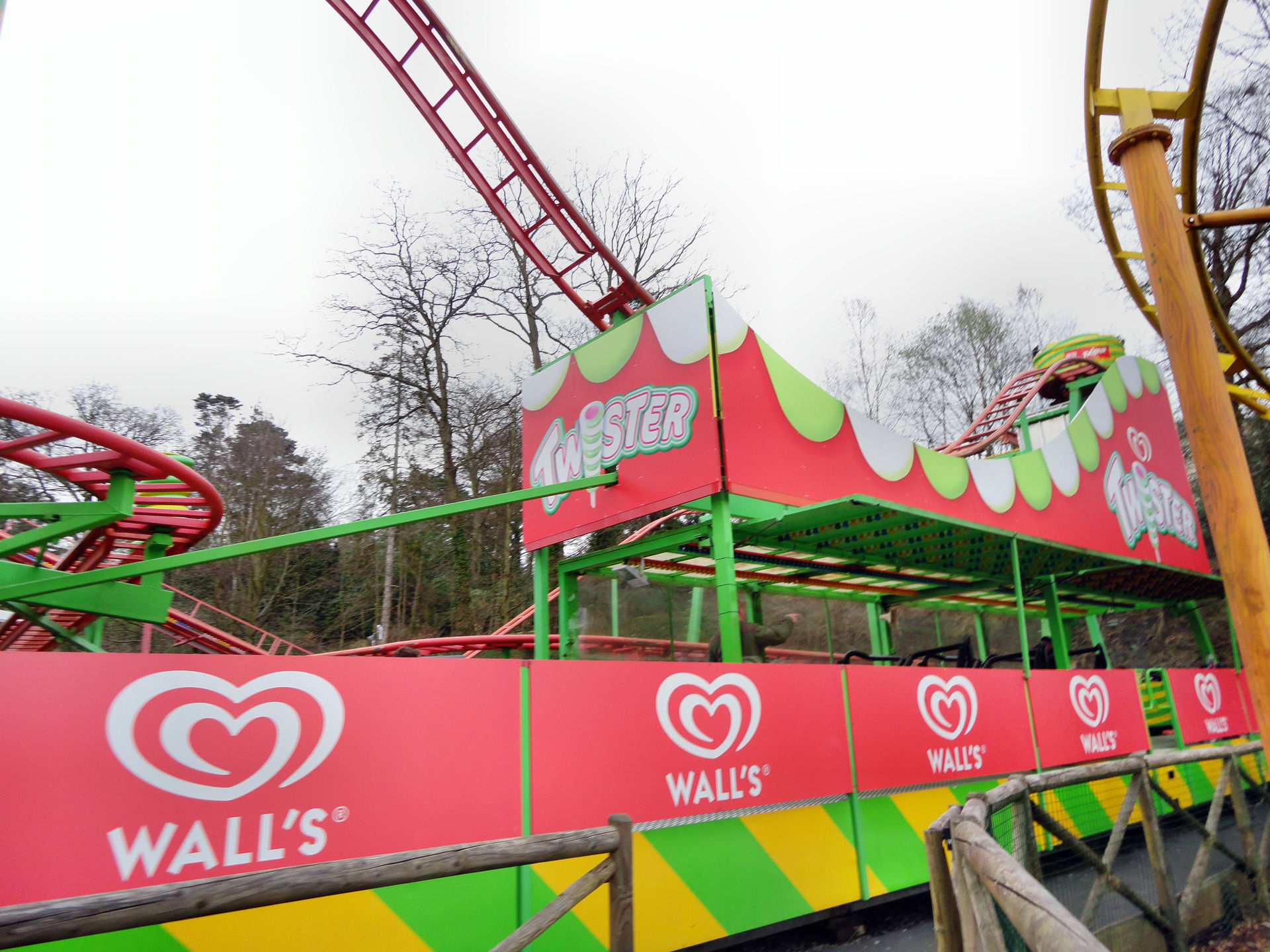 Der Spinning Coaster kommt in hässlicher Eis – Werbung - Thematisierung daher.