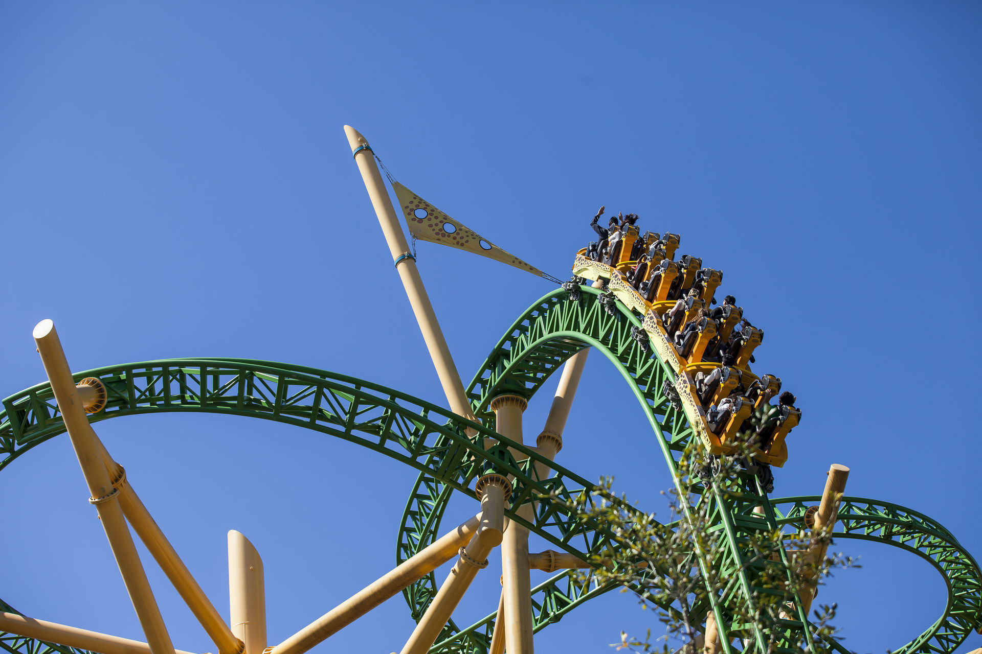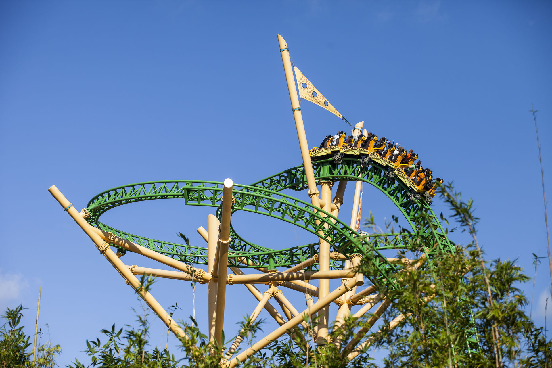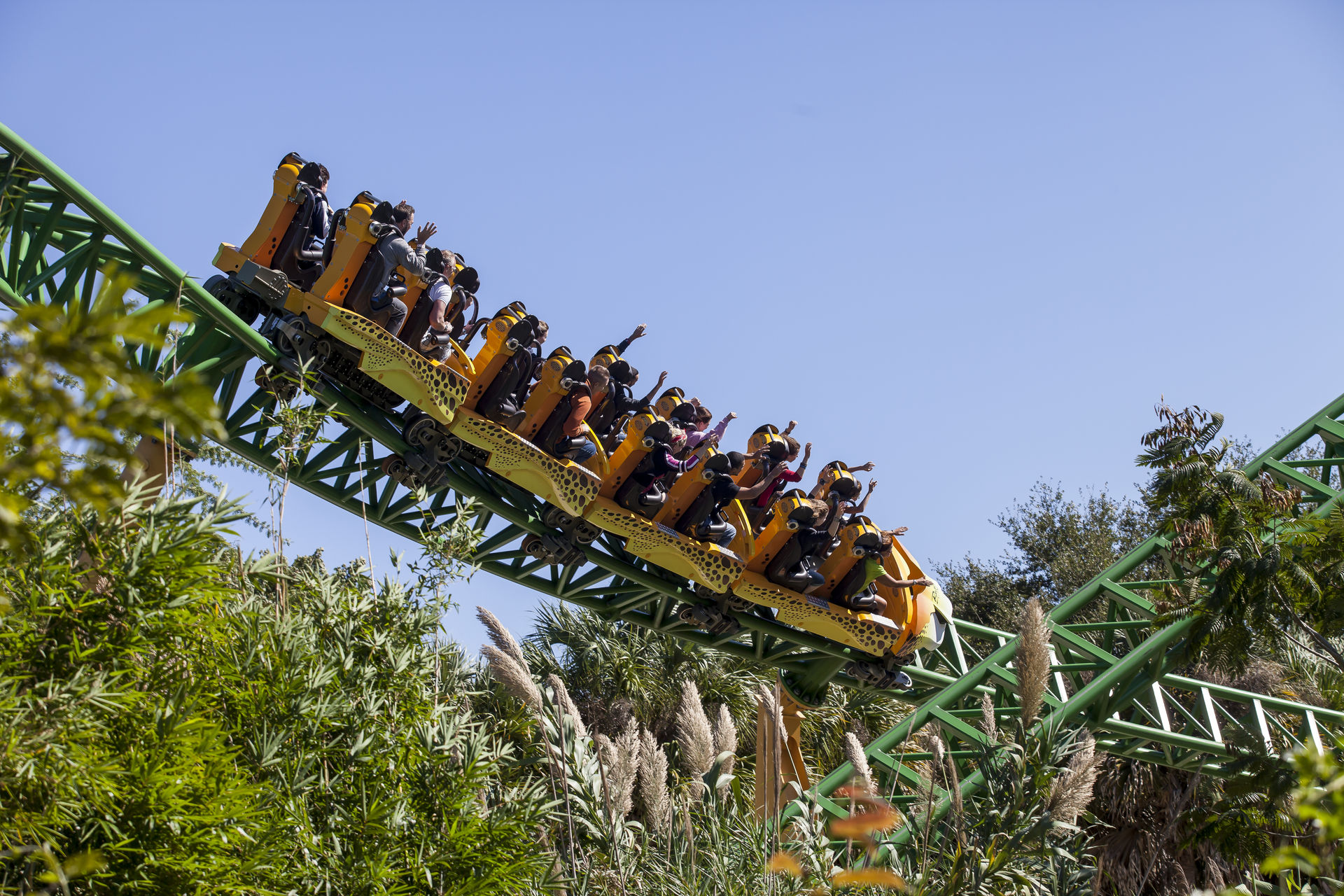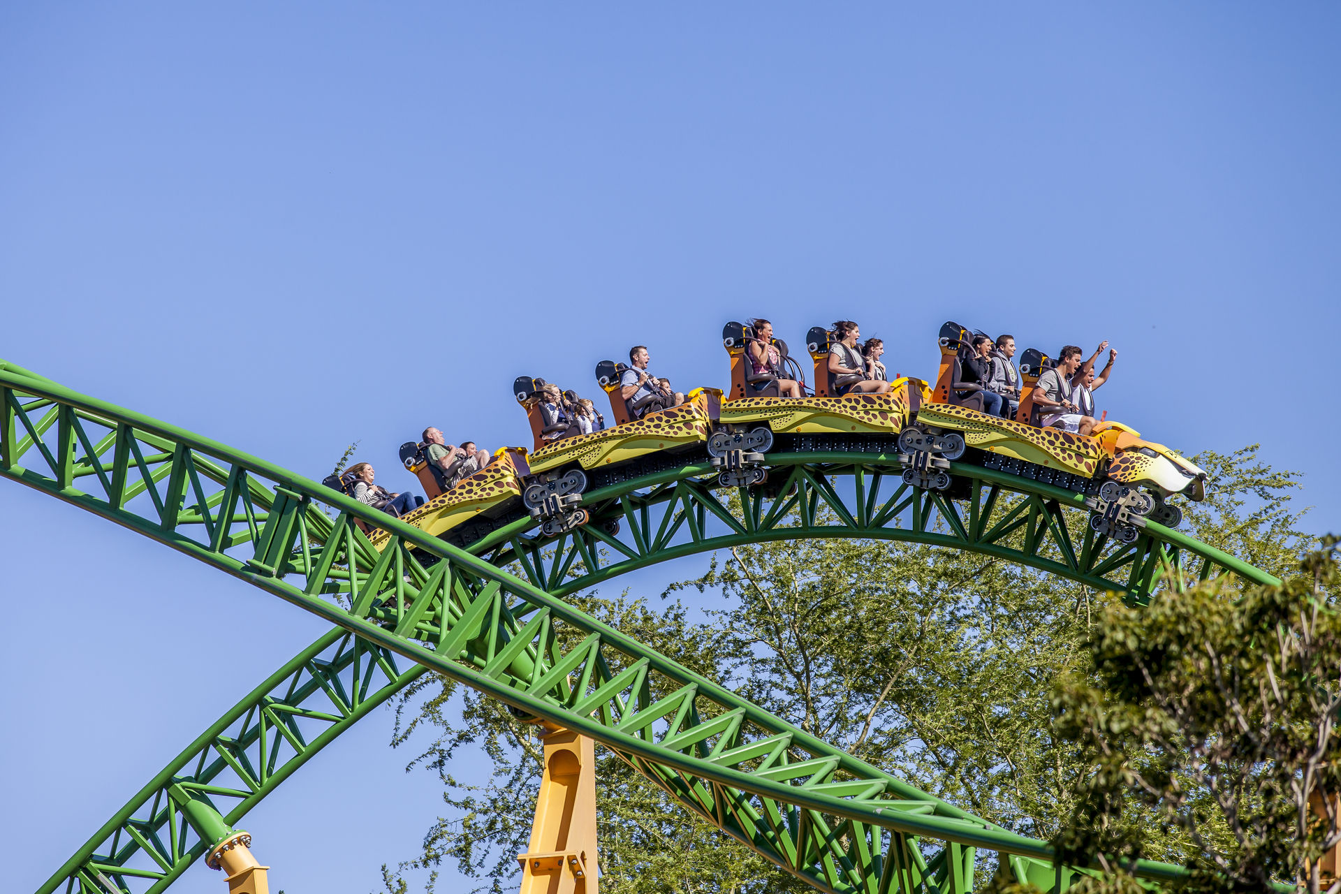 Die Bahn hat noch sichtlich mit ihren Kinderkrankheiten zu kämpfen. Ein bis zweistündige Downtimes waren an unseren beiden Besuchstagen keine Seltenheit. Hat man es dann trotzdem bis in die sehr vielversprechenden Züge geschafft, geht es direkt mit einem Mini-Launch aus der Station heraus in eine 270° Linkskurve. Erst hier nimmt der Zug durch einen zweiten Launch an Fahrt auf um danach an Höhe zu gewinnen. Zuerst schlängelt sich der Zug gemütlich durch die Baumkrone, bevor er wieder auf Boden zurückkommt und den Rest seiner "Jagd" hinter sich bringt. So durchdacht die Bahn von den Elementen und ihrer Inszenierung her auch sein mag, kommt während der Fahrt nicht wirklich Fahrspaß auf. Es fehlt einfach an Geschwindigkeit und Power. So ist Cheetah Hunt nur eine große und teure Familienachterbahn.