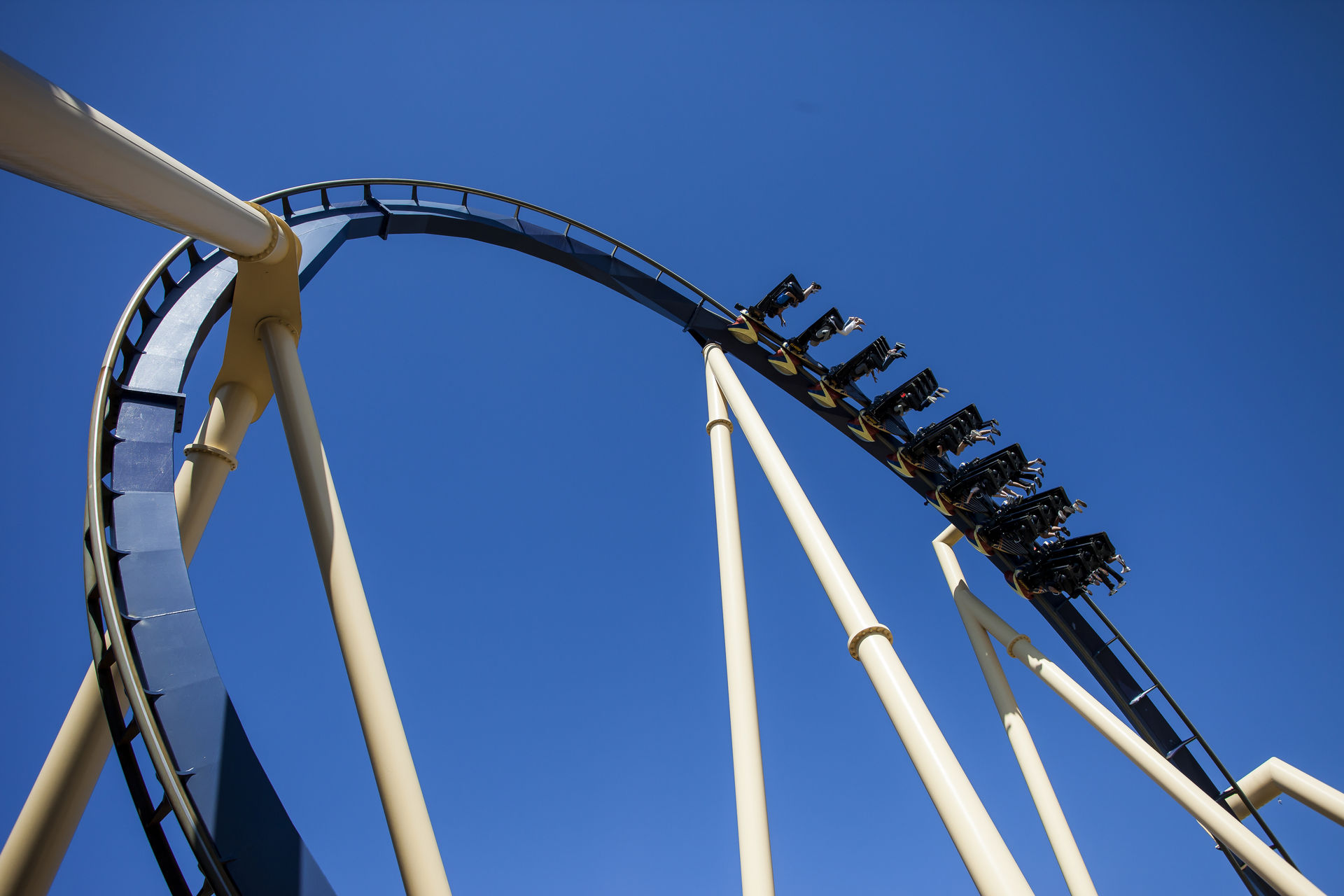 B&M Dame Kumba. Die Bahn wurde vor wenigen Jahren neu lackiert und macht jetzt wieder einen richtig guten Eindruck, der auch zu Fahrt passt. Die Inversionsfolge ist