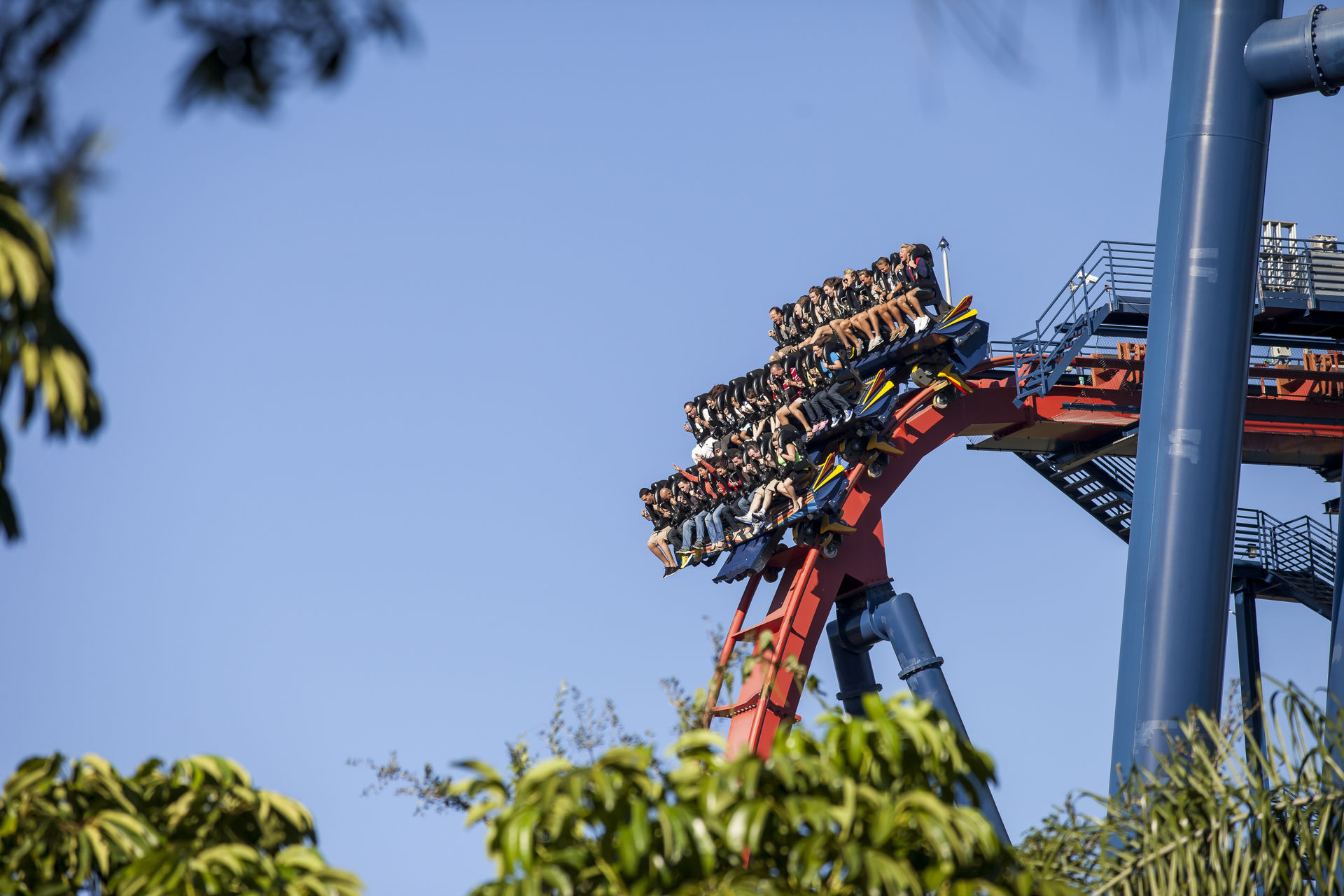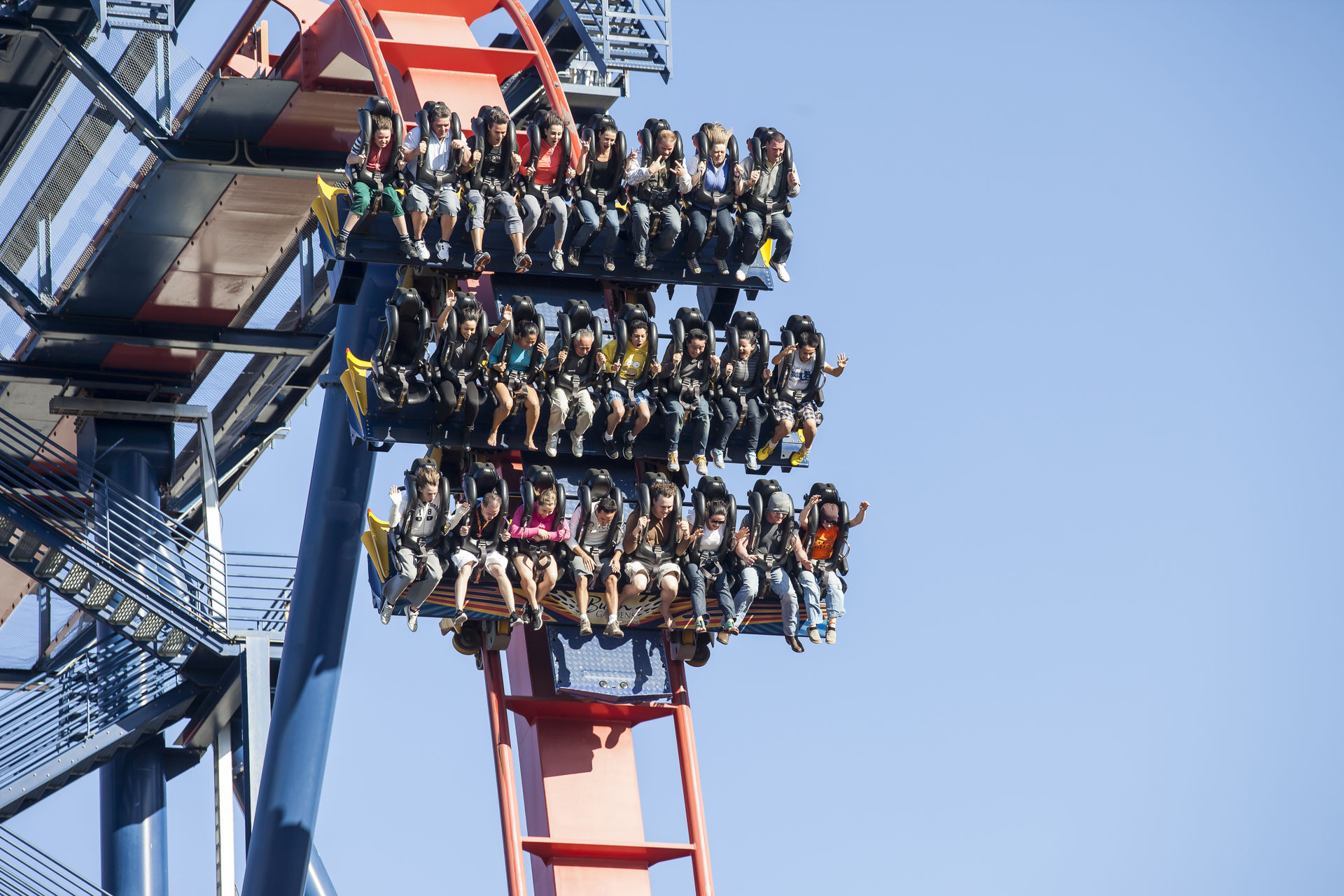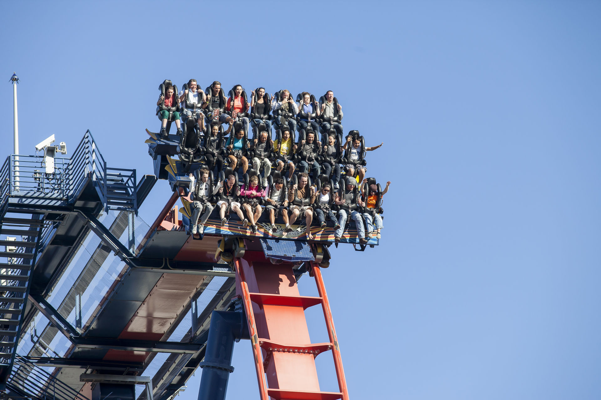Nachdem ich von Oblivion und Krake ziemlich enttäuscht worden war, waren meine Erwartungen an die Anlage ziemlich gering. Für unsere erste Fahrt sicherten wir uns die äußeren Platze in der letzten Reihe. Der gut 60 Meter hohe Lifthill bot genug Zeit um sich schonmal einen Überblick über den Rest des Parks zu verschaffen und die Sonne zu genießen. Sobald man in der Haltebremse ein bisschen abgehangen hat ist Schluss mit der Entspannung. Der letzte Wagen wird mit einer gehörigen Portion