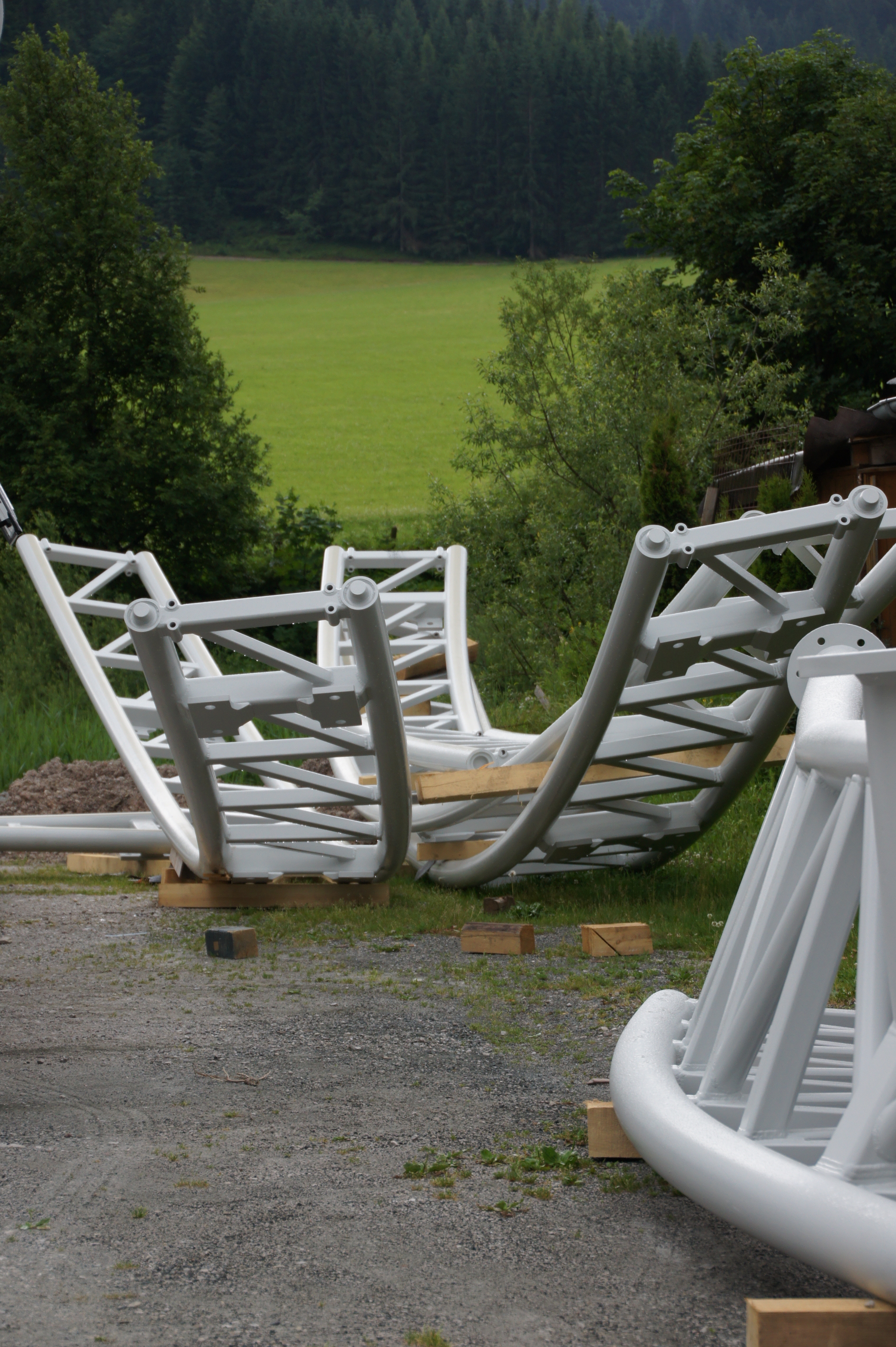 Mit dem Aufbau wird/wurde begonnen. Erste Schienenteile liegen im Park/am Parkplatz. Die Bahn wird weiße Schienen erhalten. Stützenfarbe weiß ich nicht. In wieweit das Hochwasser, was den Park ziemlich getroffen hat den Bau verzögern wird weiß ich nicht.
