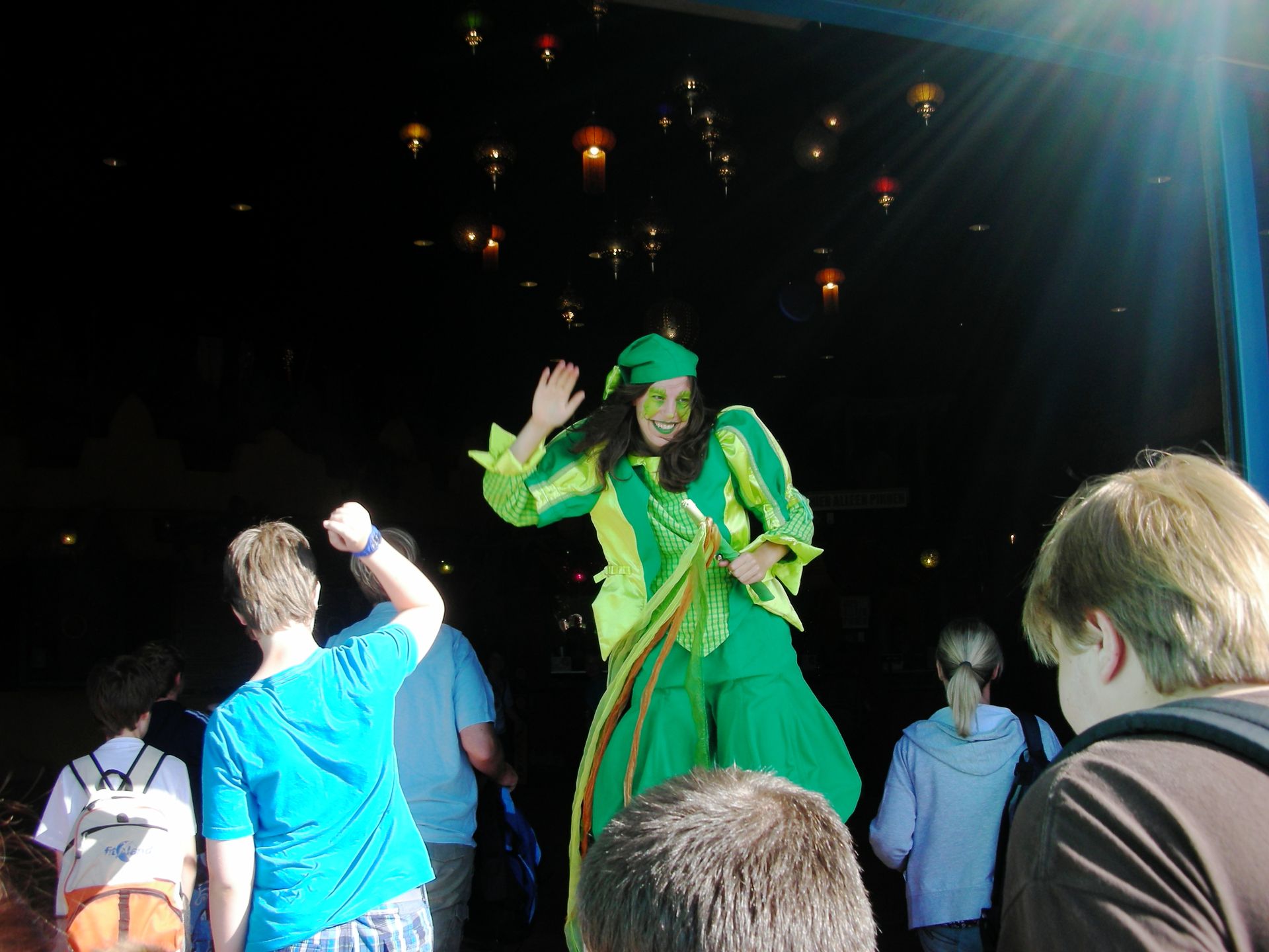 Doch lassen wir die Sache erst einmal etwas ruhiger angehen. Nach kurzer Wartezeit vor dem Eingang des Toverlands, welcher im Übrigen wie eine übliche Schiebetür aus Tante Emmas Supermarkt aussieht, sollte ein grünes Wesen auf der Innenseite gegen unsere Ungeduld in Aktion treten. Mit den Jüngsten von uns Menschen spielte sie und presste dabei immer wieder ihre Hände gegen das Glas – in verschiedenen Höhen, sodass die Kinder ihr manchmal auf die Finger klopfen konnten, manchmal aber auch am Versuch scheiterten. Pünktlich zur Eröffnung des Toverlands fuhr die gläserne Tür vor ihr geschwind zur Seite und die hineinströmenden Besucher setzten alles daran, dieser Frau ein letztes Mal an die Hände zu gehen.