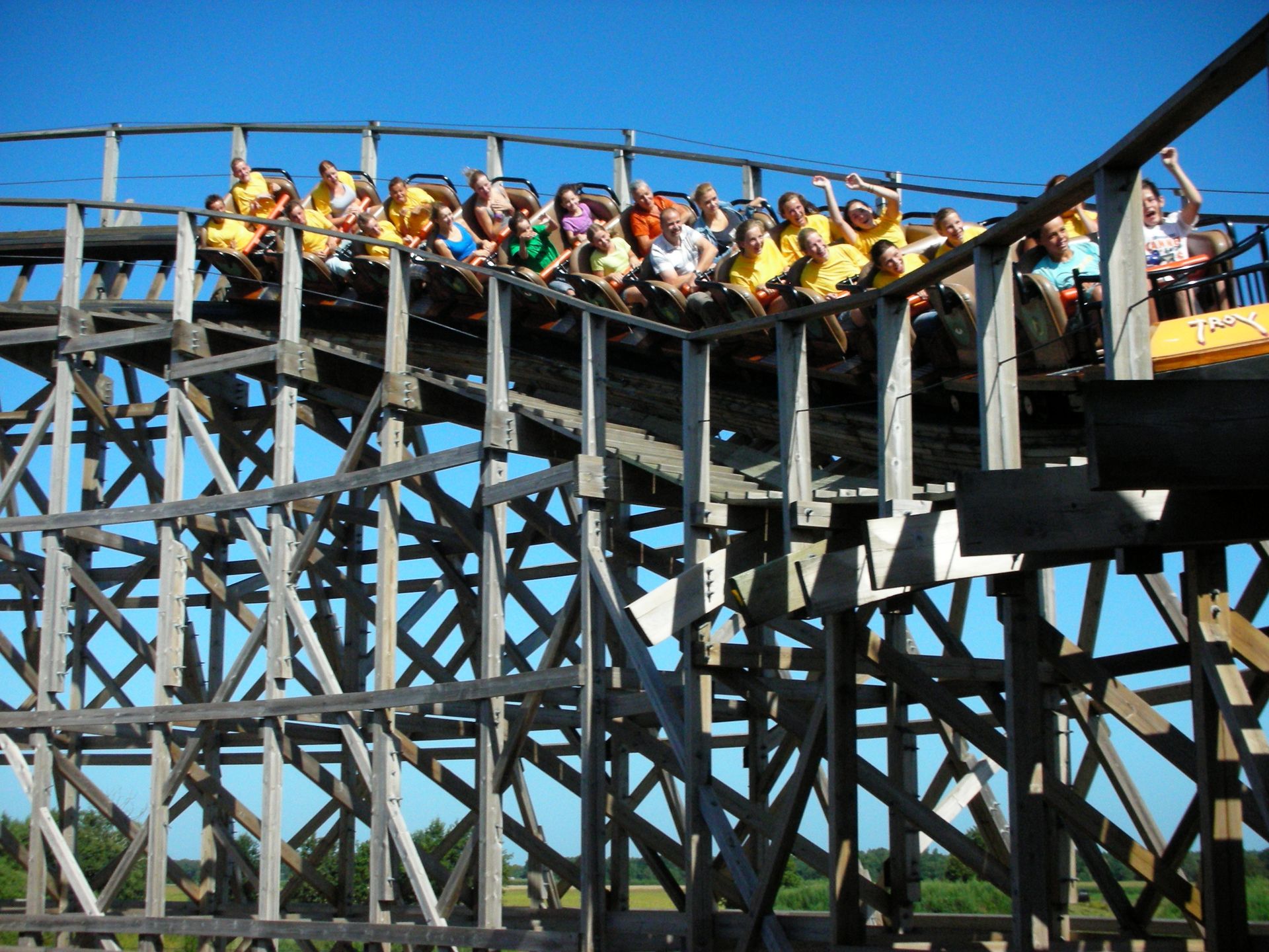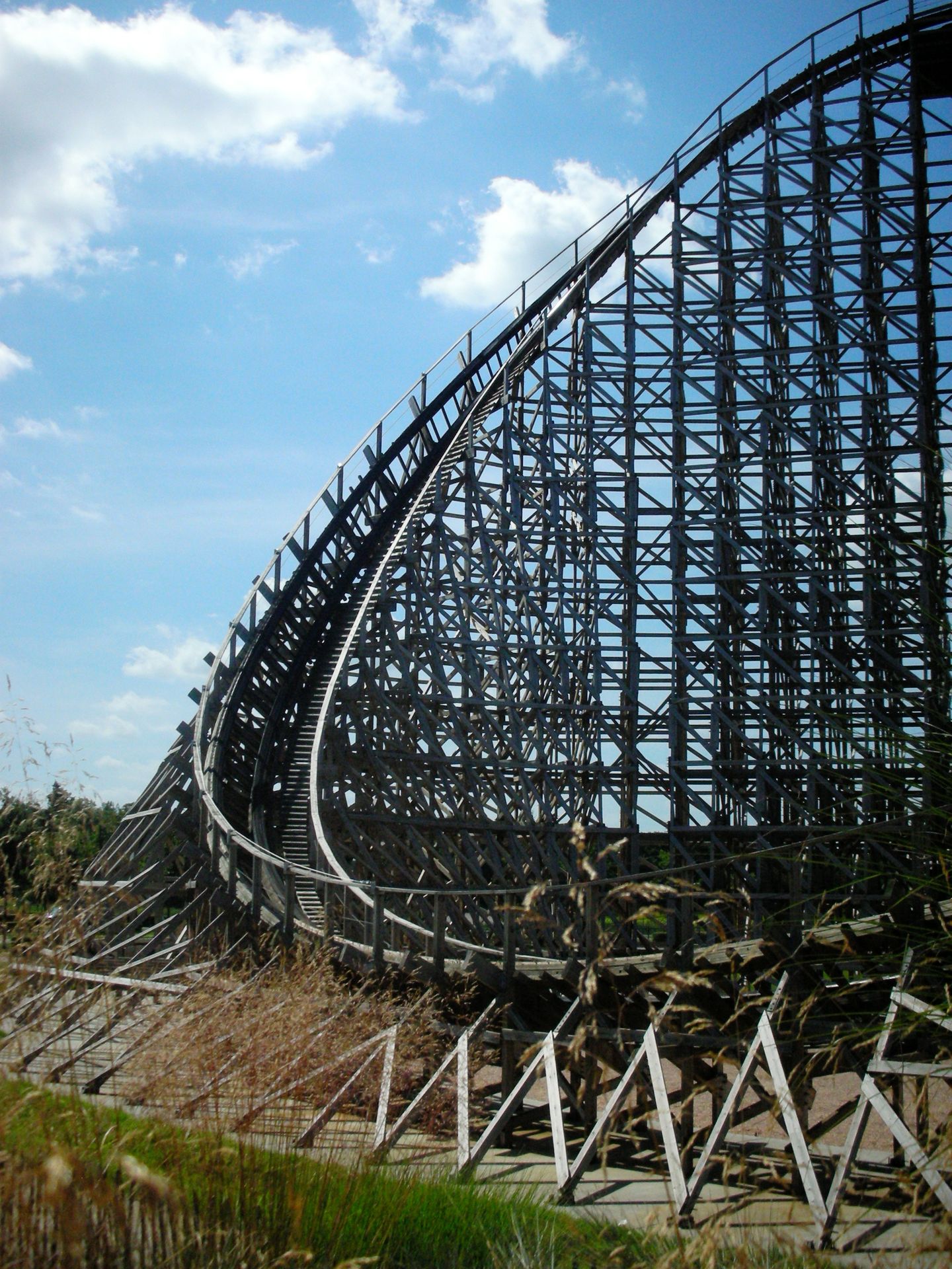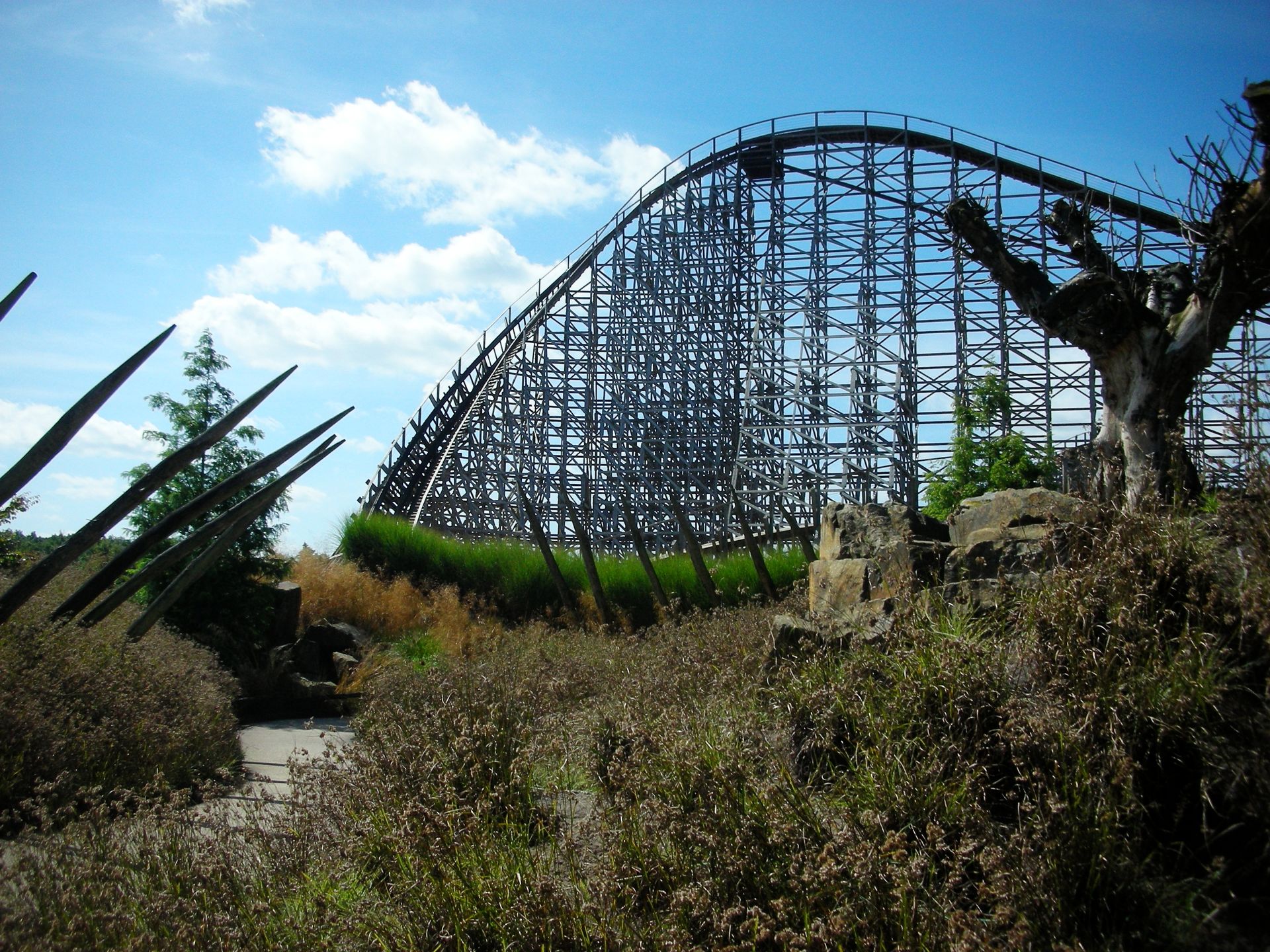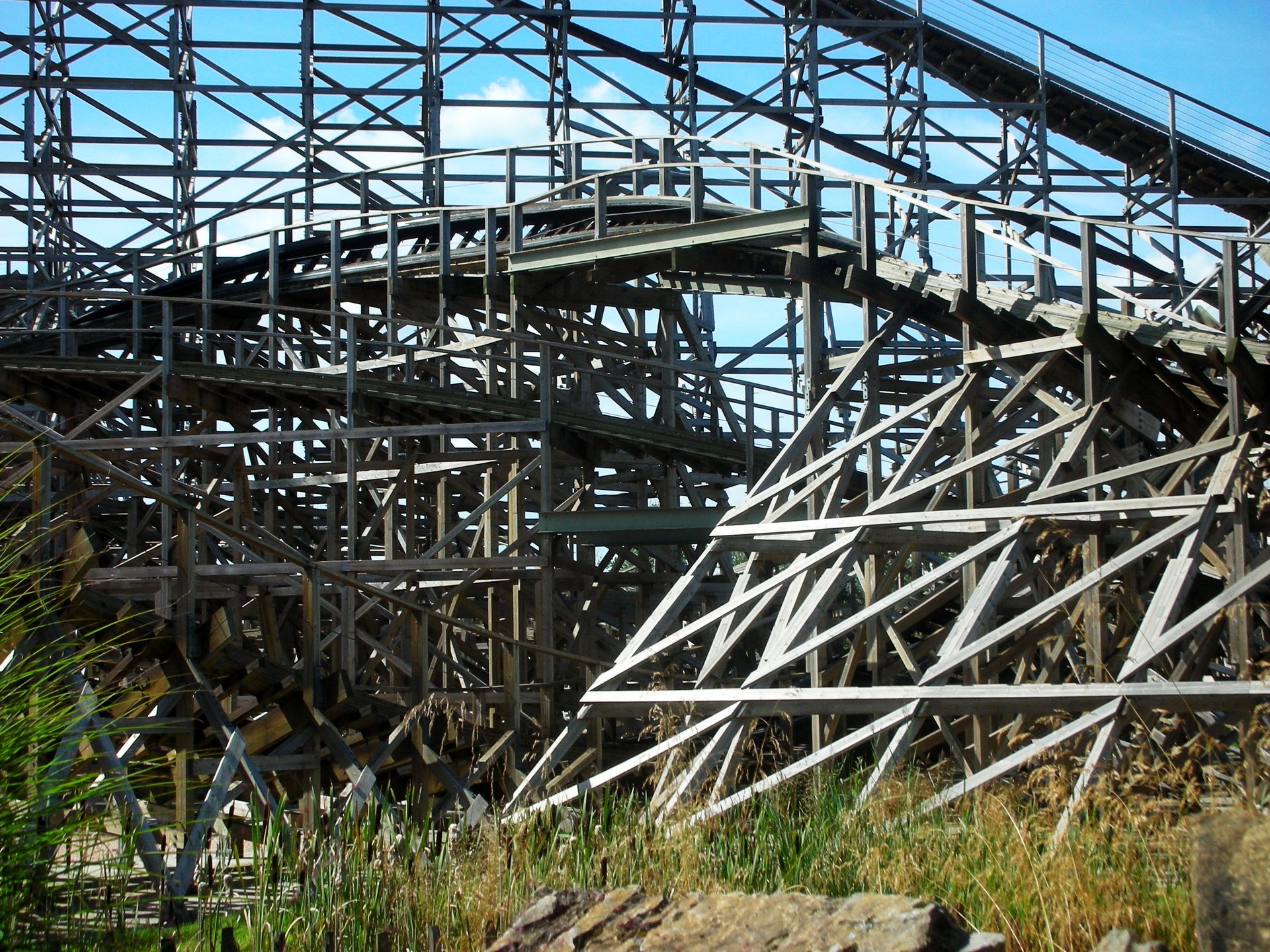 Entlang einiger abwärtsführender Kurven nehmen wir Schwung auf, finden uns plötzlich inmitten von unzähligen Holzbalken wieder und haken geräuschvoll in die Kette ein. Es ratscht und klackert überall, der Geruch von Holz steigt uns in die Nase und durch die Balken hindurch erwidert der strahlend blaue Morgenhimmel unsere Vorfreude auf die herannahende Fahrt. Der Lifthill scheint nicht enden zu wollen, da neigt sich endlich die vorderste Reihe gen Abgrund und reißt uns alle unerbitterlich mit. Auf den hinteren Sitzplätzen besticht der