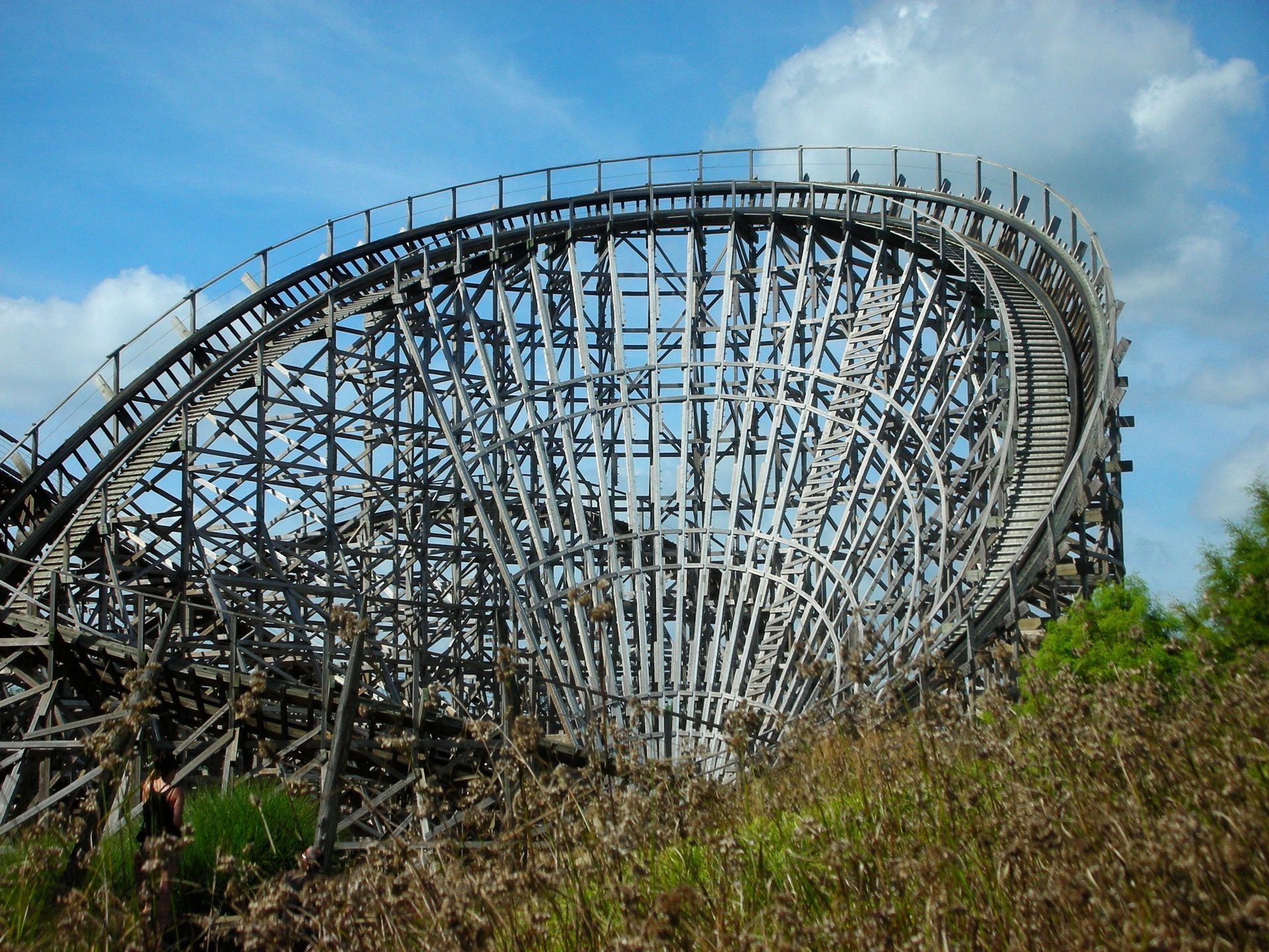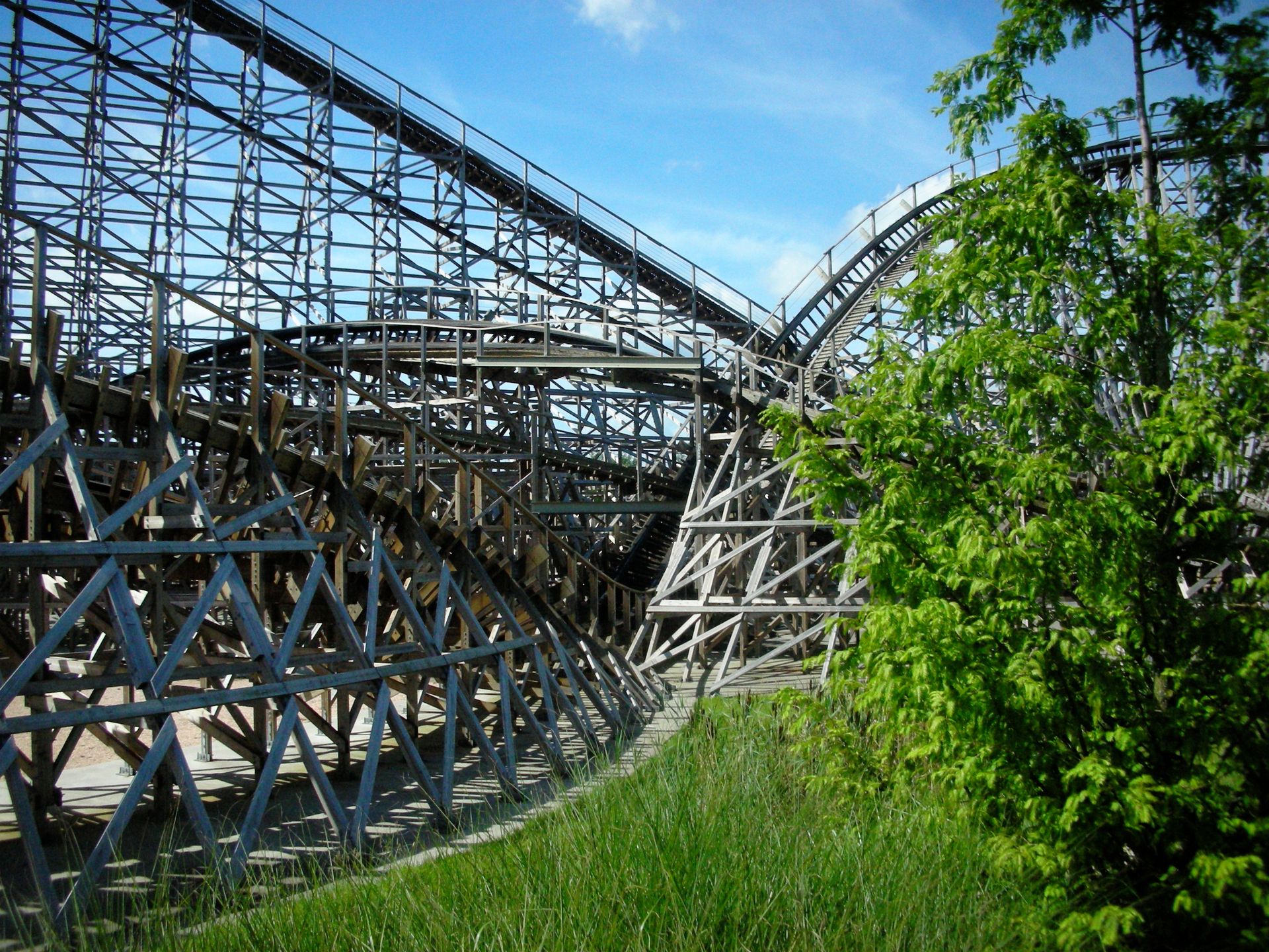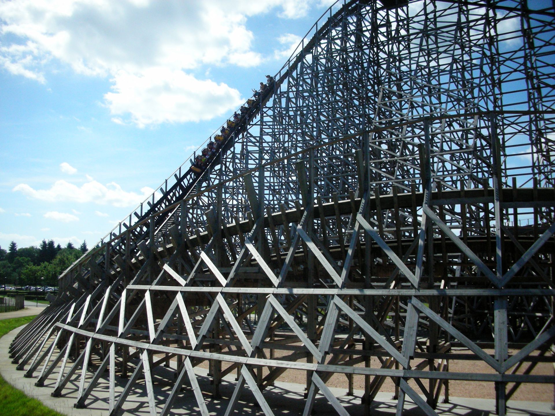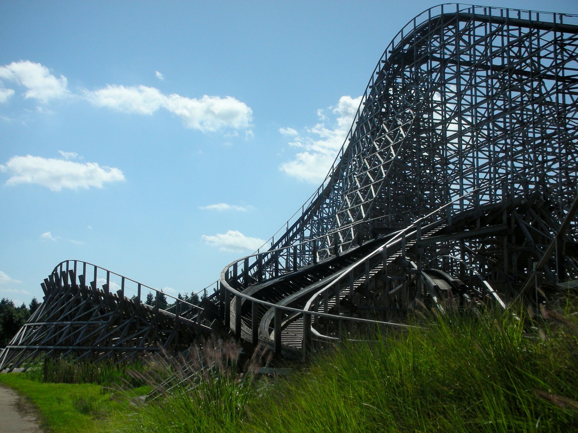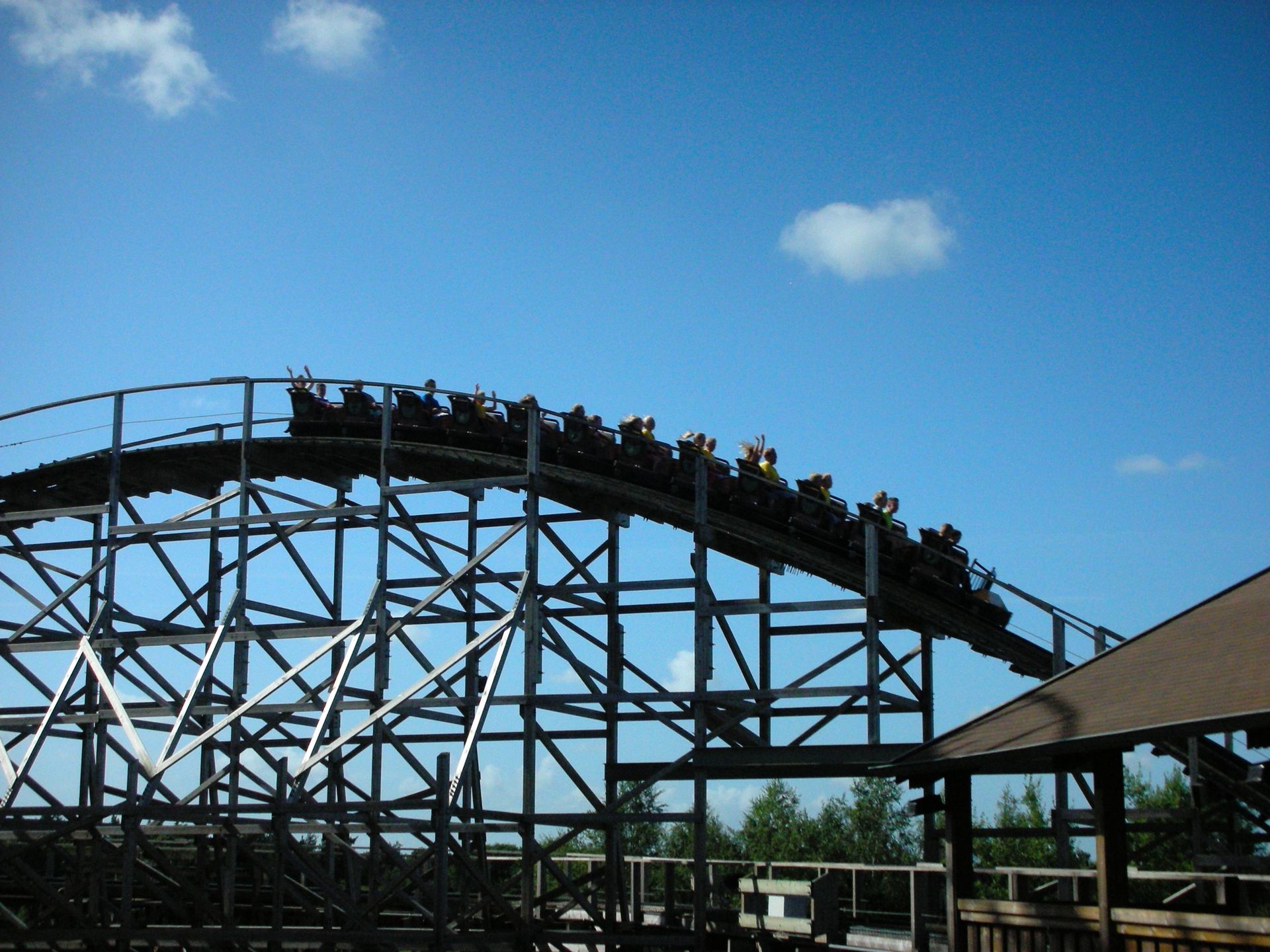 Entlang einiger abwärtsführender Kurven nehmen wir Schwung auf, finden uns plötzlich inmitten von unzähligen Holzbalken wieder und haken geräuschvoll in die Kette ein. Es ratscht und klackert überall, der Geruch von Holz steigt uns in die Nase und durch die Balken hindurch erwidert der strahlend blaue Morgenhimmel unsere Vorfreude auf die herannahende Fahrt. Der Lifthill scheint nicht enden zu wollen, da neigt sich endlich die vorderste Reihe gen Abgrund und reißt uns alle unerbitterlich mit. Auf den hinteren Sitzplätzen besticht der