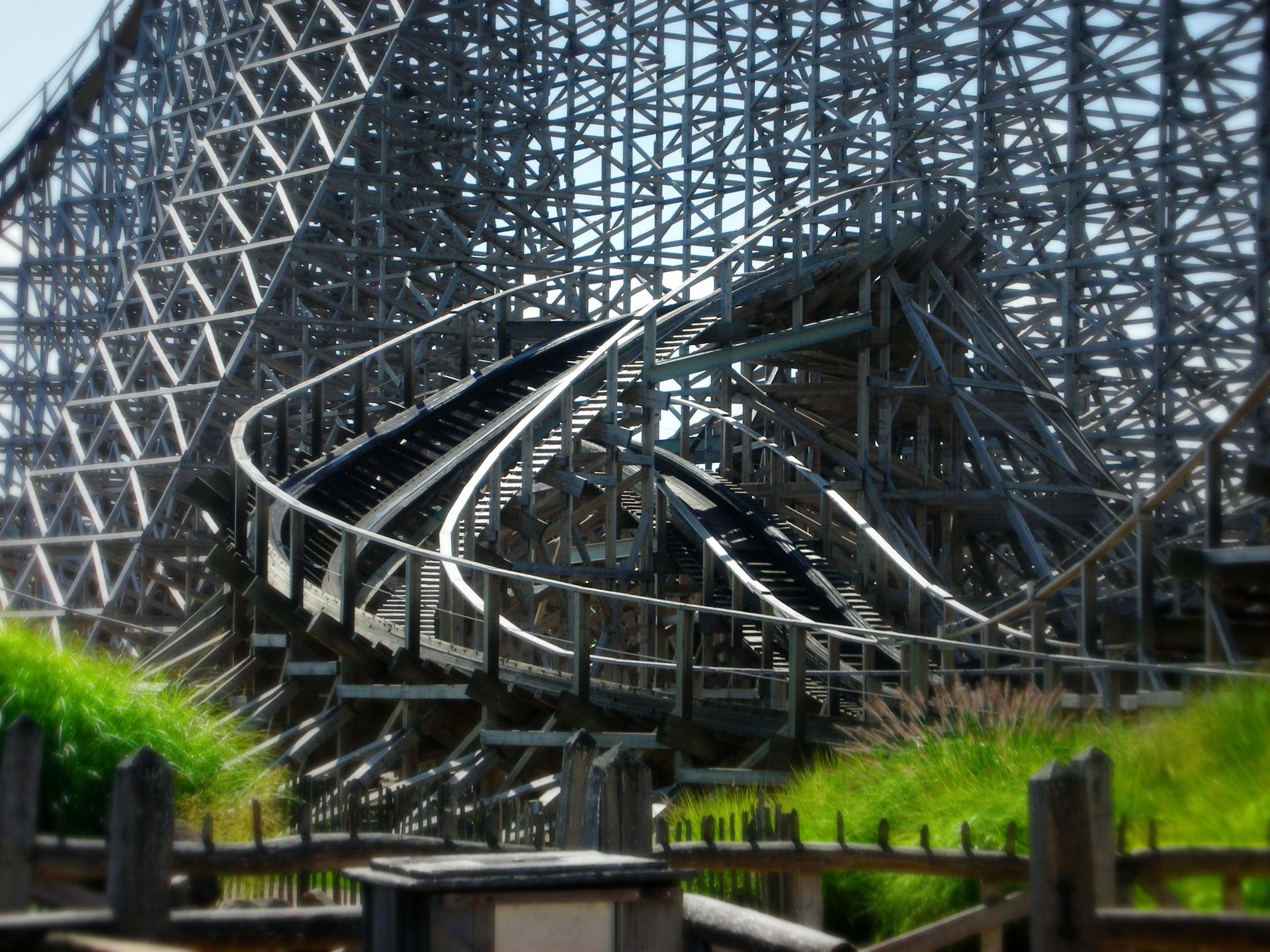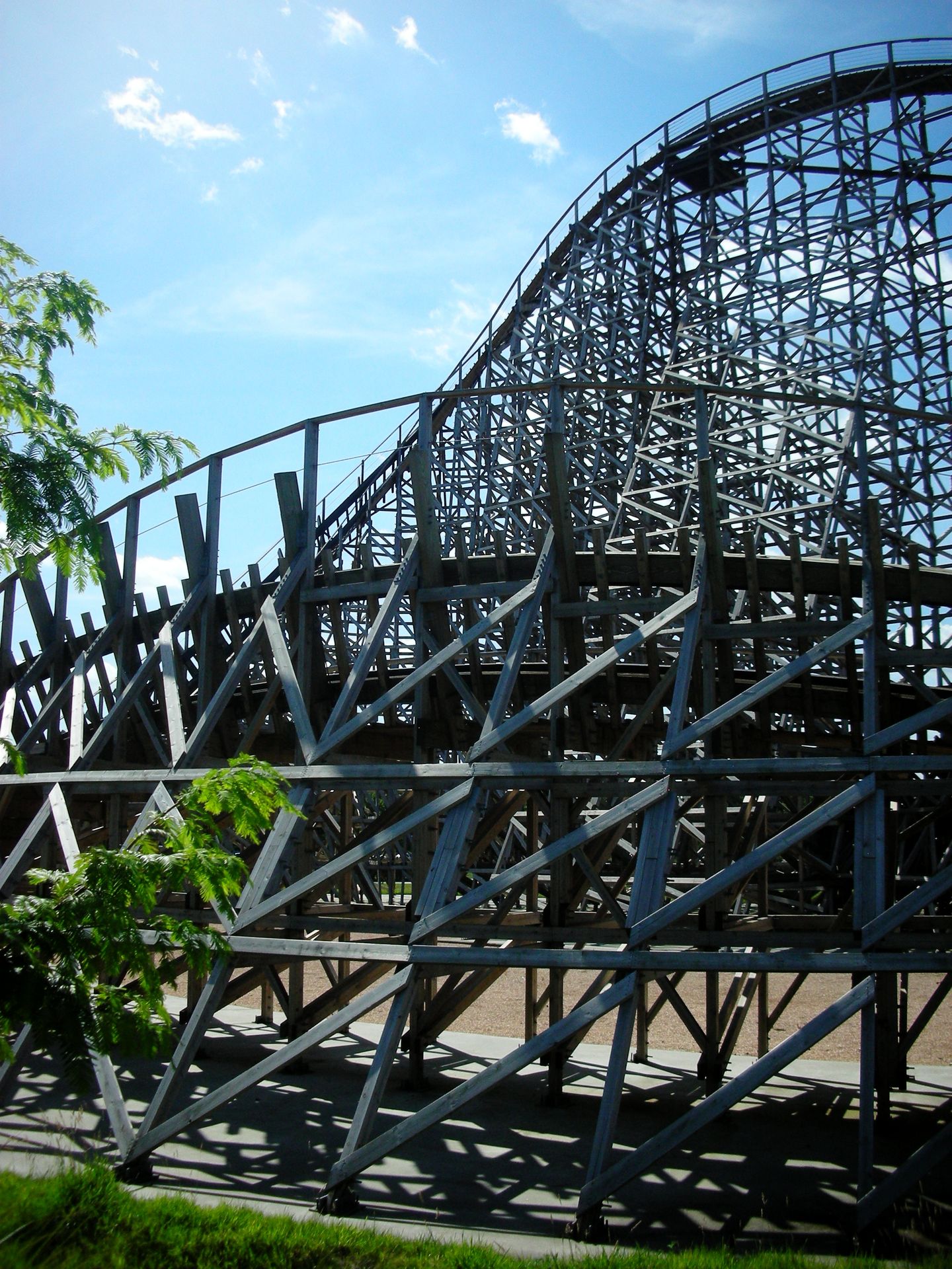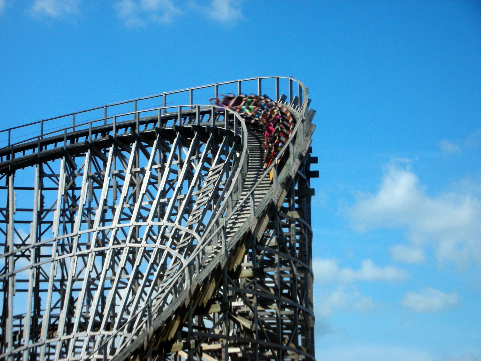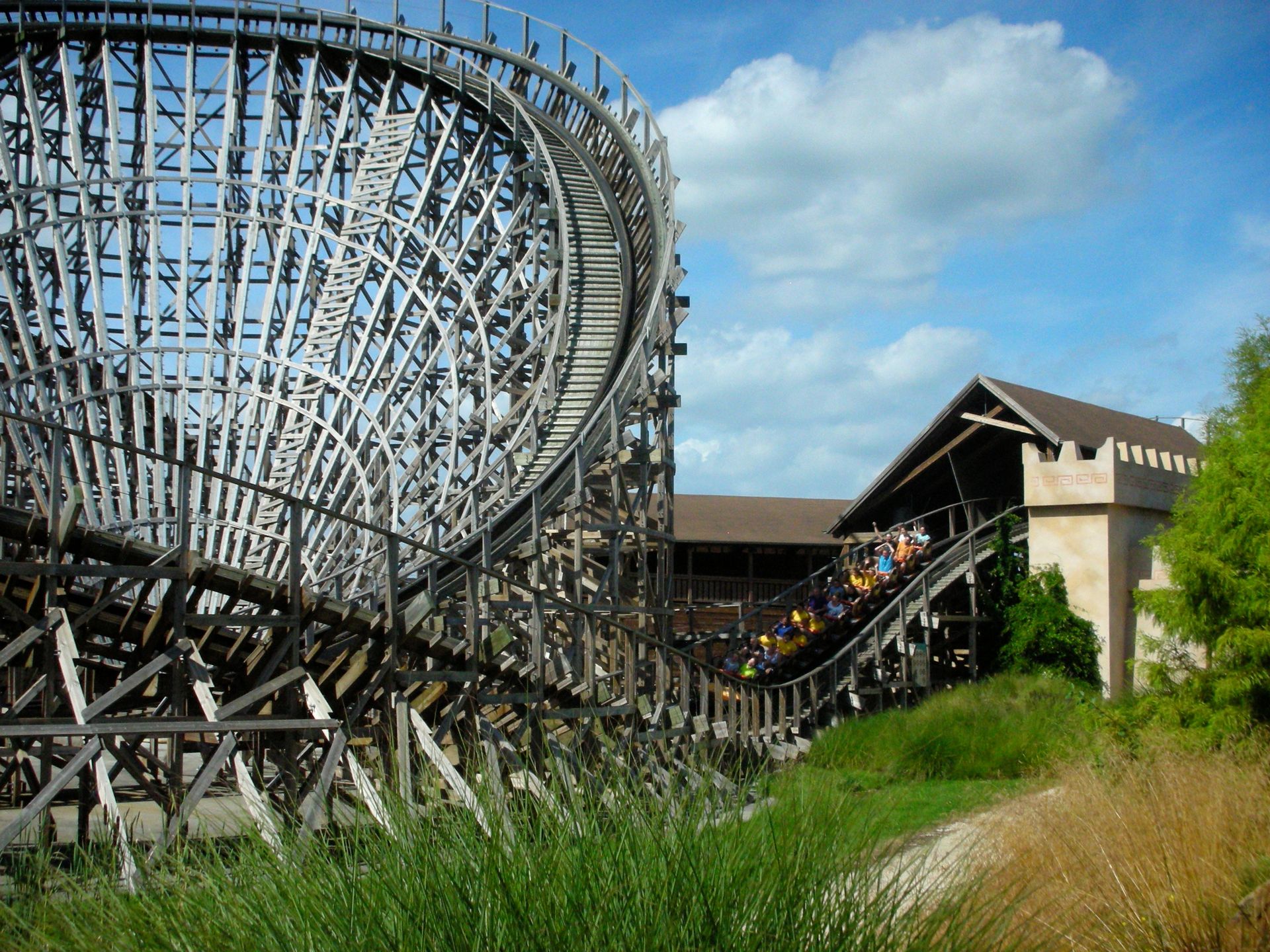 Entlang einiger abwärtsführender Kurven nehmen wir Schwung auf, finden uns plötzlich inmitten von unzähligen Holzbalken wieder und haken geräuschvoll in die Kette ein. Es ratscht und klackert überall, der Geruch von Holz steigt uns in die Nase und durch die Balken hindurch erwidert der strahlend blaue Morgenhimmel unsere Vorfreude auf die herannahende Fahrt. Der Lifthill scheint nicht enden zu wollen, da neigt sich endlich die vorderste Reihe gen Abgrund und reißt uns alle unerbitterlich mit. Auf den hinteren Sitzplätzen besticht der