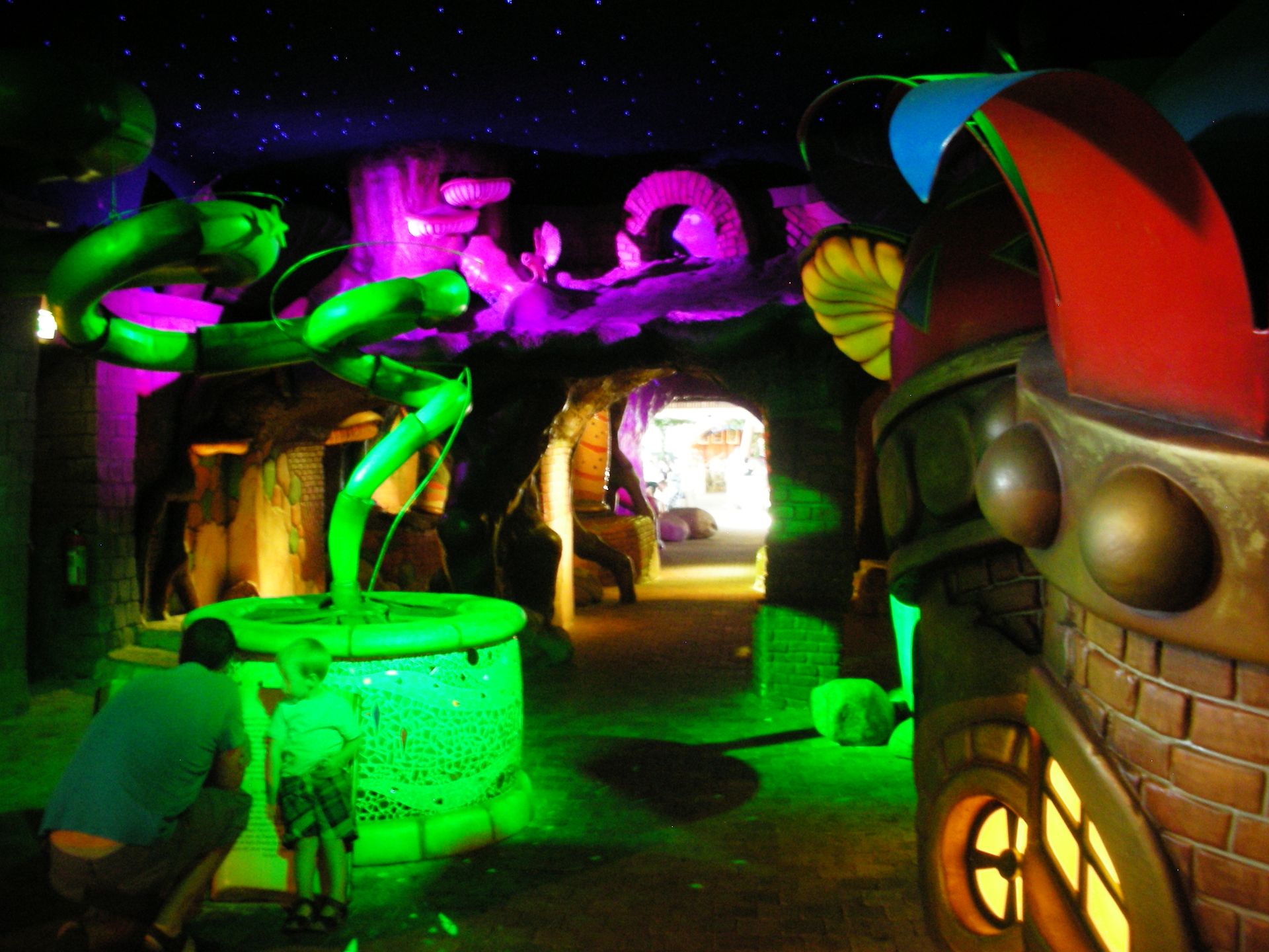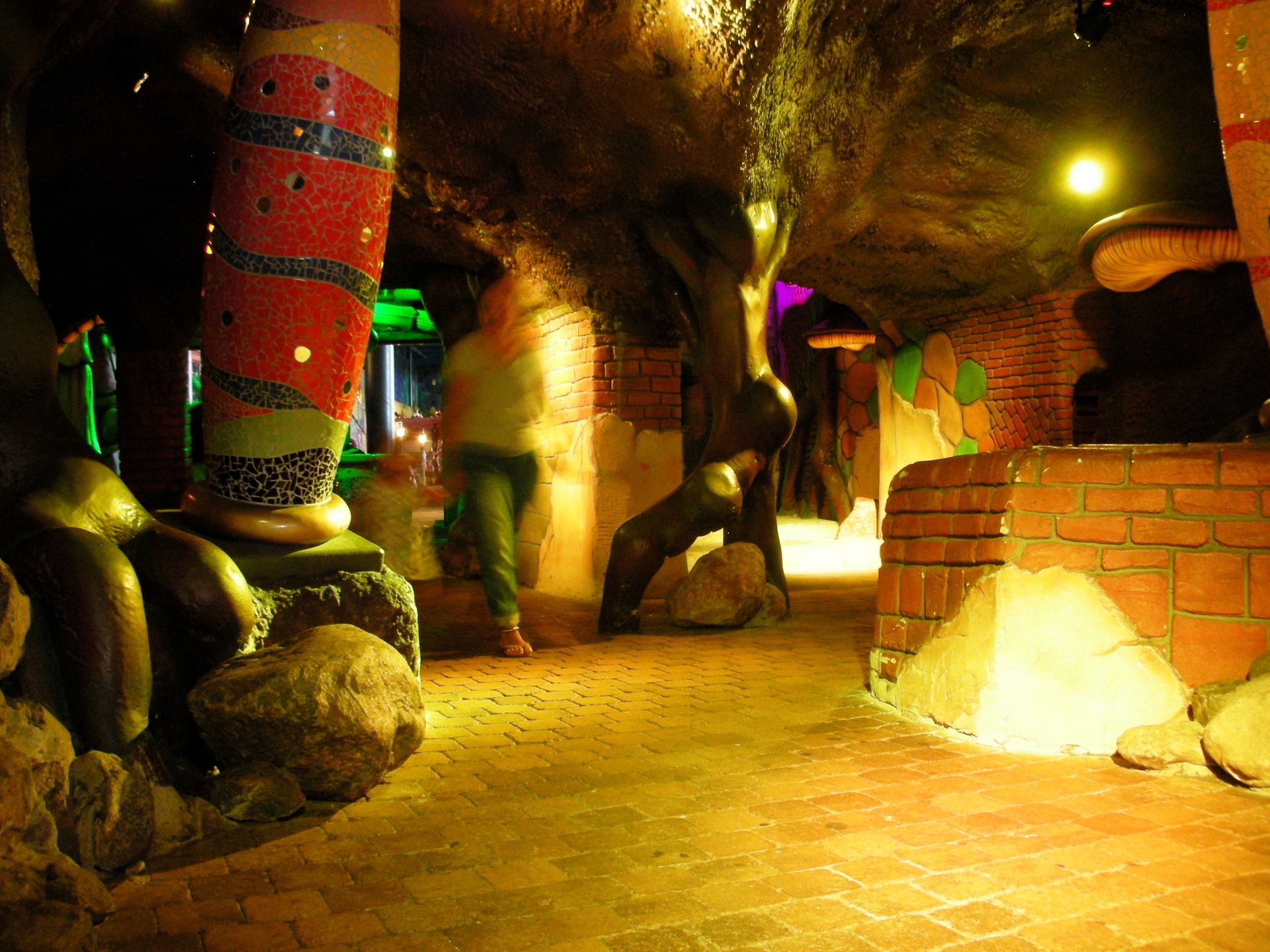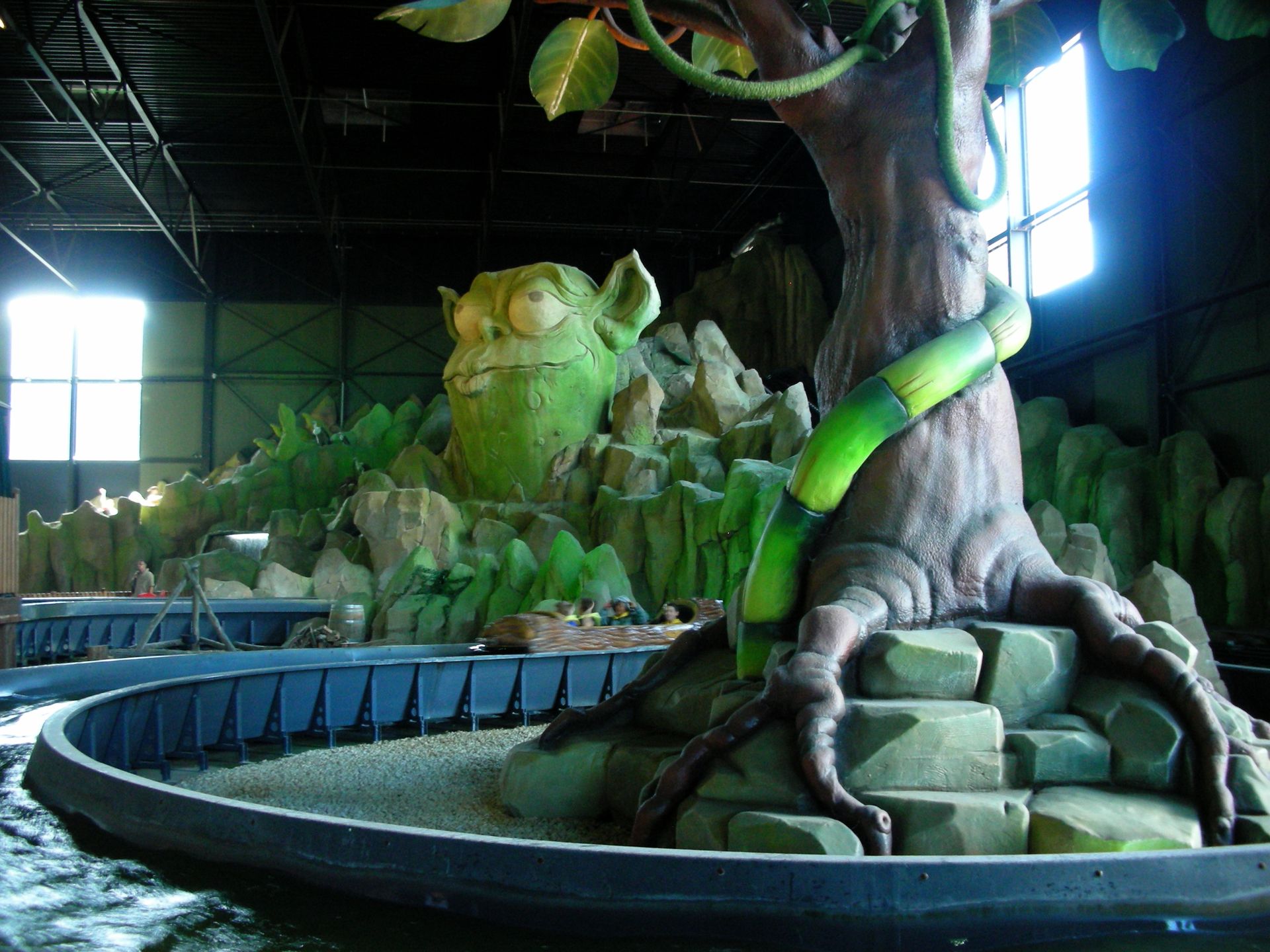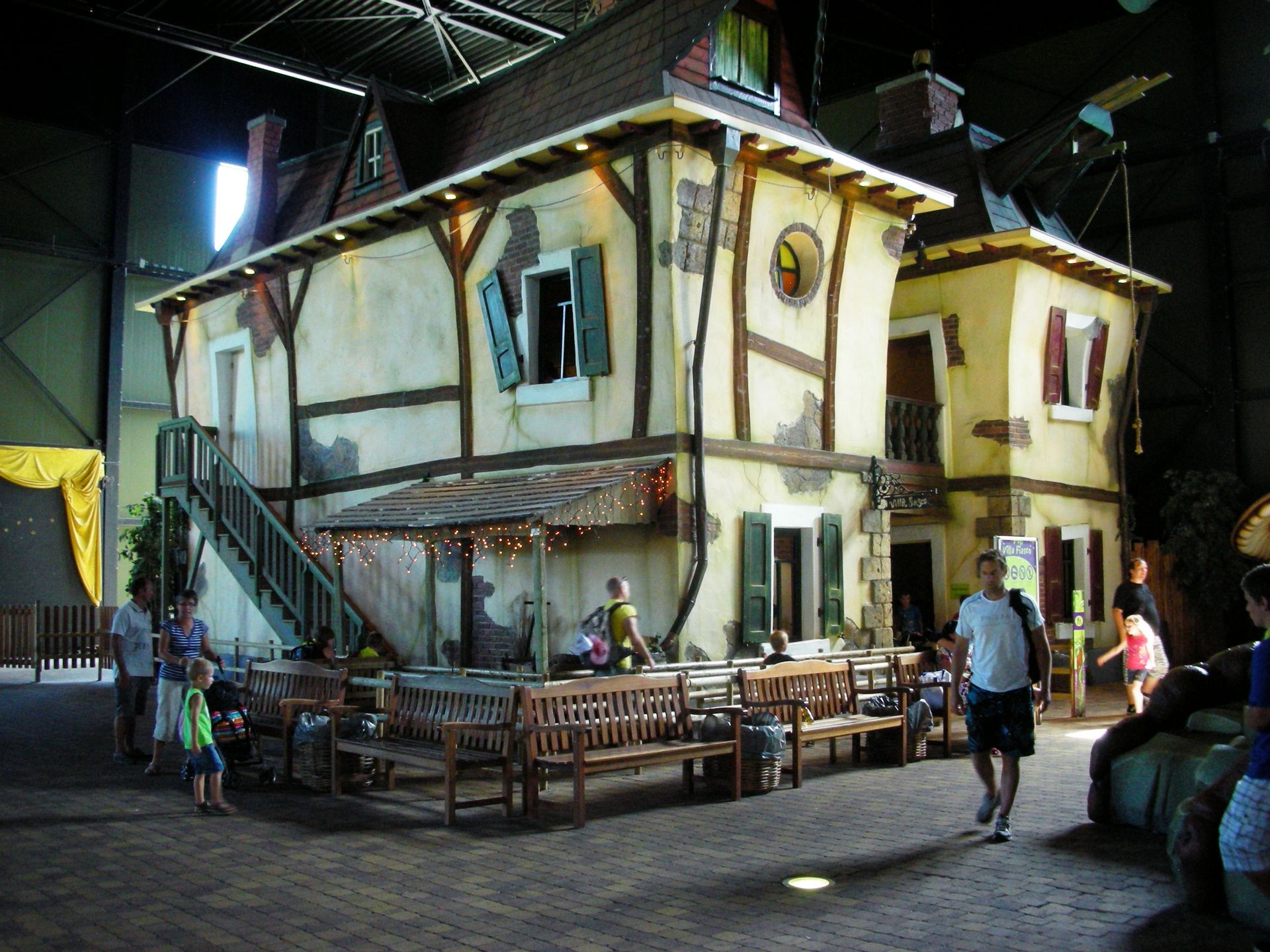 Weg von der Schlacht um Troja führten uns unsere Schritte zielsicher zur letzten außenvorstehenden Bahn im Toverland, der Wildwasserbahn Backstroke. Beginnend in der zweiten Halle dümpeln die Boote gemächlich den Wasserkanal entlang, ehe sie nach oben gezogen werden und die erste Abfahrt rückwärts absolvieren. Die kleine Besonderheit von Backstroke offenbart sich dann auf dem Weg zur großen Schussfahrt, während dem man in der Schräge des Lifts um 180° gedreht wird. Folglich darf man den Rest der Wildwasserbahn wieder vorwärts erleben, obgleich man daran kurz zweifelt, sobald sich im Inneren eines riesigen Baumstammes, der den Außenbereich des Toverlands schmückt, eine Drehplattform zu erkennen gibt. Aus diesem Baum stürzt man hinab ins tosende Nass, von dem wir allerdings nicht nennenswert viel zu spüren bekamen. Durch einige Kurven rudert man zurück in die Halle und damit auch unmittelbar zum Ausstieg. Sicherlich ist Backstroke nur eine unter vielen Wildwasserbahnen und hebt sich durch keine Eigenschaft nennenswert von der grauen Masse ab. Da sie aber durchgehend nett gestaltet ist und einfach ein wenig vom Charme des umliegenden Toverlands profitiert, ist sie durchaus eine Fahrt wert.