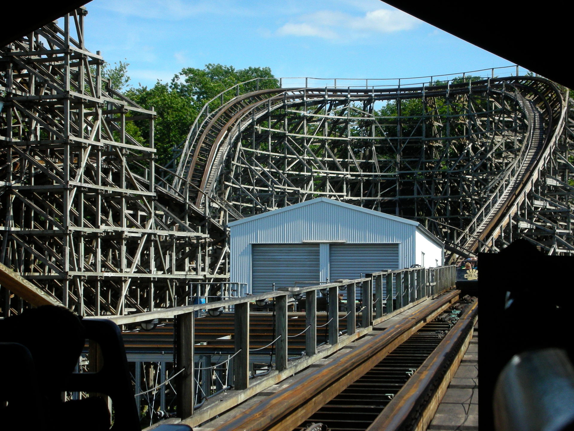 Bevor die Beschreibung der Fahrt in ein Kontinuum des Heulens übergeht, möchte ich direkt mein Resumé zu Bandit ziehen: Die Bahn hat eindeutig Schwächen, die nicht zu übersehen sind. Dazu gehört in jedem Fall das Rappeln, das zumindest auf den ersten beiden Drops grenzwertig ist. In den gemütlich durchfahrenen Kurven kann man schön beobachten, wie die Wagen vor einem abwechselnd links und rechts gegen die Schienen schlagen – das muss einfach gut fürs Material sein. Dennoch fand ich das Rappeln für einen Woody insgesamt angemessen, war es doch merklich schwächer als einige Tage zuvor noch auf Robin Hood. Somit kann ich nicht behaupten, dass das Umherspringen dem Fahrspaß einen Abbruch tut. Es ist schließlich ein Woody, da kann man auch mit einem Zwinkern drüber hinwegsehen!