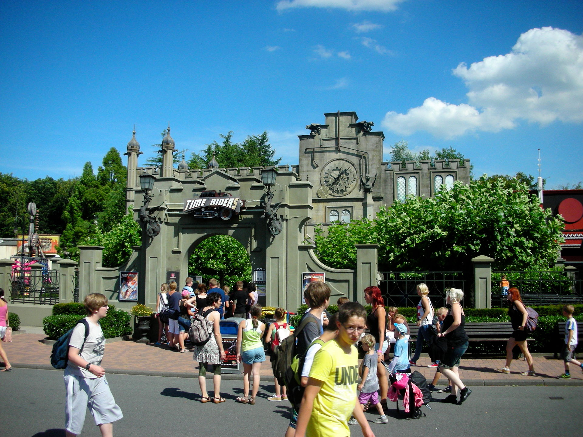 Parkplatz Toverland. Das Auto wird noch kurz gelüftet, um die angestaute Hitze loszuwerden. Ein Schluck Noname-Cola; das muss bis nach Deutschland reichen. Wir sind zeitlich in Verzug geraten. "Macht es dir etwas aus, wenn ich ein wenig schneller fahre?", hole ich mir deshalb die Erlaubnis ein. Rund 40 Minuten später treffen wir in Bottrop ein und suchen uns auf dem völlig überfüllten Parkplatz des Movie Park Germany eine freie Lücke. Im letzten Eck stelle ich dann endlich das Auto ab und wir steigen aus. Schnell wird noch das Nötigste in einen Rucksack geworfen: Eine Flasche Wasser und die Gutscheine für den Eintritt, das muss reichen. Von überall her hören wir gedämpfte Schreie und ein beständiges Tosen. Guter Dinge treten wir die Weltreise zum Haupteingang an.