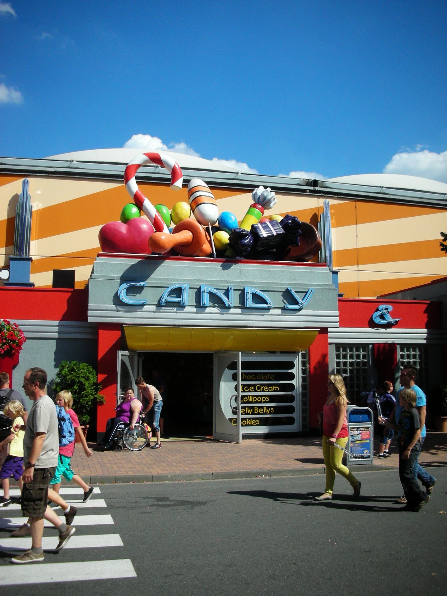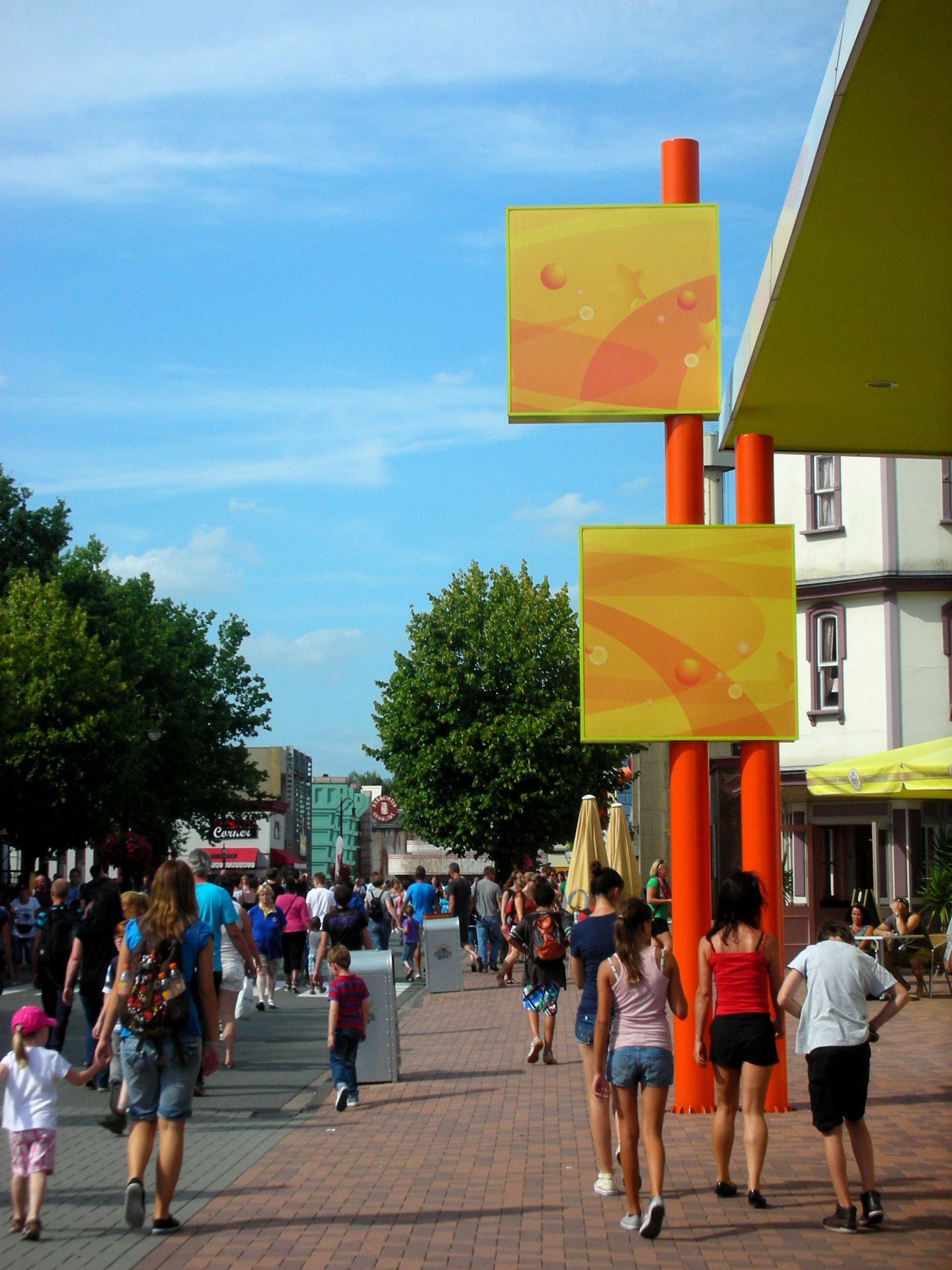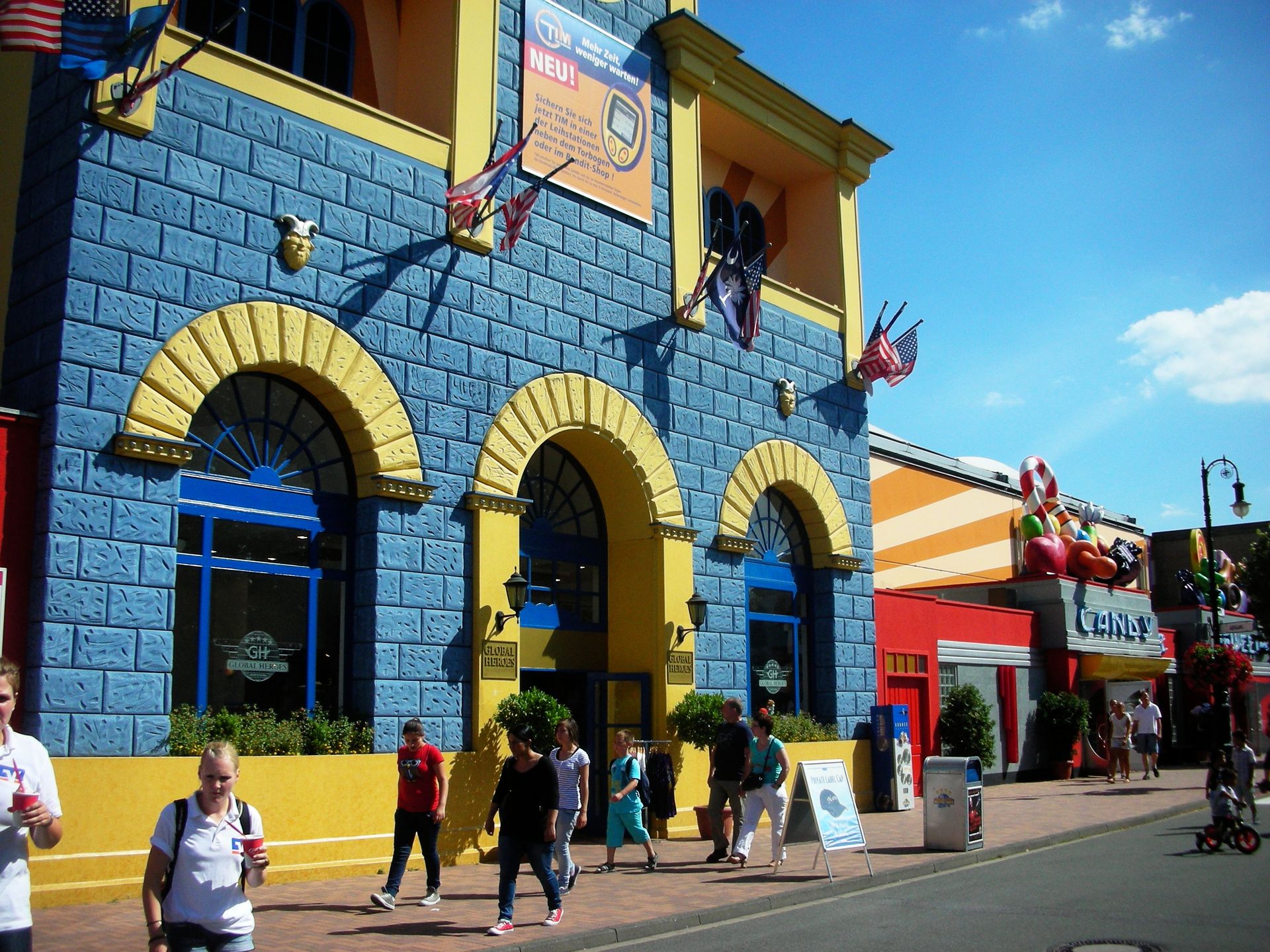Gerstlauer nämlich inzwischen wieder auf Vordermann gebracht. Um die Wartezeit zu überbrücken, schlage ich vor, als nächstes zum Nickland aufzubrechen, wo es für mich drei kleine Counts zu holen gab. Unser Weg führt uns durch die farbenfrohen Gebäude des Hollywood Street Sets, in denen ich mich ein klein wenig verliere – so schön bunt und alles wirkt, als hätte man jeden einzelnen Ziegelstein mit Zucker glasiert. Während ich die Main Street ein wenig bestaune, nähern wir uns jedoch zunehmend dem Nickland, in dem leider ein gänzlich anderer Ton angeschlagen wird: Über der durchbetonierten, teilweise gepflasterten Ebene ragen kahle Stahlkonstruktionen und skurrile Gebilde empor. Sofort werden Assoziationen an geschmolzene Legosteine wachgerufen, die sich wohl in einer ganz ähnlichen Art zu Thematisierung verklumpen würden. Das Resultat ist mir schlichtweg zuwider.