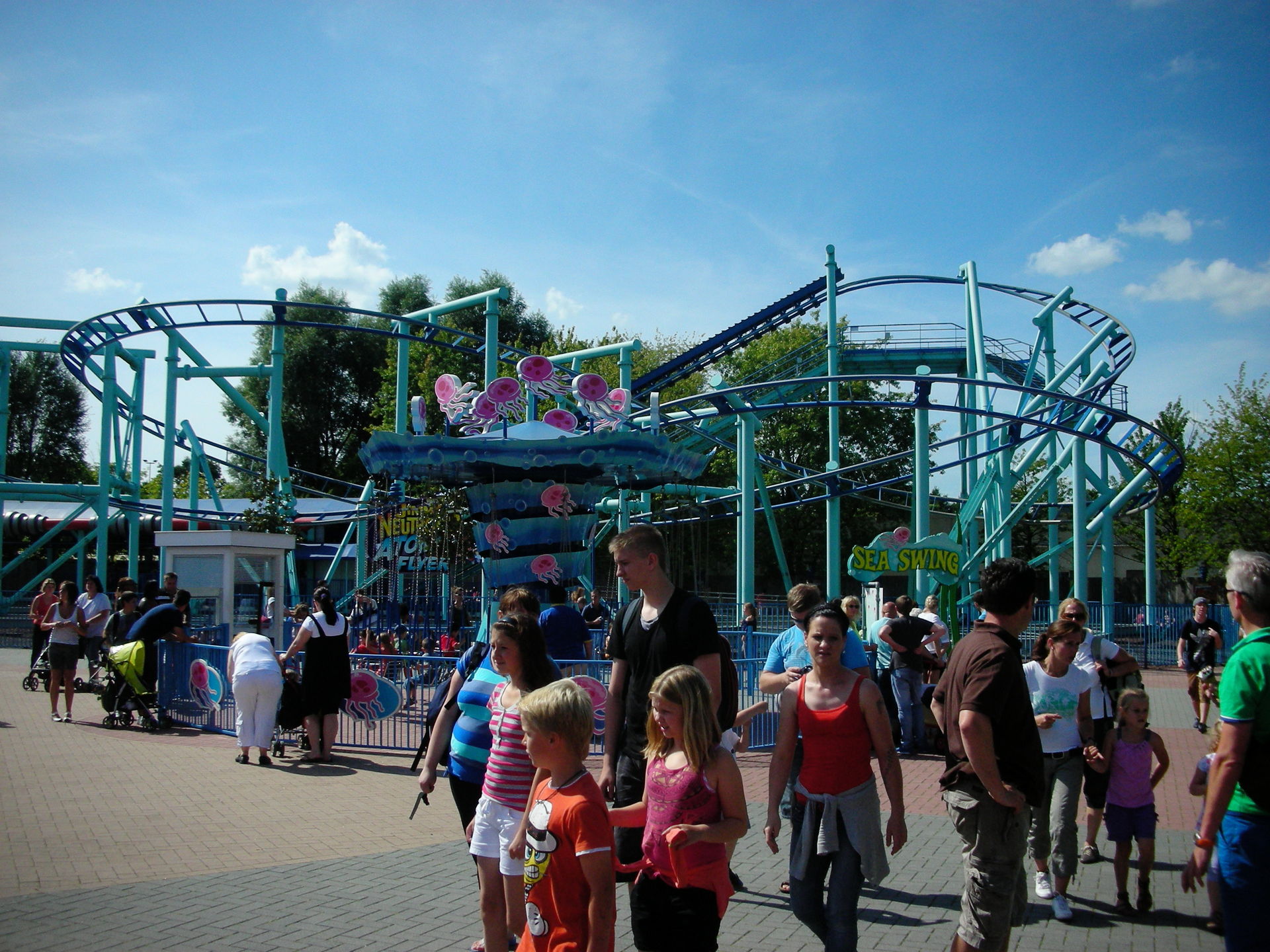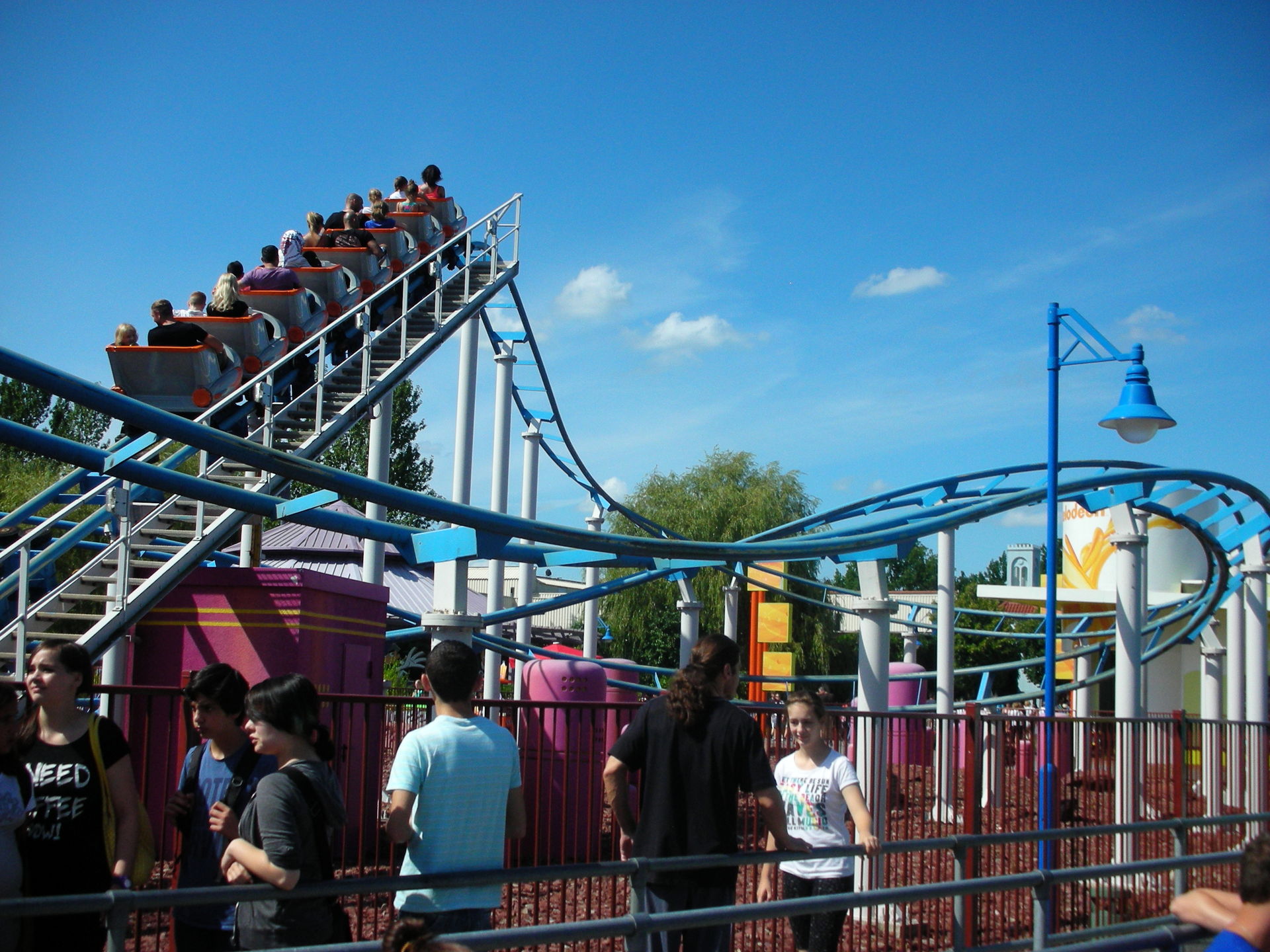 Ein wenig verspätet und lädiert humpel ich zum abgemachten Treffpunkt zurück, womit wir dann auch vollständig versammelt sind. Wir haben noch einige Minuten über und so gehen wir den Weg ins Nickland etwas gemütlicher an, schließlich ist inzwischen abzusehen, dass wir neben dem Hakensammeln auch noch einige andere Bahnen und Wiederholungsfahrten im Movie Park erleben werden. Am Gate zu Jimmy Neutron's Atomic Flyer – meinem ersten