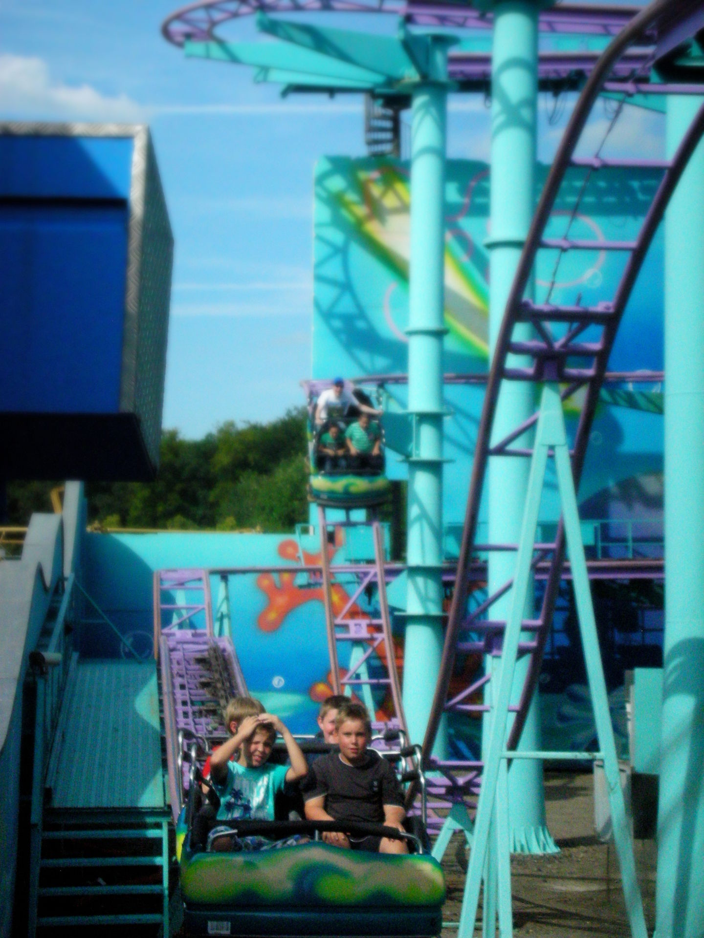 Vekoma die Peitsche und wir alle wissen nur zu gut, wie sich das anfühlt. Wie nach jeder Fahrt auf einem SLC verlässt man die Schlussbremse mit einem eigenartigen Gemisch aus Erleichterung und existenzieller Infragestellung des Selbst und der Gründe, die einen dazu treiben, immer wieder in diese Schleudern einzusteigen. Das Ding ist im Kasten und heilfroh knipse ich noch ein paar Bilder, die zu einem unvernünftig hohen Anteil aus Schiene bestehen.