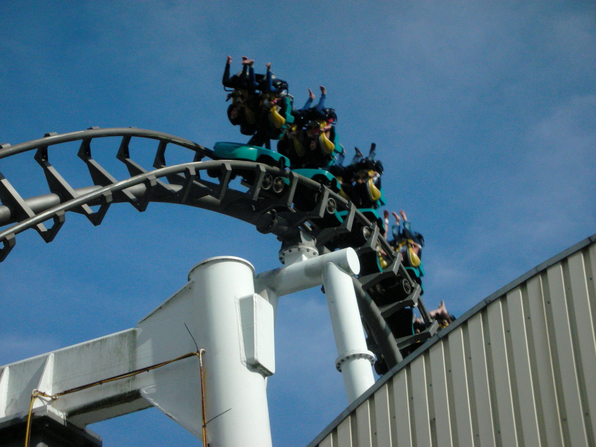 First Drop inspiziere ich kurz die allgemeine Lage im Zug: Hm, nicht sonderlich viel Polsterung. Das wird schon werden. Die ersten Reihen neigen sich dem Abgrund entgegen und ziehen den gesamten Zug in die Tiefe. Es vibriert, schüttelt und tanzt das ganze Gefährt, die gesamte Umwelt erscheint auf einmal verwaschen, es tost und ächzt, bis wir plötzlich wieder stark an Geschwindigkeit verlieren. Die erste Kurve wäre also erreicht. Entgegen vieler Meinungen muss ich gestehen, dass das Pacing hier nicht gnadenlos daneben war. Vielleicht lag es einfach an der unerbitterlichen Augustsonne, aber ich hatte den Eindruck, dass die hohen Kurven zwar zögerlich, aber noch immer angemessen schnell durchfahren wurden. Der zweite Drop schließt sich an und die Prügelei beginnt aufs Neue.