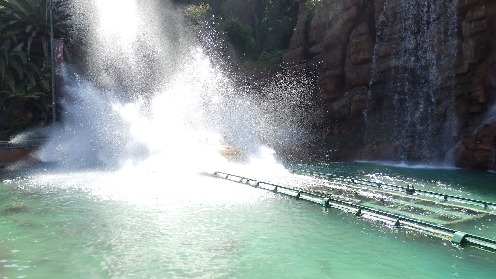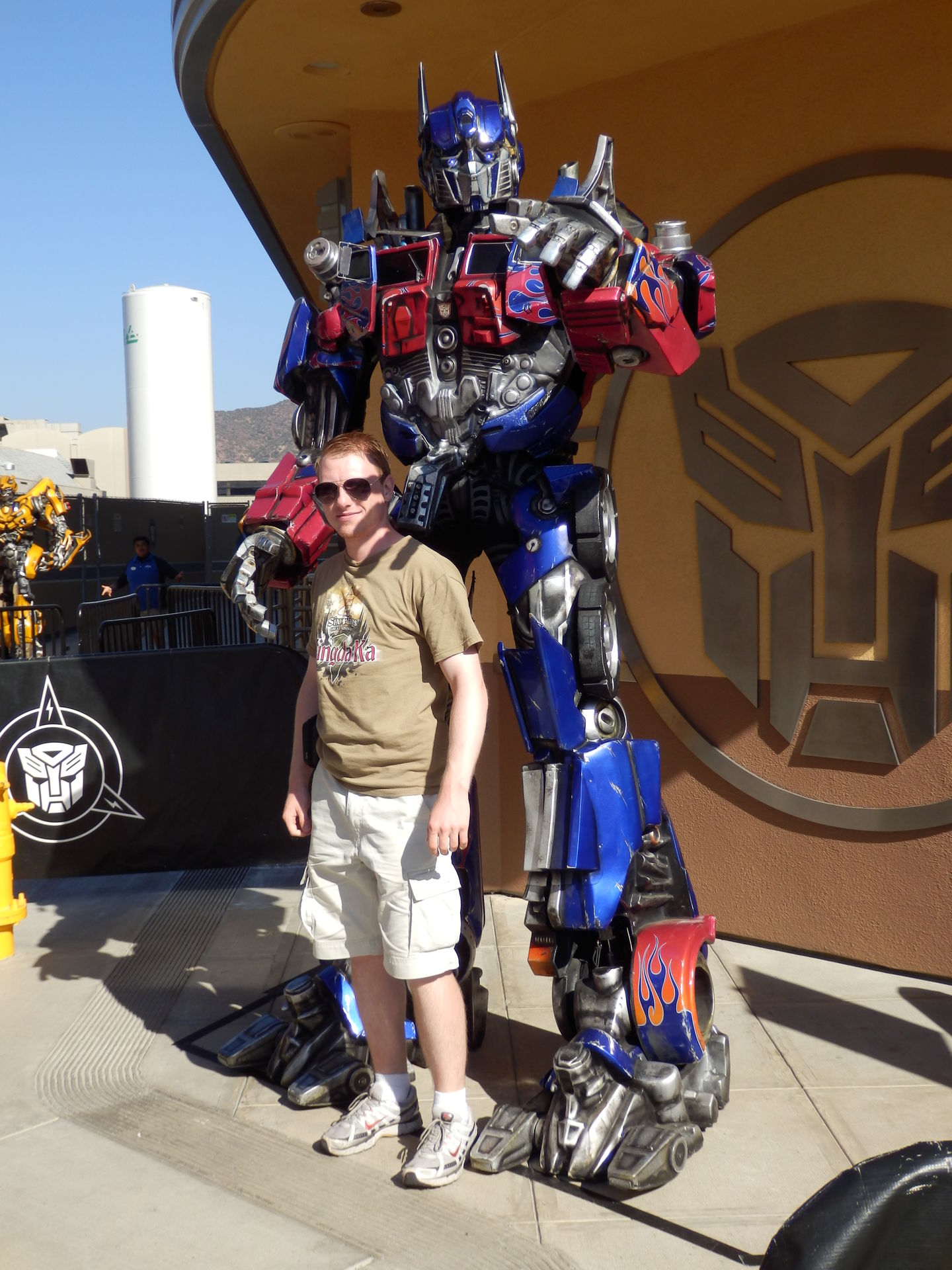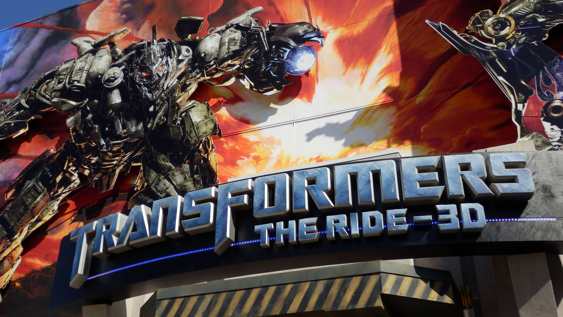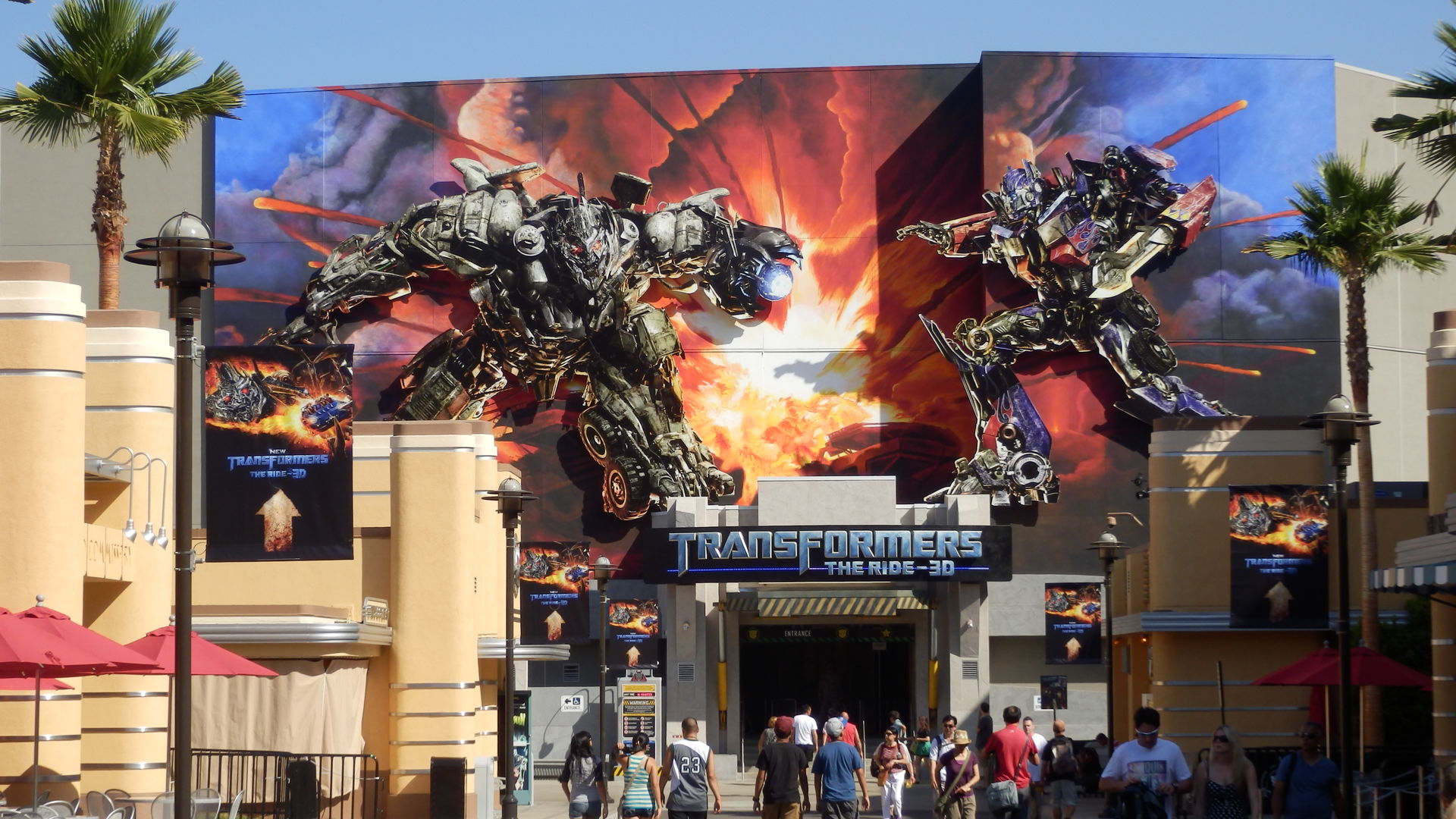 Anders verhält es sich mit Jurassic Park. Hier ist die Anlage in Florida zweiter Sieger. Vor allem das T-Rex-Finale ist an der Westküste deutlich beeindruckender, denn das Viech kommt einem bedrohlich näher. Dem Saurier kann man zwar noch entkommen, nicht aber dem Splashdown. Entgingen wir in Orlando noch den gröbsten Spritzern, so besitzt Hollywood doch den größeren Soak-Faktor. Außerdem gibt es hier im Lower Lot noch etwas, womit es kein Ride in Florida und schon gar nicht der für mich vor 8 Jahren maßstabsetzende Spiderman aufnehmen kann. Die Rede ist natürlich von Tranformers The Ride. Vor einem halben Jahr hätte ich noch gesagt, dass die Fahrt nur minimal besser ist als Curse of DarKastle in Busch Gardens Europe aber je weiter der Besuch in die Ferne rückt, desto größer wird die Kluft zwischen diesen beiden Ausnahmesimulationen. Optimus Prime und Co. liegen dabei natürlich nicht nur vorne sondern sind zumindest in meiner Erinnerung mittlerweile buchstäblich in außerirdische Sphären vorgestoßen. Ich kann mir nicht vorstellen wie viel realistischer ein solcher Ride noch werden kann. Transformers kratzt in meinen Augen bereits an der Grenze des Machbaren und versteht es besser als alles andere die Linie zwischen Fiktion und Realität zu verwischen.