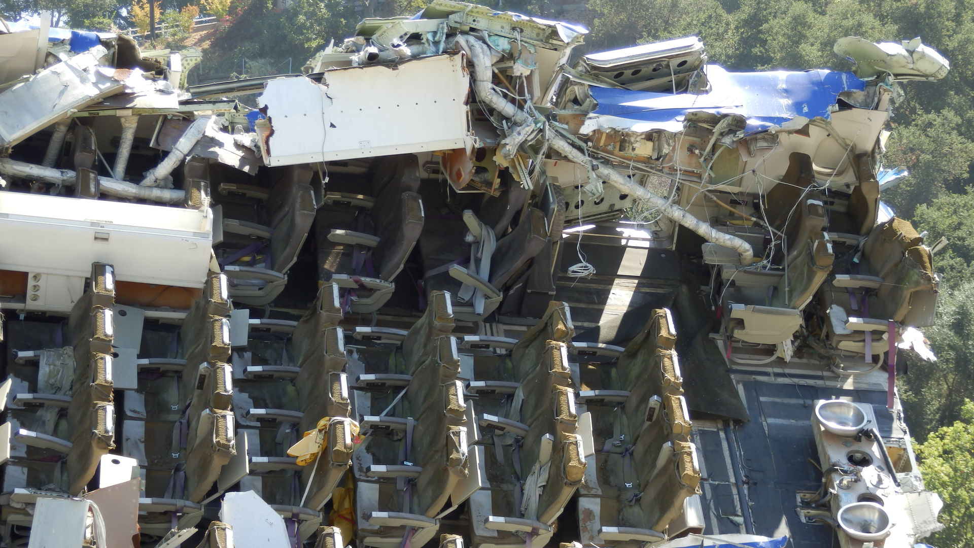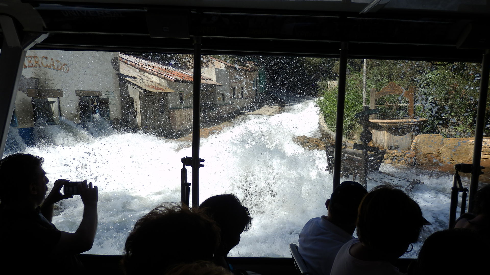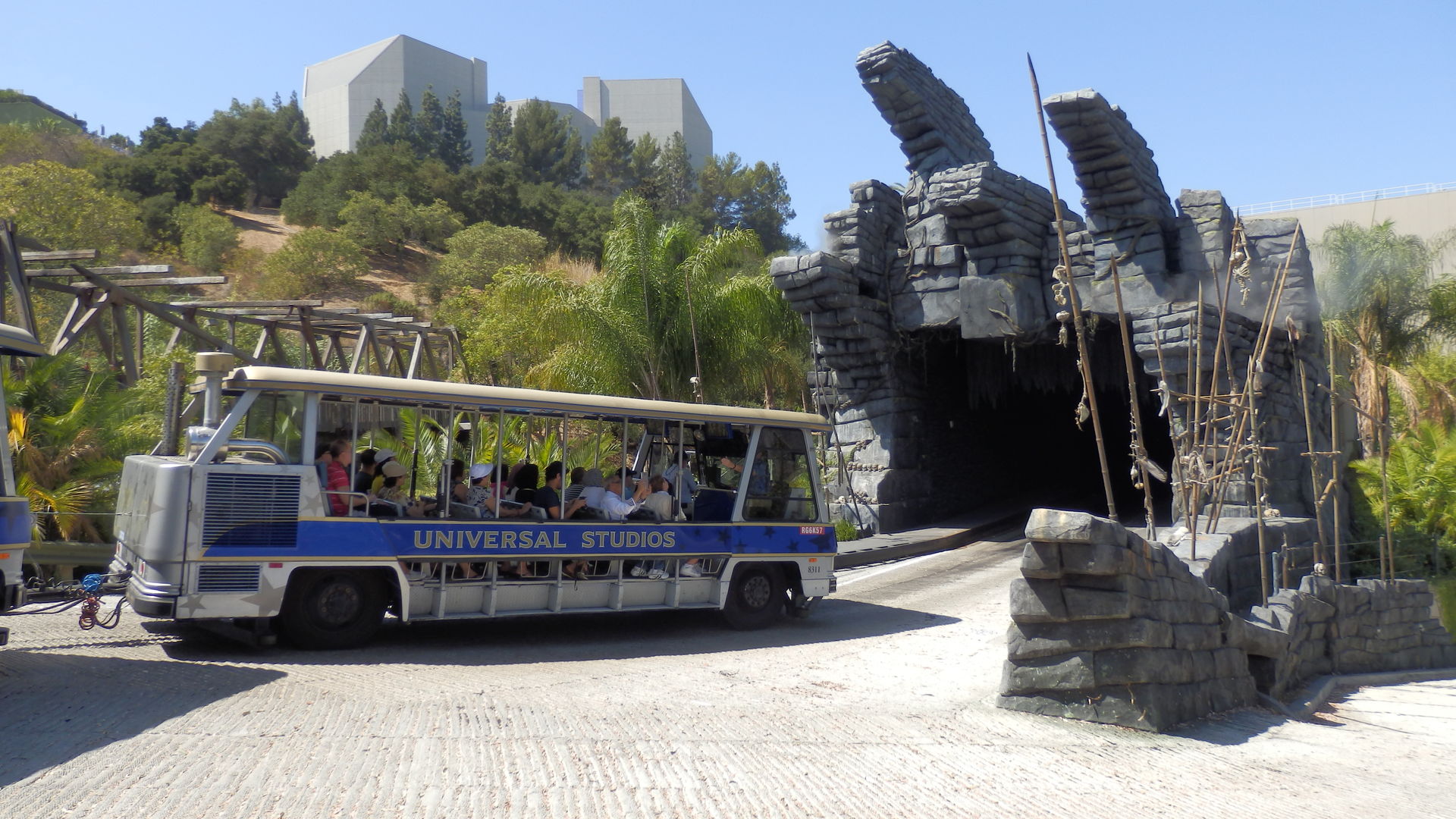 Über die bereits erwähnten (Roll)treppen geht es wieder hinauf zum Upper Lot. Unterwegs bietet sich eine kleine Rast mit weitreichendem Blick auf die Warner Bros. und Disney Studios an. 1,5 Stunden später - so lange muss man nämlich dafür warten - sitzt man in der Hauptattraktion der Universal Studios, der Studio Tour. Im Wesentlichen sieht das so aus: Gigantische Menschenmassen werden durch den Hinterhof einer Firma kutschiert, in dem ihnen die Unwirklichkeit des Films und ihre eigene Leichtgläubigkeit auf - bis auf wenige Ausnahmen - höchst unspektakuläre Art und Weise unter die Nase gehalten wird. Klartext: Die Wisteria Lane ist eine kleine Seitenstraße mit vor sich hin modernden Holzhäusern, das Set von King Kong passt in ein Kinderzimmer und der "Central Park" in meinen Garten. Das kann einen faszinieren oder auch enttäuschen. Mir persönlich kam es so vor als ob Hollywood einen verarschen will. Auf der anderen Seite gibt es aber auch Dinge, die einen wirklich beeindrucken. Mein persönliches Highlight: Das Set von Krieg der Welten. Steven Spielberg hat dafür nicht nur ein ausrangiertes Passagierflugzeug gekauft sondern es auch für ein vielfaches, ich glaube es waren 140.000$, hierher transportieren, ausschlachten und auseinandernehmen lassen. Ebenfalls interessant ist der gigantische Greenscreen vor einem Becken, das mit mehreren tausend Litern Wasser gefüllt werden kann um so Szenen auf dem Ozean zu simulieren. Wasser steht auch im Mittelpunkt wenn die Tour plötzlich in einer U-Bahn Station Halt macht und diese kurz darauf zu beben beginnt, auseinanderfällt und zu guter letzt auch noch geflutet wird. Wer bei der Tour keinen Außenplatz bekommen hat, hat übrigens die A-Karte gezogen. Das wird spätestens hier klar. Kleiner Tip: Unbedingt auf der linken Seite sitzen.