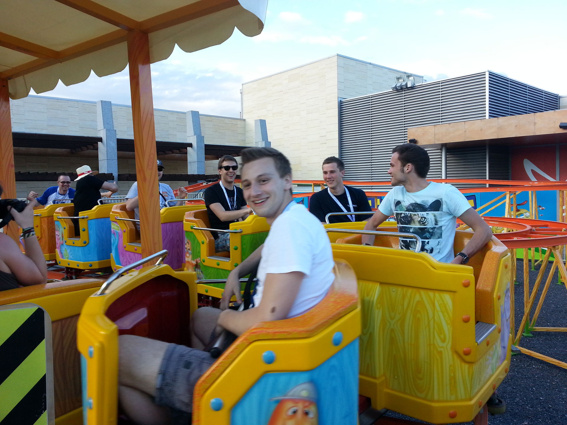 Nun gut, nach dem Aufstehen und kurzer Vorbereitung trafen wir uns am Eingang vom Hostel, um gemeinsam mit den öffentlichen zum Park zu fahren. Angekommen haben wir kurz eingecheckt, und sind gemeinsam zum Minetrain "TNT" gegangen. Nach der Fahrt haben wir natürlich direkt den OP vom Kiddy-Coaster gegenüber gefragt ob wir da rein können. Mit Verständigung über Zeichensprache (Da kann Volker noch vom Vorabend nette Geschichten erzählen