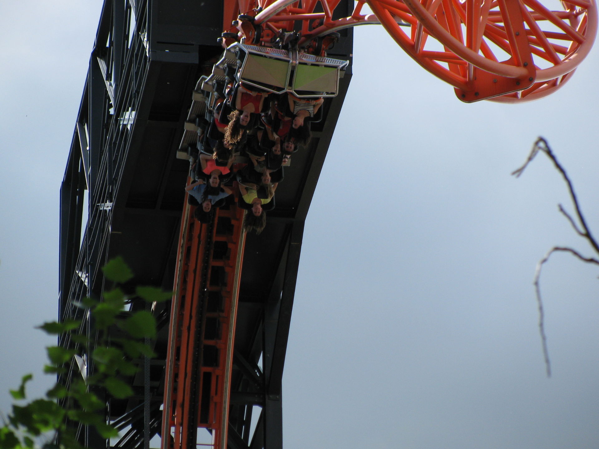 Intamin Inverter "Tornado", welcher Nina's Nummer 800 werden sollte. Also allesamt hin, und einen Zug füllen .. nein Moment, erst wird von den OPs ein auf der vorherigen Fahrt vollgekotzter Sitz gereinigt, geschätzte 15 Minuten lang. Die Sitzreihe #3 (welche den Sitz beherbergt) fuhr die nächste Runde ohne Passagiere. Ich habe mir einen Platz weit hinten geschnappt. Klasse Bahn, für die ich mich direkt ein zweites mal angestellt habe, um die Frontrow zu fahren. Hier kam die Ernüchterung .. die Bahn fährt nur komplett voll! Sind nur 23 der benötigten 24 Leute da wird halt gewartet .. somit bestand für meine zweite Fahrt eine Wartezeit von 30 Minuten, da es an Fahrgästen mangelte.. Hab ich auch noch nicht erlebt sowas ..