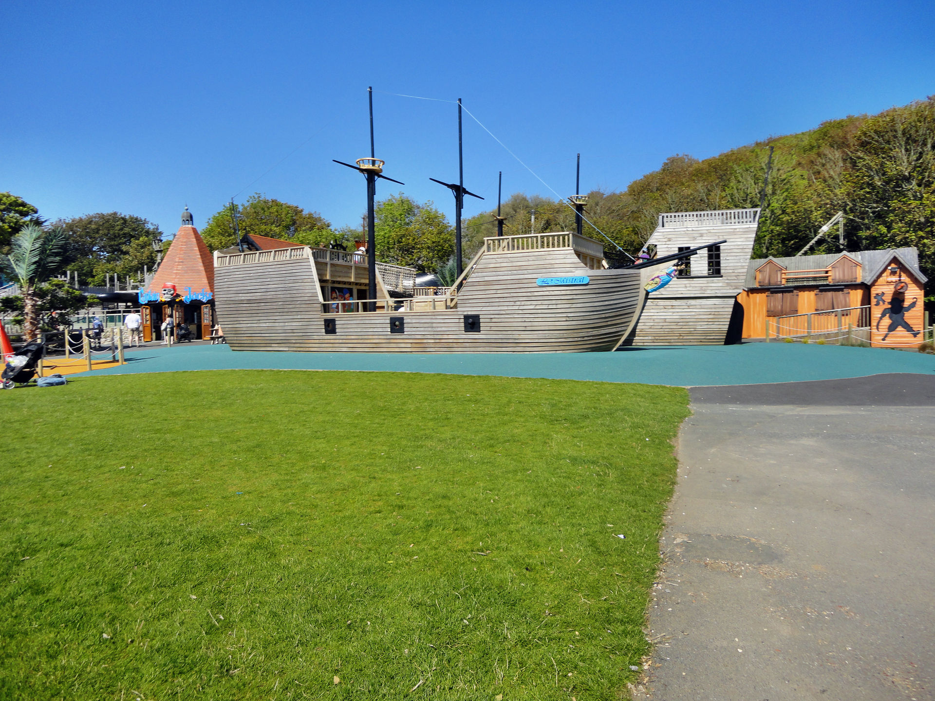 Auf der Ebene des Einstiegs gelangt man zum „Themenbereich“ Pirate Cove. Dieses Piratenland ist recht neu. Hier findet man eine große Spielstruktur und Außenrum einige Holzhäuser. Hier sind Imbisse, Spielautomaten aber auch Funhaus Elemente (wie z.B. rollende Tonnen) untergebracht.