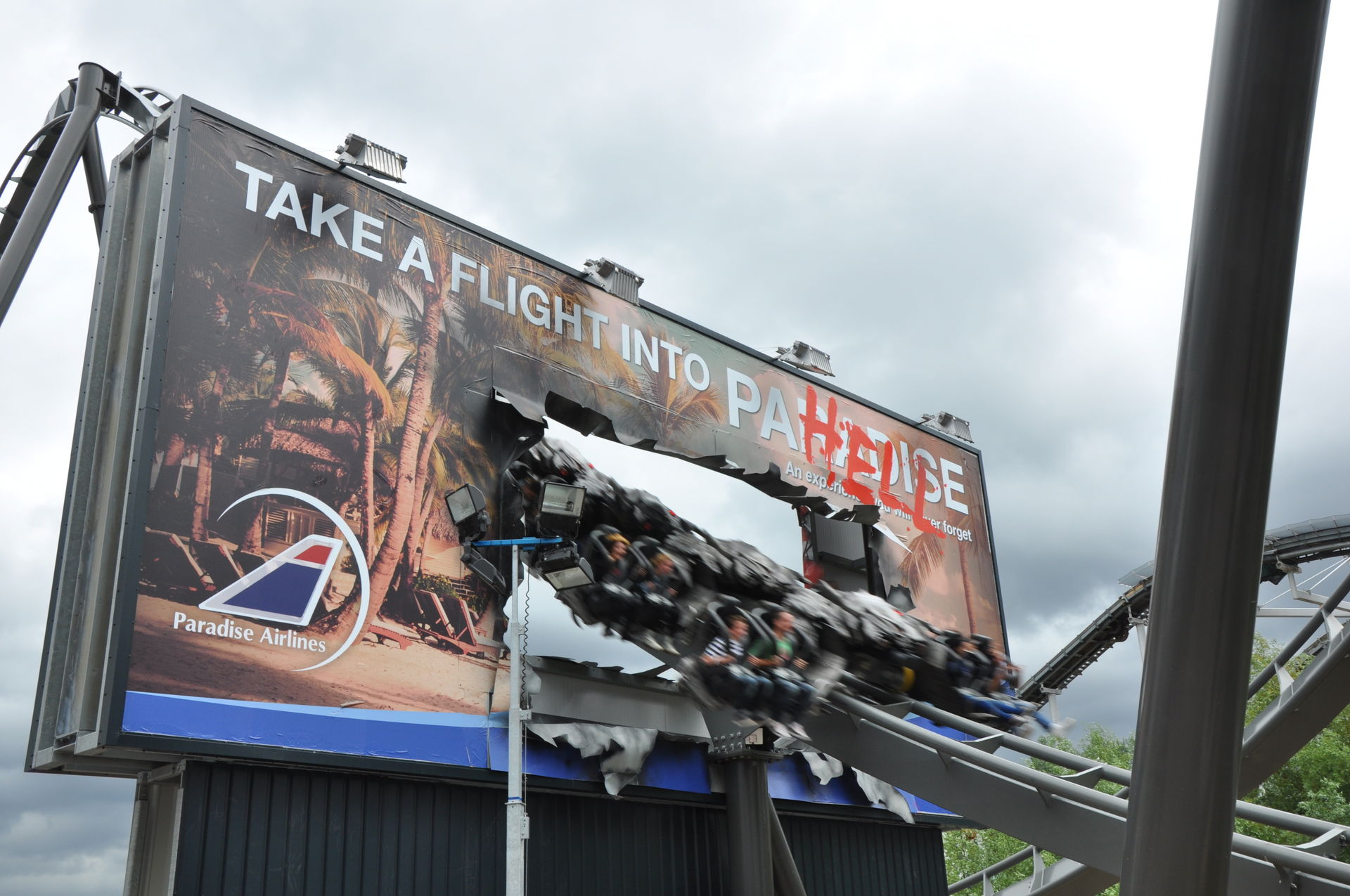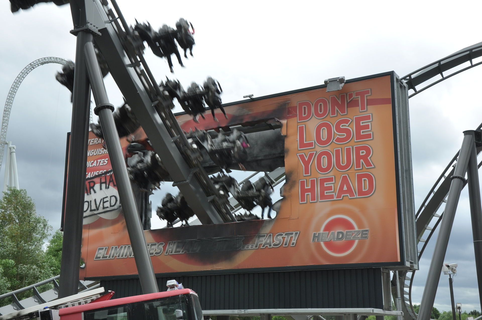 Wingcoaster sind schon ein tolles Konzept. Danach ging es zu unserer Lieblingsbahn im Park, Stealth. Hier betrug die Wartezeit schon 45 Minuten. Während wir warteten wurde erst der zweite Zug eingesetzt. Was viel schlimmer ist, die Fahrt war sehr unruhig. Dazu kommt, dass ich wohl etwas zugenommen habe, und der Bügel sehr schmerzhaft auf den Bauch gedrückt hat. So bringt uns achterbahnfahren keinen Spaß. Dann doch lieber Nemesis Inferno. Seit Swarm sind hier die Wartezeiten gesunken. Am Nachmittag gab es dann noch eine Fotostrecke und eine Fahrt bei Swarm.