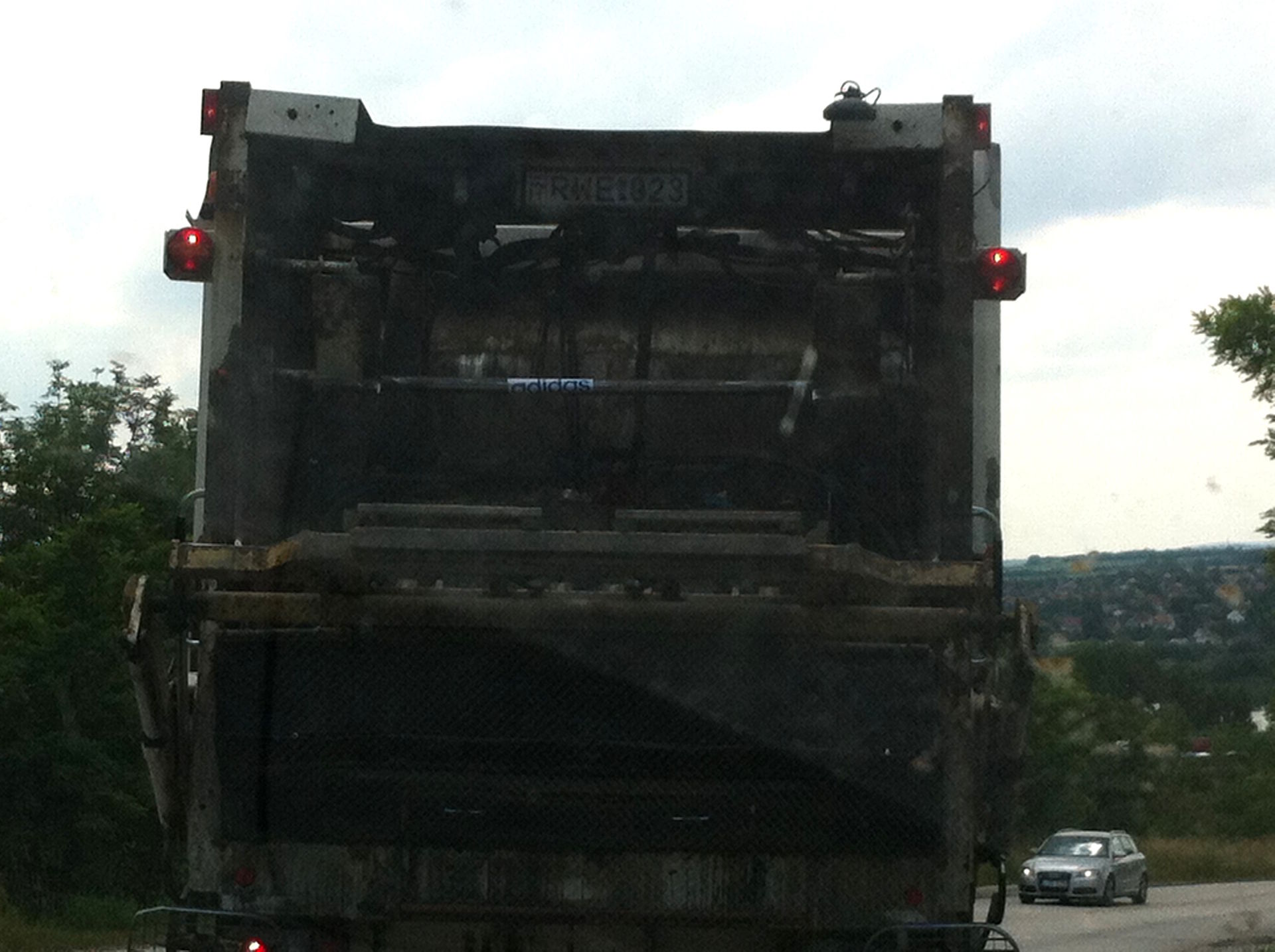 Dann wurden wir noch permanent von irgendwelchen Fahrzeugen blockiert, die bei uns niemals fahren dürften. Allein schon wegen dem Smog, der da aus dem Auspuff kommt. Ich frage mich ja, wieso Adidas auf der Müllabfuhr steht!