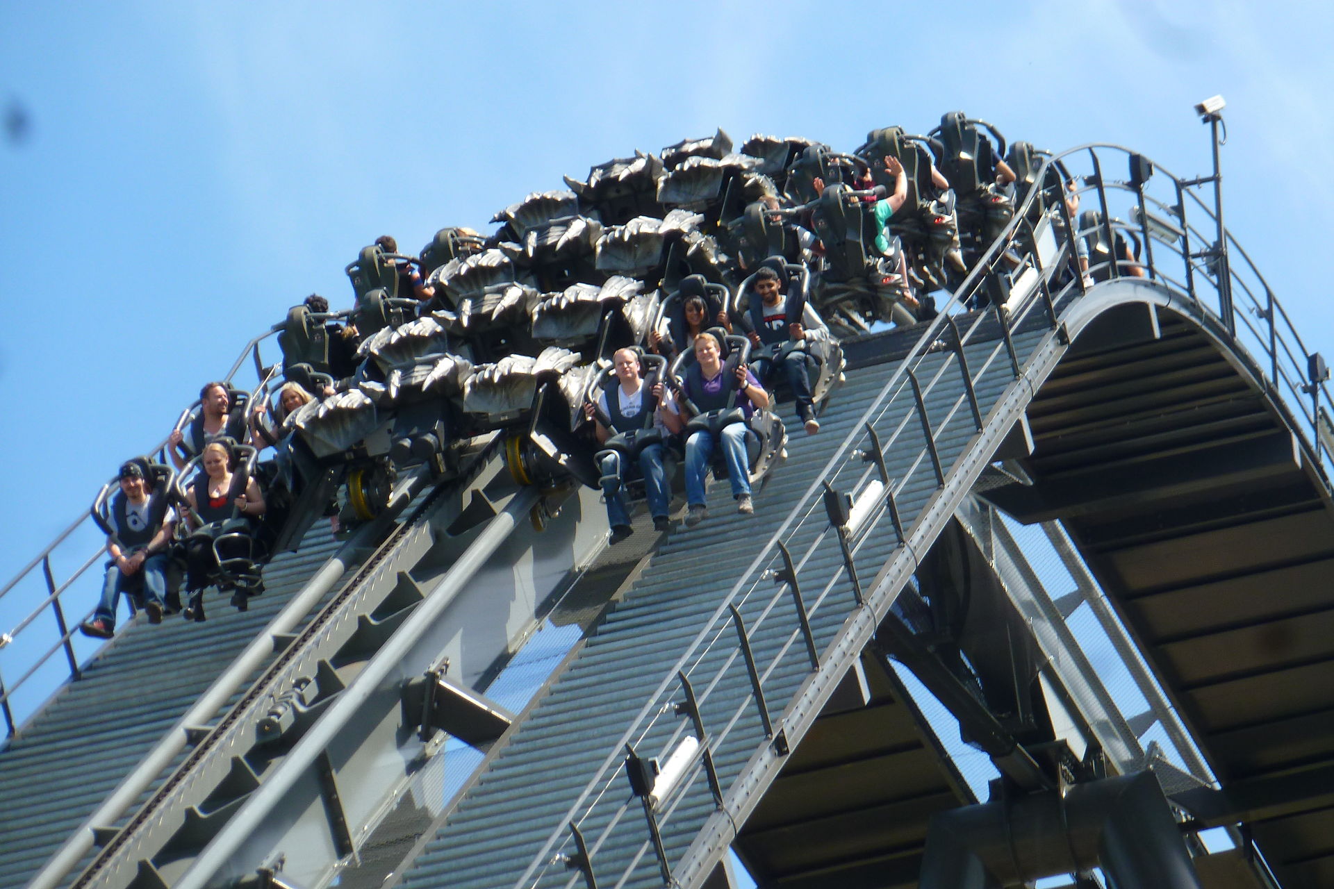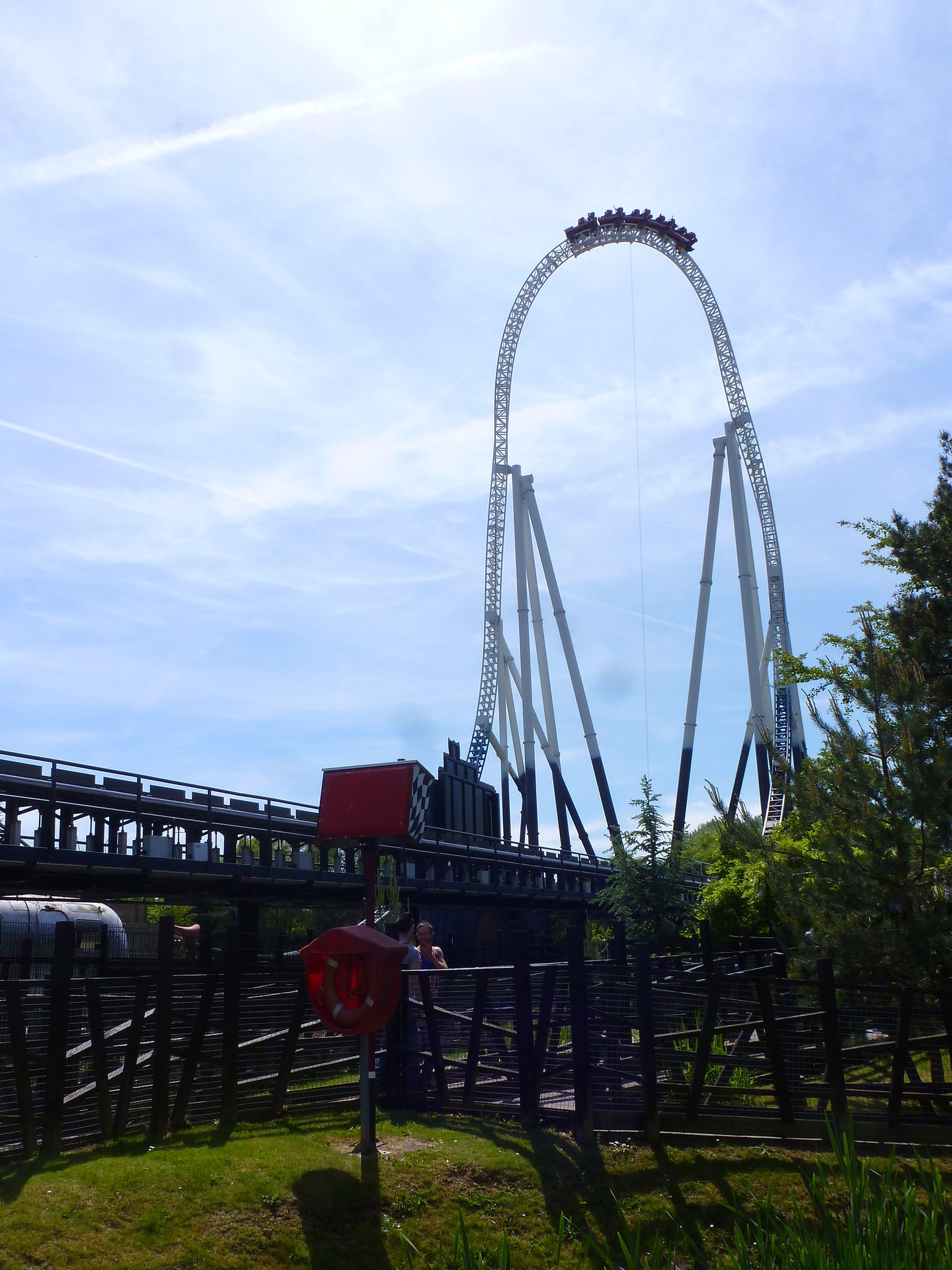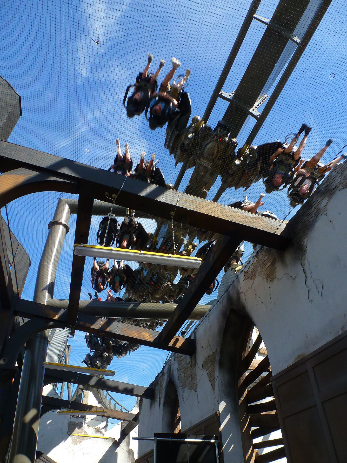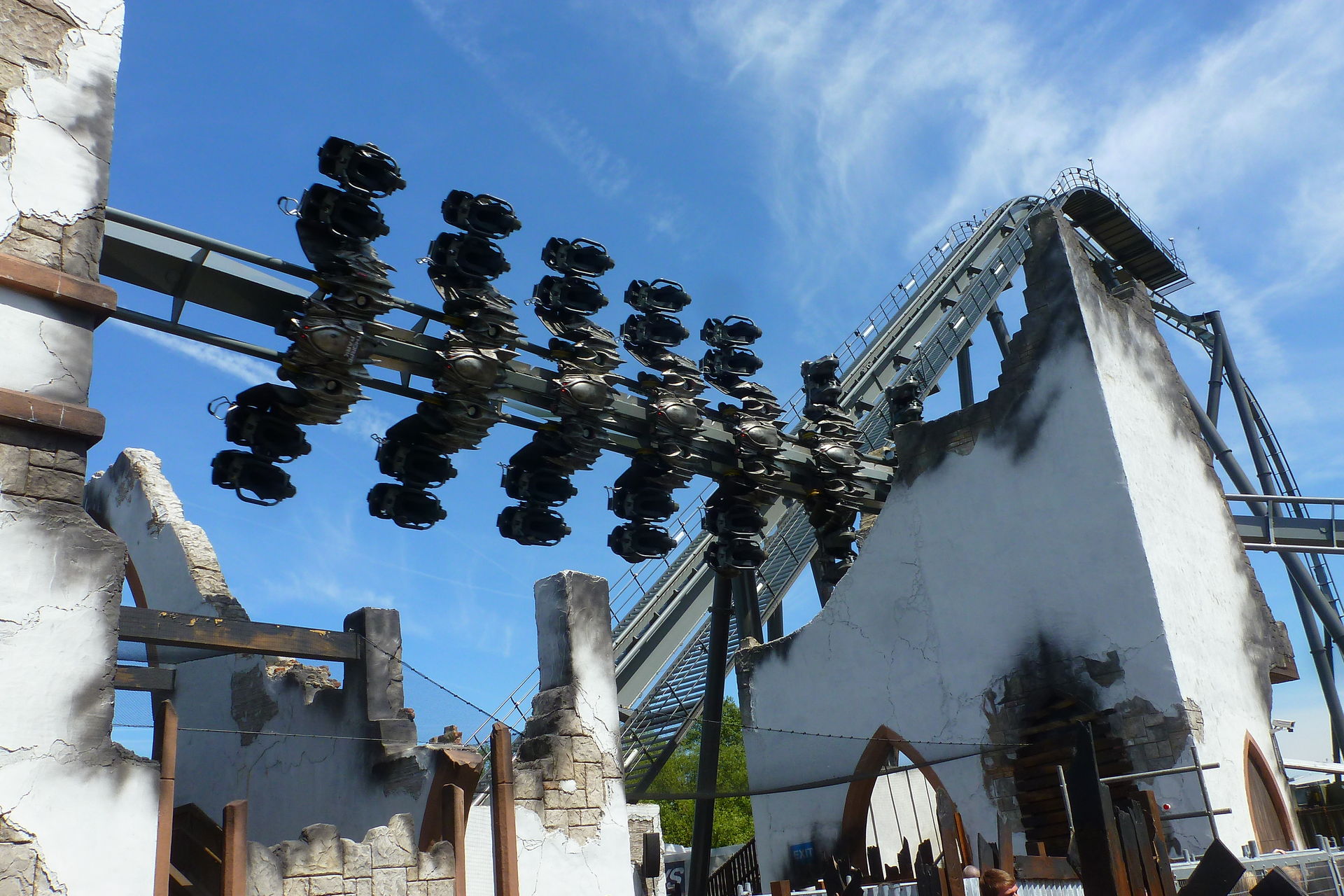 Die erste Fahrt gab es dann auch gleich in der ersten Reihe. Die Lösung mit den Westen ist schon sehr genial und macht die Überkopffahrt direkt am Anfang auch sehr angenehm. Es sieht vor allem sehr krass aus, wenn man oben ankommt und die Welt erst mal auf den Kopf gestellt wird. Die zweite Fahrt des gabs dann auch in der letzten Reihe – rückwärts. Gerade der „First-Half-