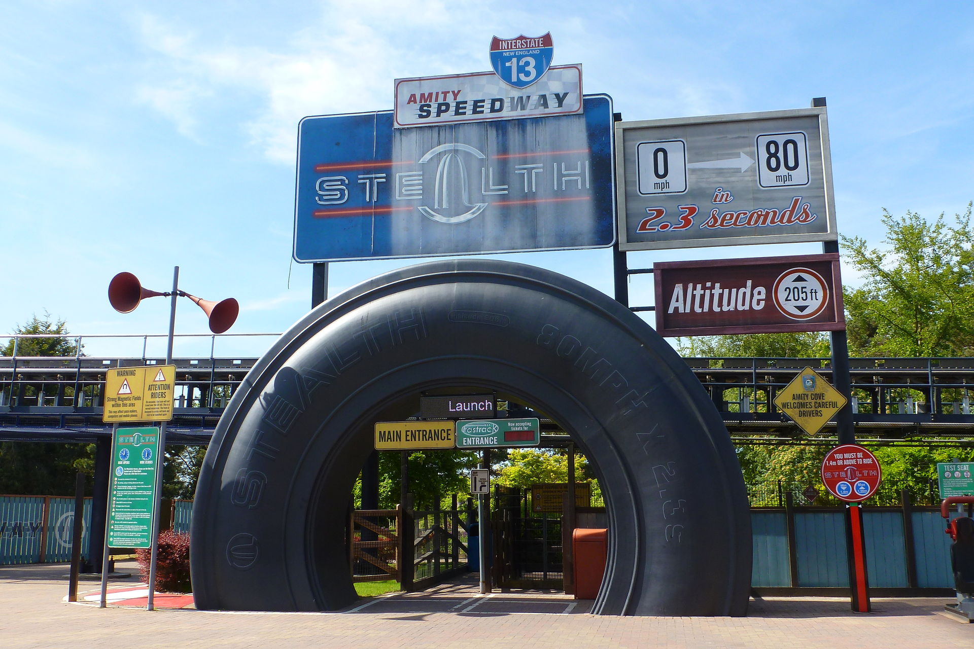 Bevor der große Besucheransturm kommt, wollten wir gleich das neue Highlight „The swarm“ ausprobieren, aber als wir dort ankamen, waren bereits 80 min Wartezeit angeschrieben. Leider befand sich auch nur 1 Zug auf der Strecke. Somit ging es erst mal wieder zurück und es trieb uns zu „Stealth“. Dort war zwar auch 60 min angeschrieben, aber die Warteschlange war sehr gering und keine 10-15 min später saßen wir im Zug.