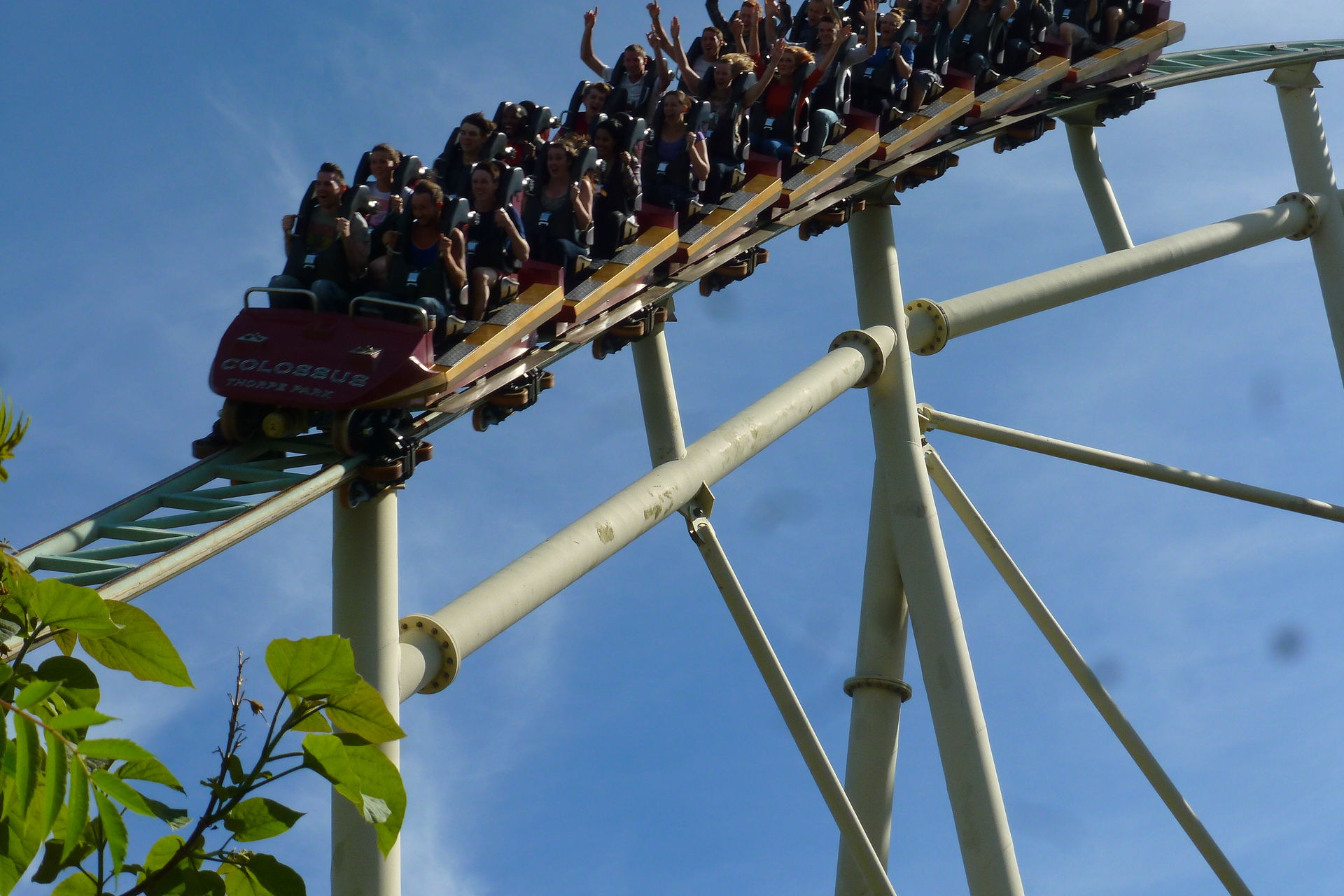 Also zurück zu Collossus. Nach 10 min Wartezeit kam dann eine Durchsage, dass ein zweiter Zug in Betrieb genommen wird. Somit fuhr erst mal keine Bahn und danach wurden die Züge leer über die Strecke geschickt, da der neue Zug erst 3 Runden ohne Passagiere absolvieren musste. Trotzdem haben wir am Ende dann „nur“ 50 min gewartet. Wir saßen bei der ersten Fahrt im zweiten Wagen und leider hatte ich meinen Foto in meine Hosentasche gesteckt gehabt und irgendwie rutschte er beim Einsteigen nach oben und lag nun genau zwischen Bügel und Schenkel. Das rächte sich dann, als nach der ersten Abfahrt der Bügel noch ein wenig einrastete und nun der Foto direkt auf mein Bein gepresst wurde. Viel hab ich dann nicht von der Fahrt mitbekommen, da ich beschäftigt war den Bügel nach oben zu drücken, da es schon ordentlich schmerzte.