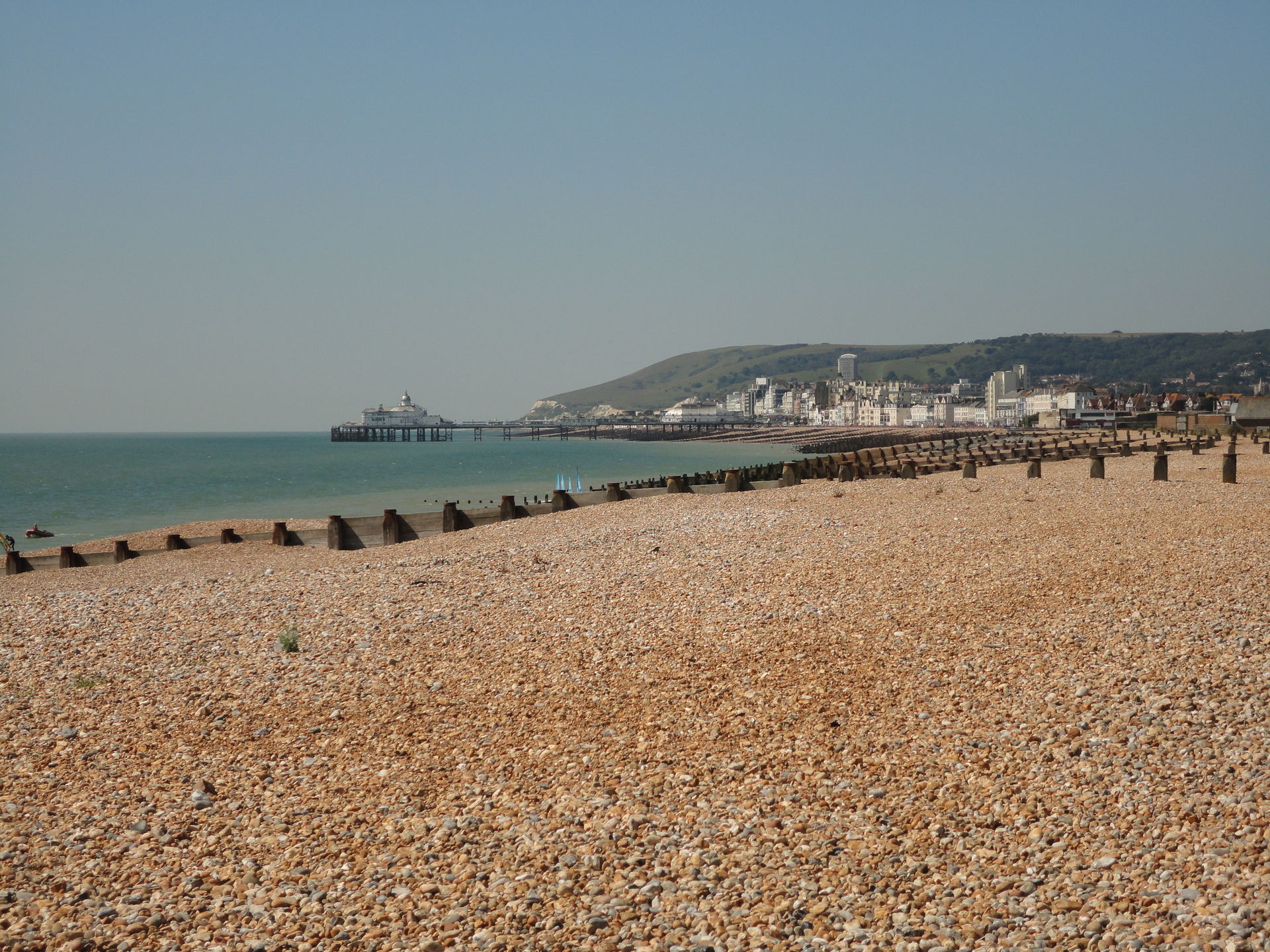 Zoom über den Strand nach Eastbourne. Im Hintergrund sieht man die Ausläufer der Beachy Head Klippen.