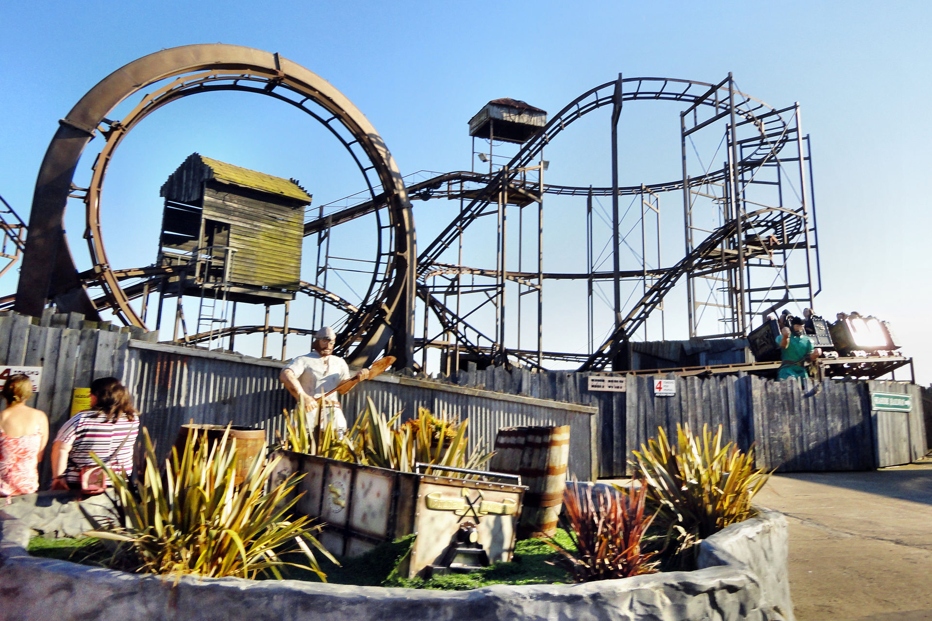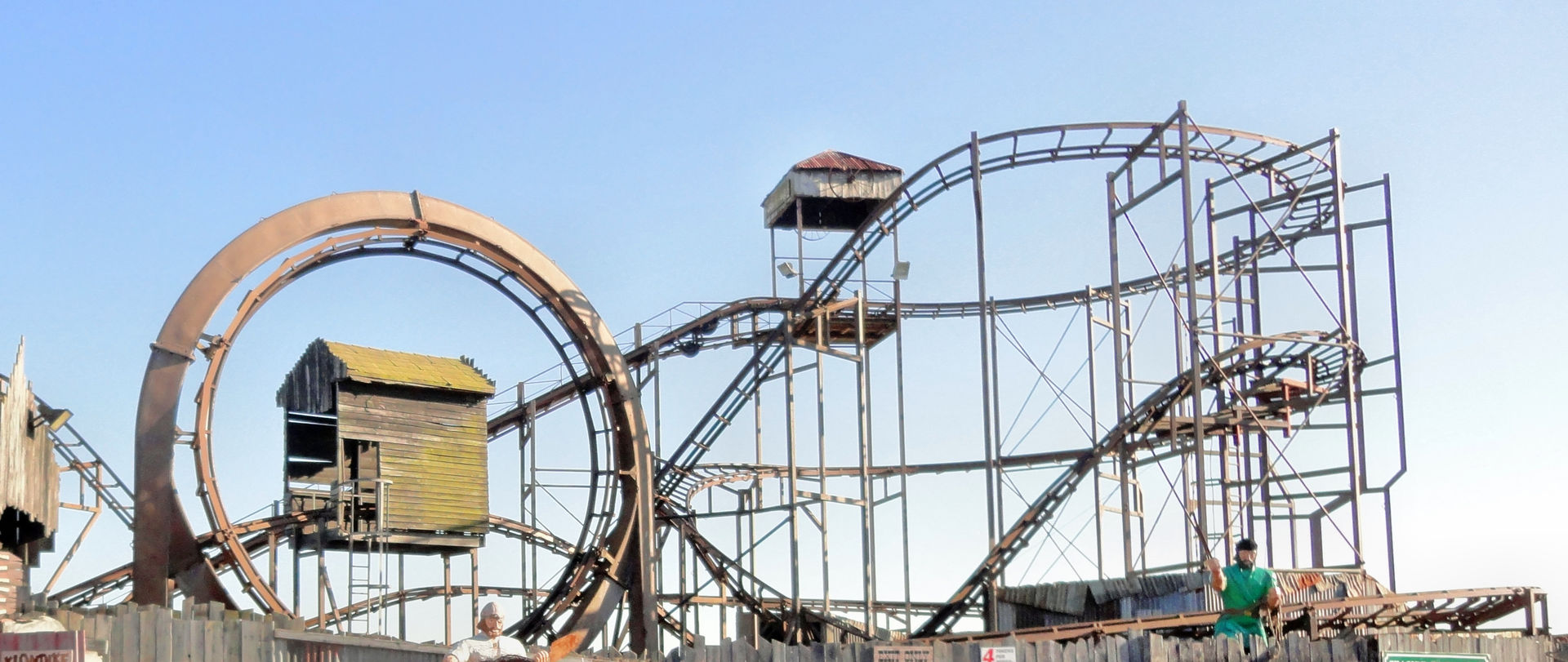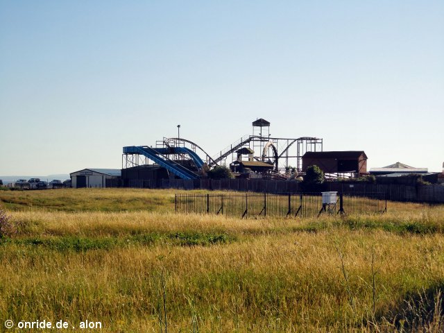 Die zum Meer hin gelegene Rückseite des Parks bildet der Pinfari Zyklon namens Klondike Gold Mine. Da der ganze Park nicht den neusten Eindruck macht, habe ich hier schlimmstes Erwartet wurde dann aber positiv überrascht. Man merkte zwar das alter, aber die Fahrt ähnelte in keinsterweise einem Boxkampf. Auch optisch hat man versucht die Bahn attraktiv zu gestalten. So ist z.B. die Warteschlange einem Minenschacht nach empfunden.