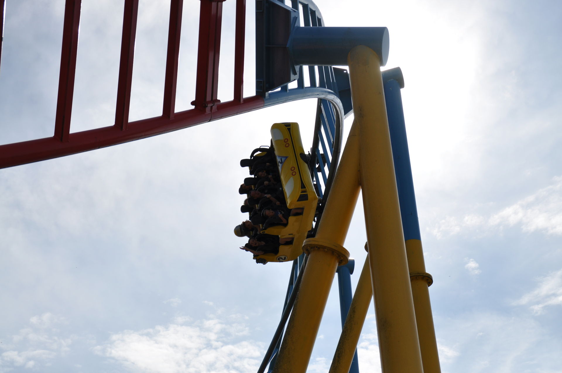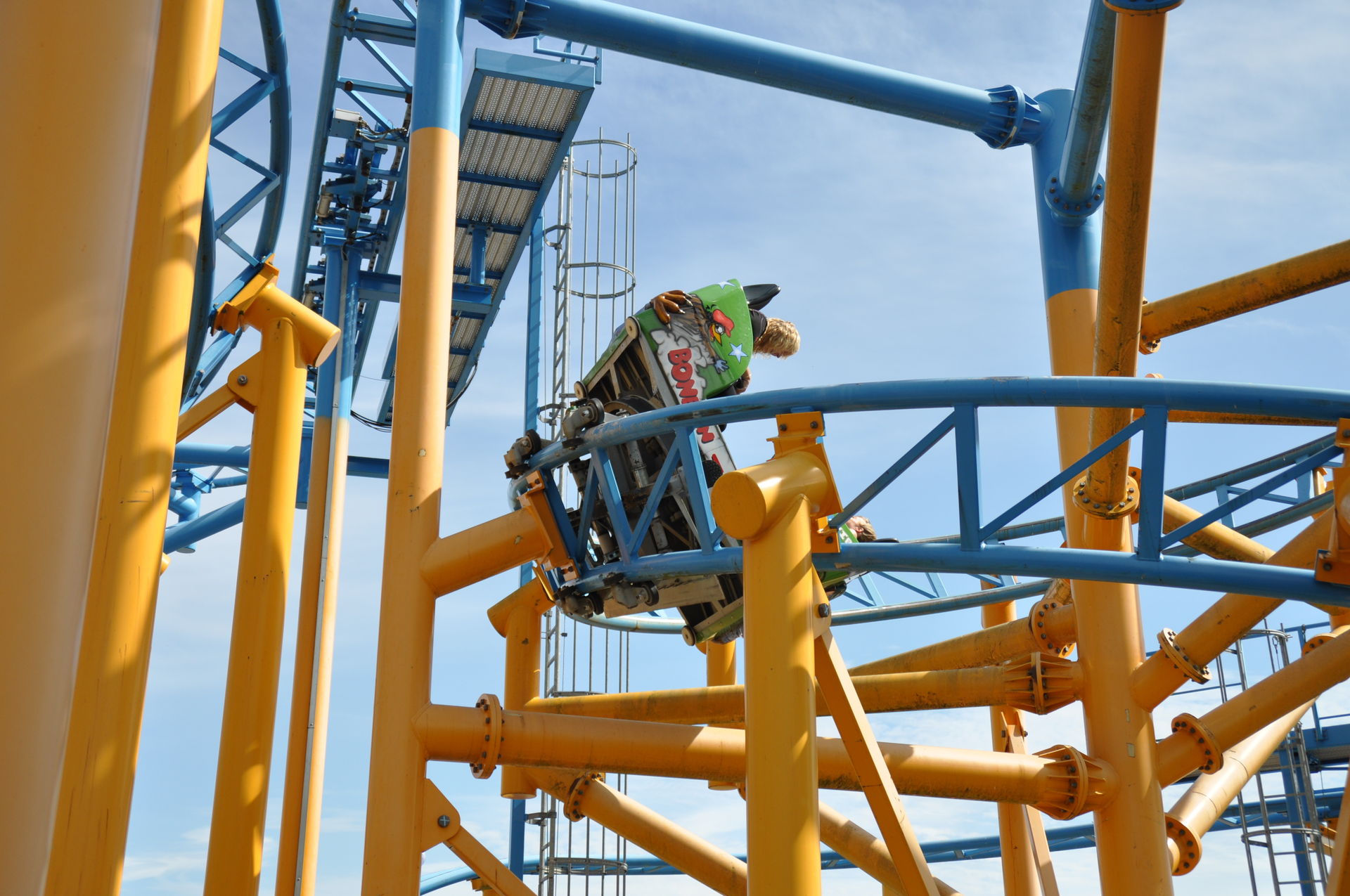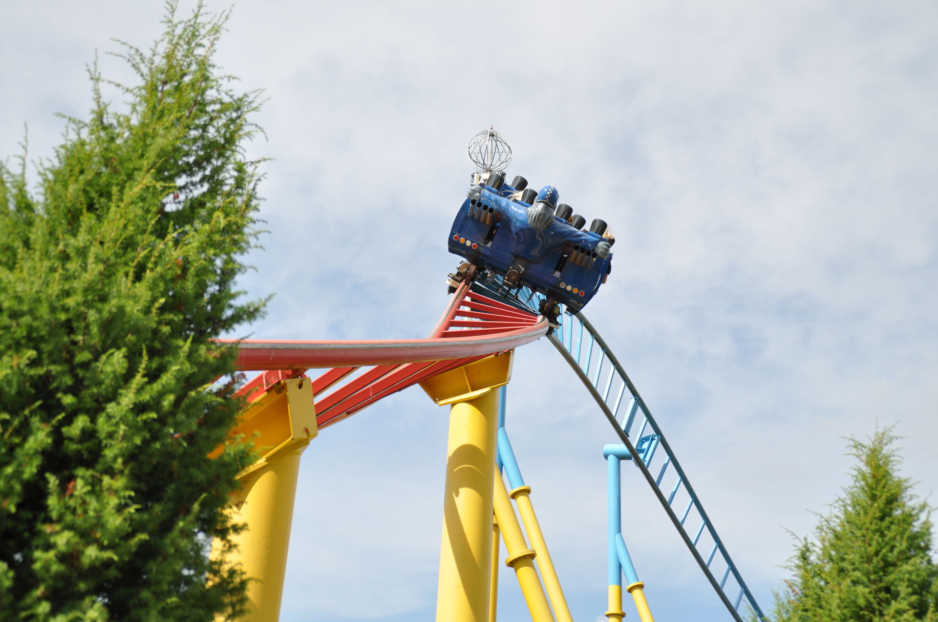Der hier stand vor ein paar Jahren noch in Deutschland. Man sieht der Bahn eindeutig an, dass sie nicht für das Bonbonland gebaut wurde. Die Station befindet sich in 6m Höhe und der Teil nach dem First Drop ist in einer Betonwanne ca. 1m tief in den See eingelassen. Eine etwas komische Konstruktion. Aber fahren tut sie sich noch super.