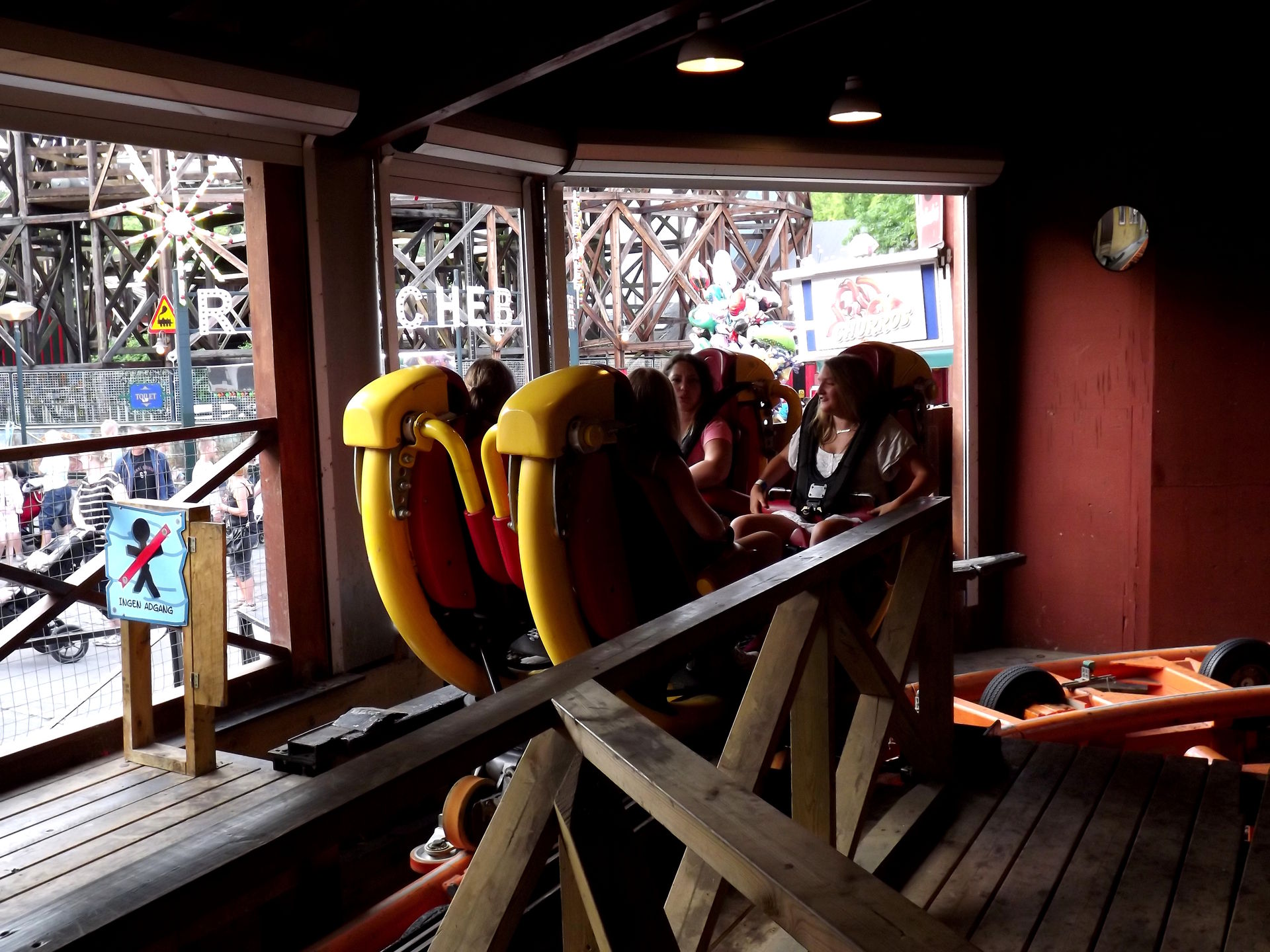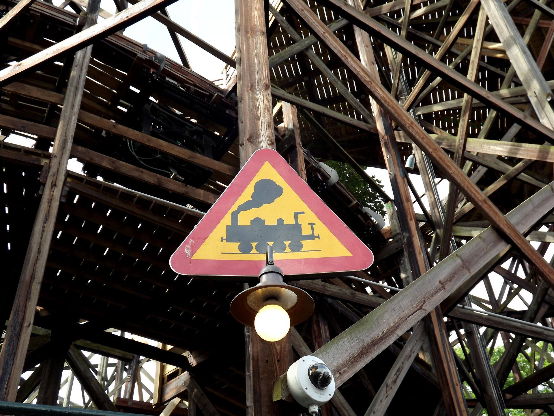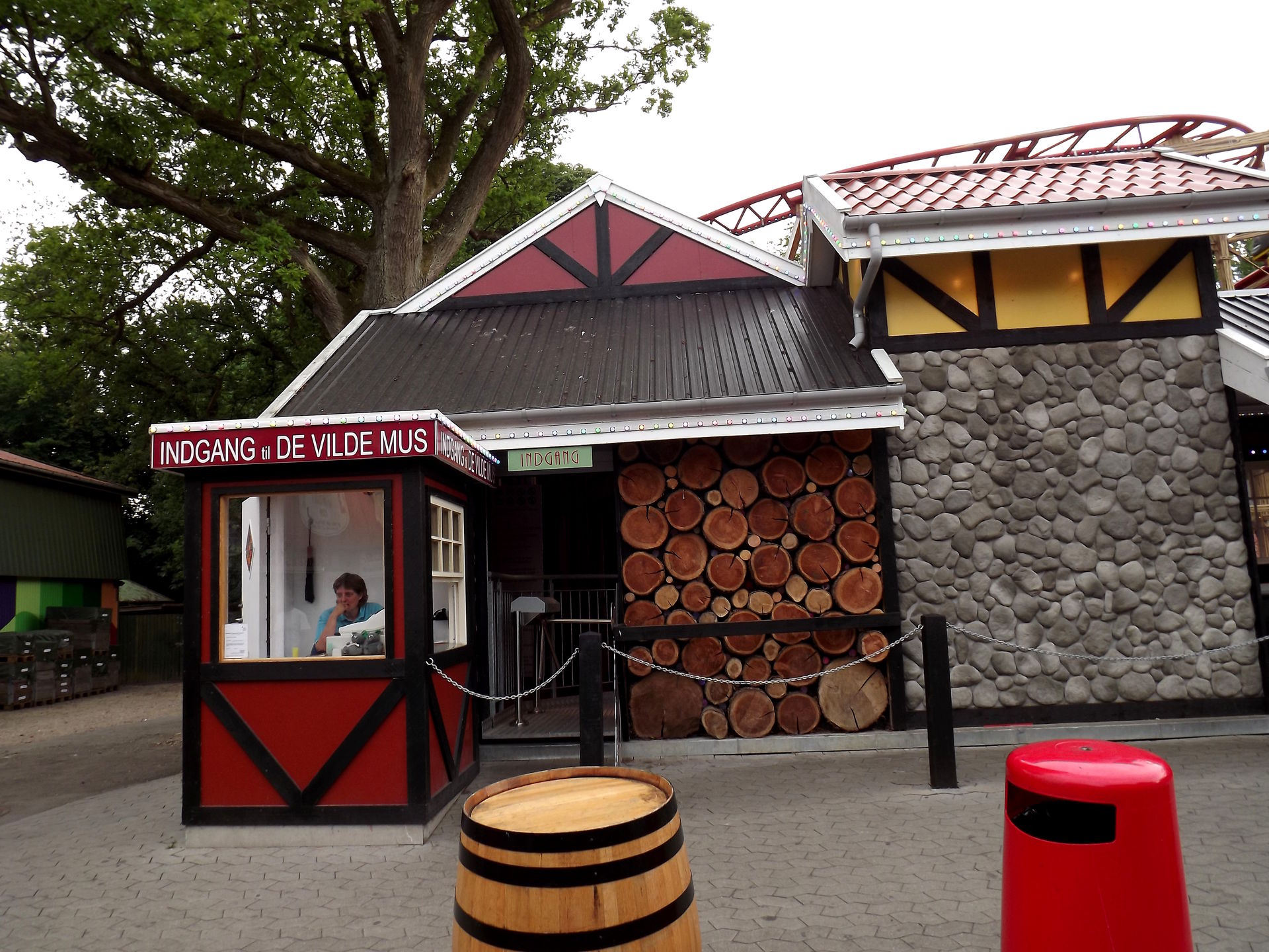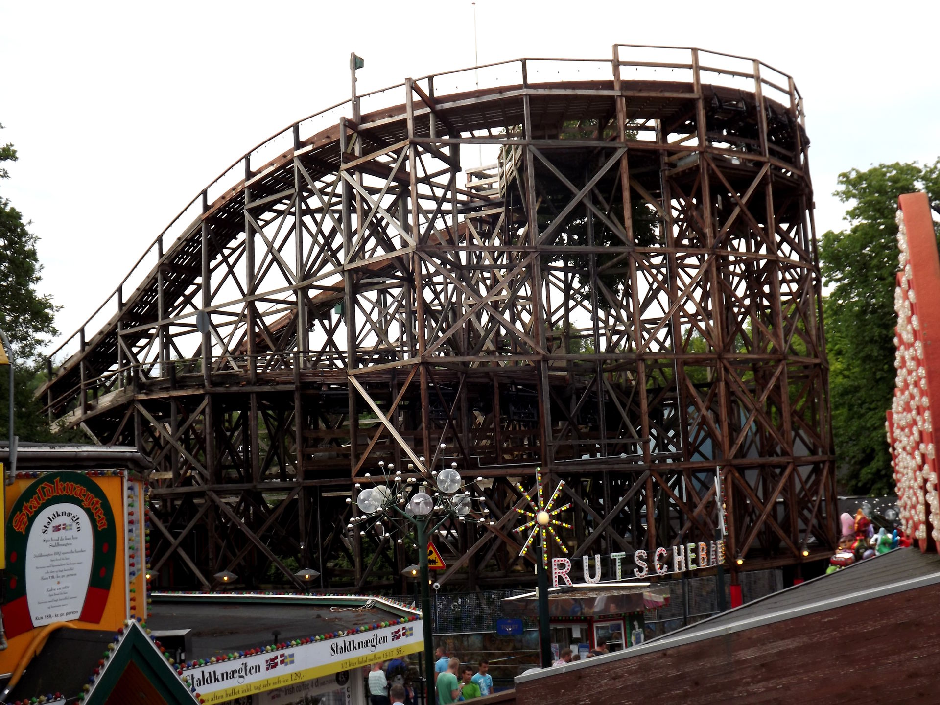 Direkt gegenüber von Tornado ist der Eingang von der historischen Holzachterbahn Rutschebanen, die leider inzwischen keinen Bremser mehr hat und modernisiert wurde. Die