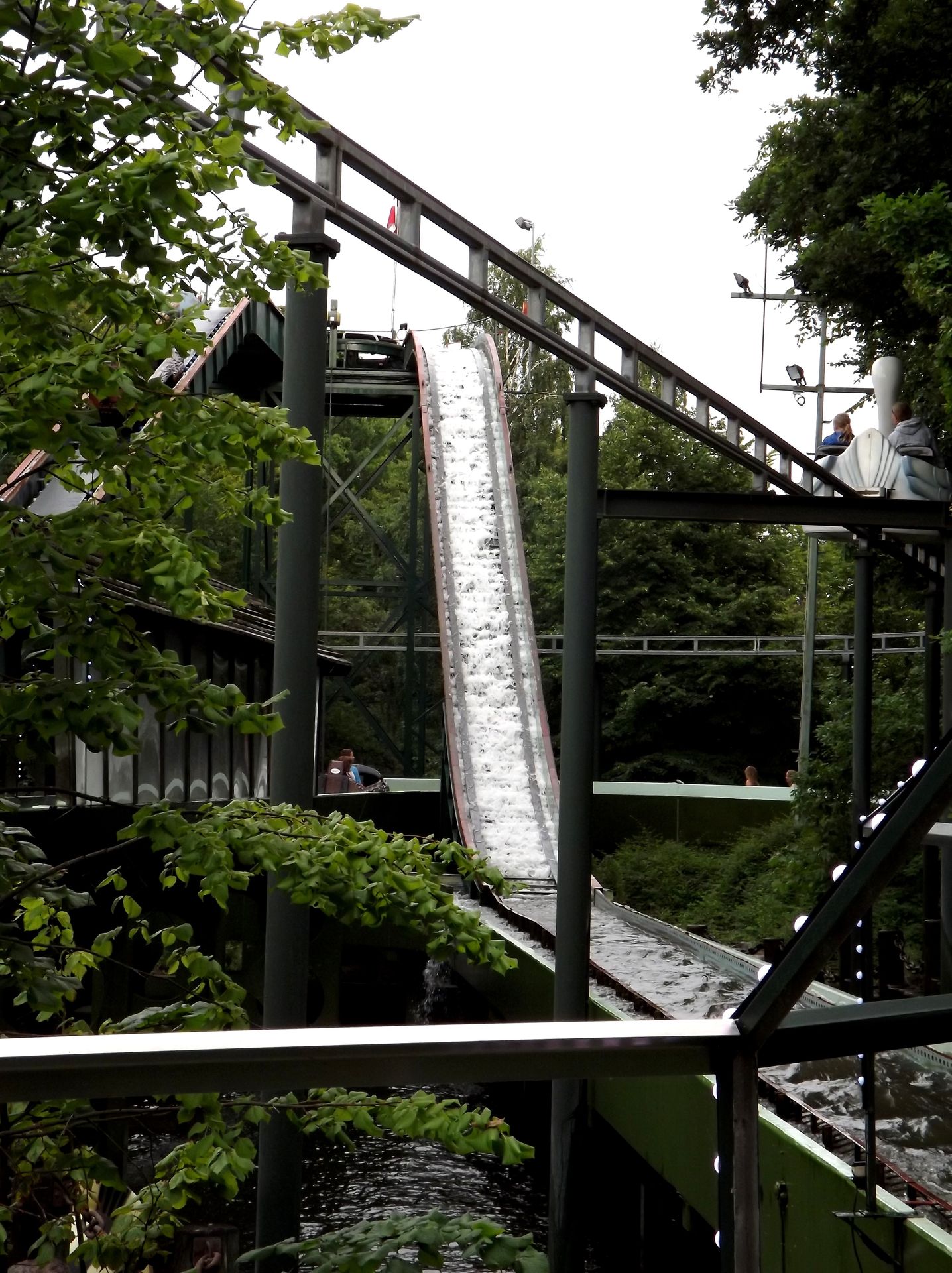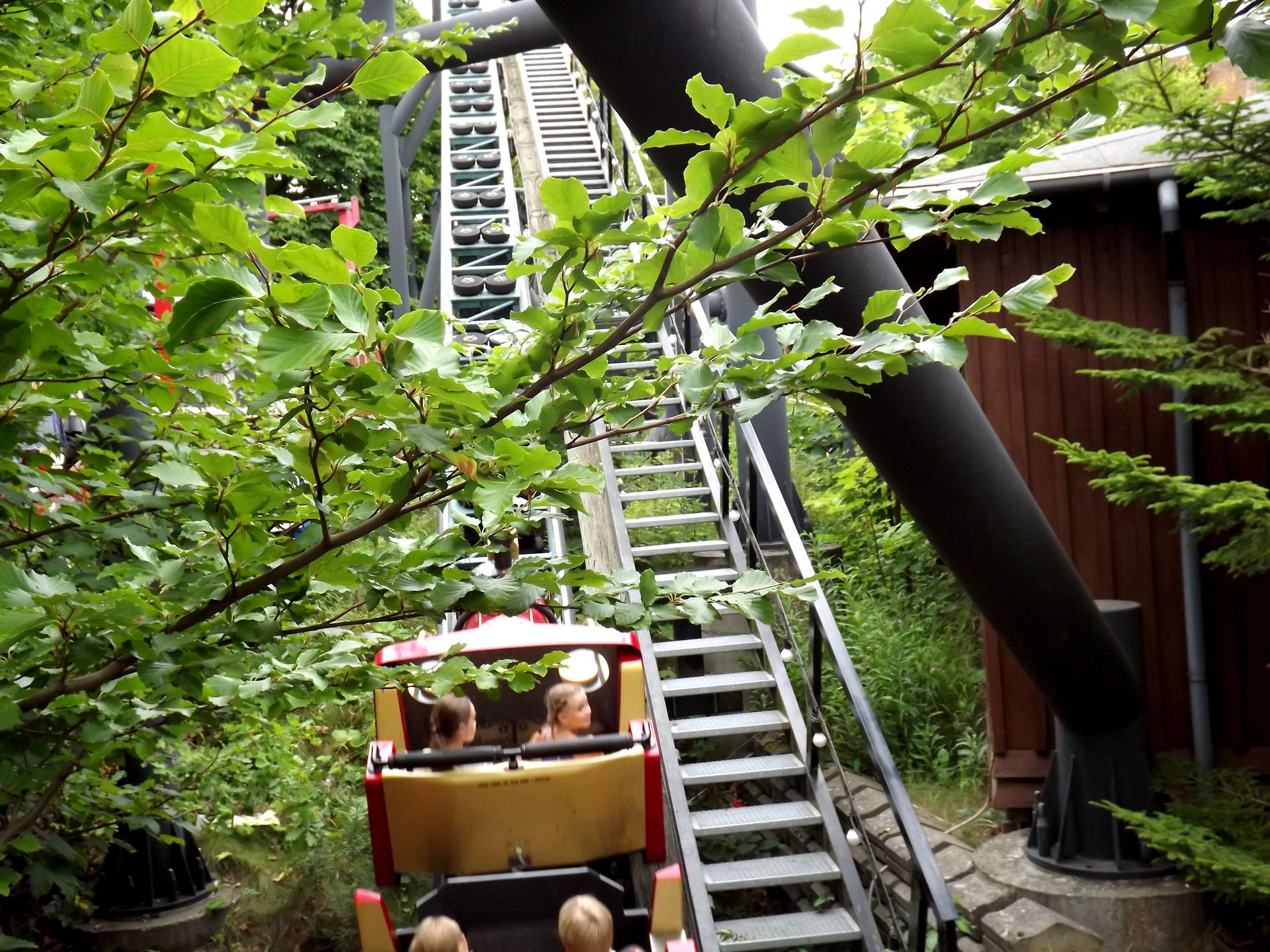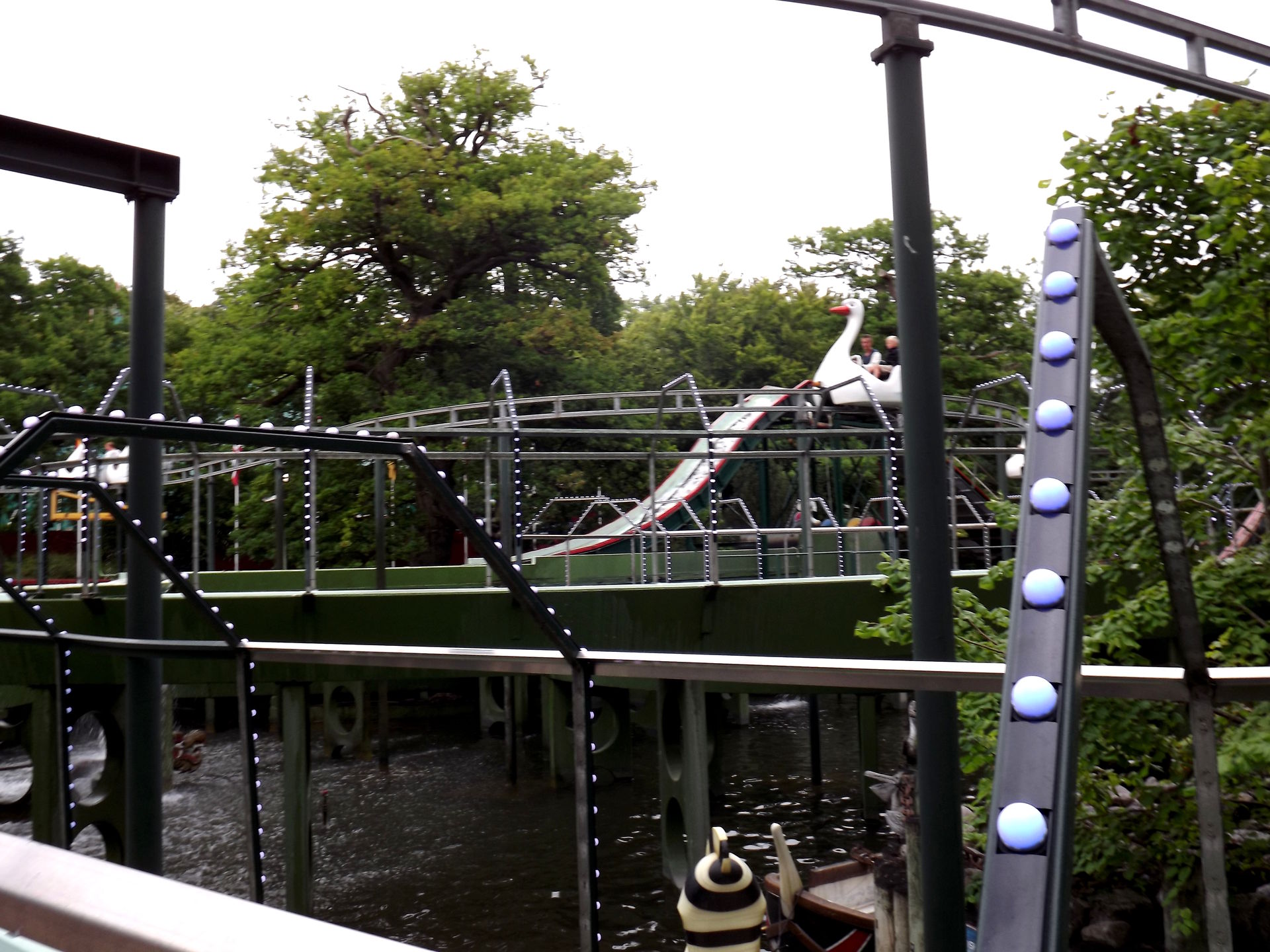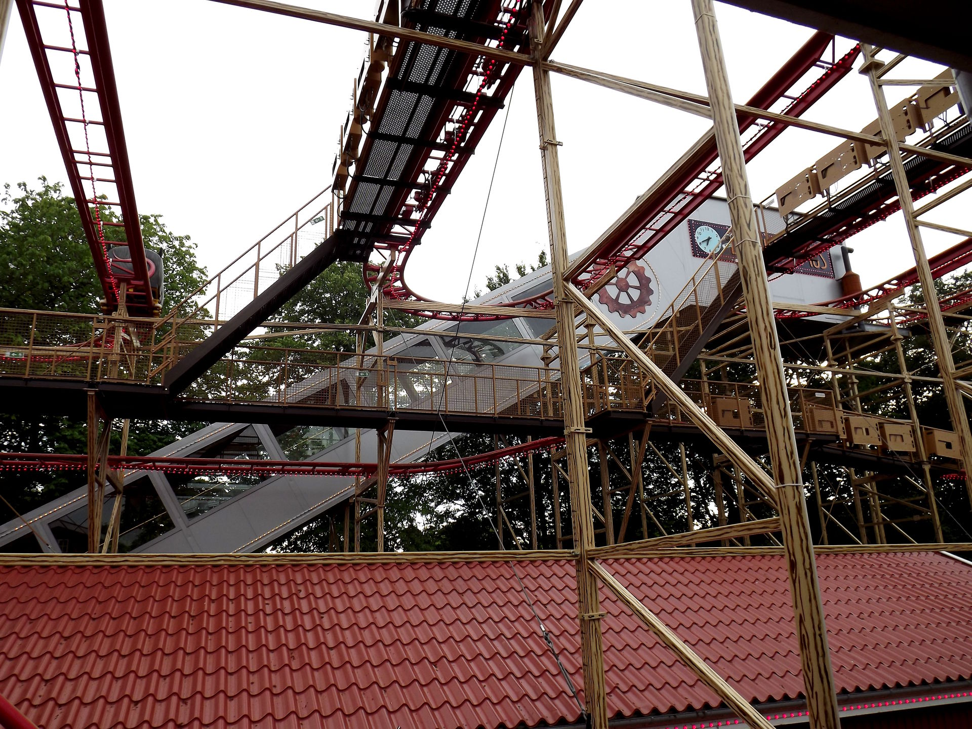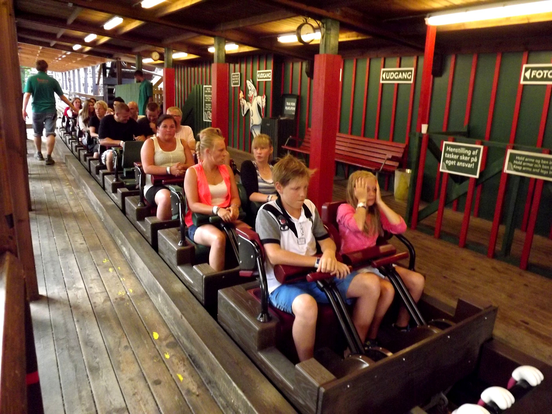 Direkt gegenüber von Tornado ist der Eingang von der historischen Holzachterbahn Rutschebanen, die leider inzwischen keinen Bremser mehr hat und modernisiert wurde. Die