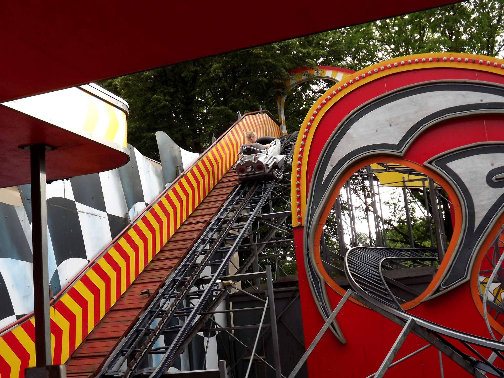 Zierer Flitzer, der 1971 gebaut wurde und zunächst einige Jahre unter Robrahn reiste, bis sie in den 80er Jahren nach Bakken kam. Gebremst wird die Anlage auch heute noch von einem Bremser, der neben der Bahn sitzt.