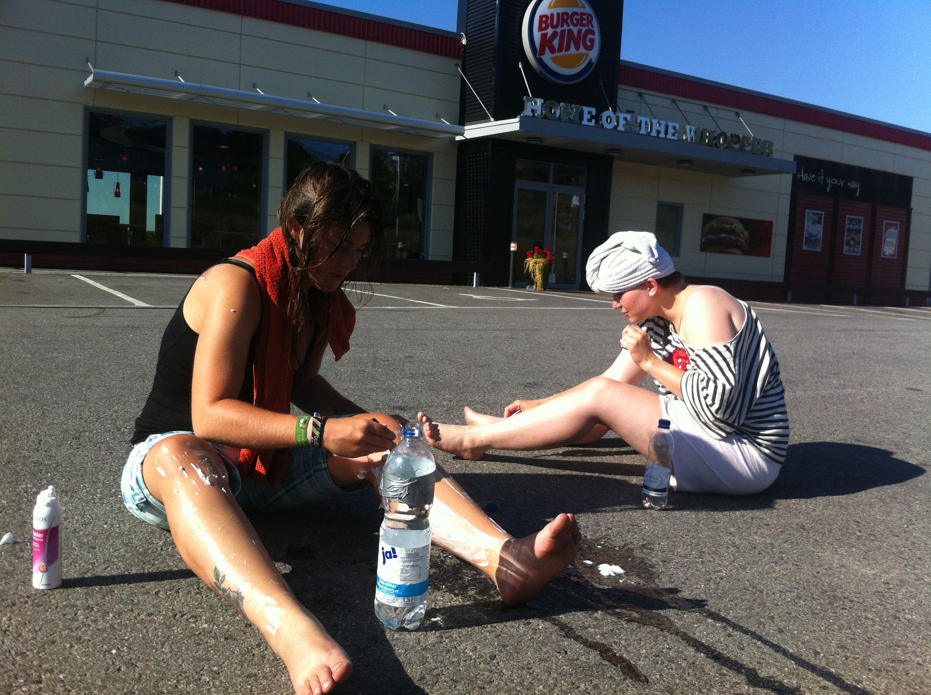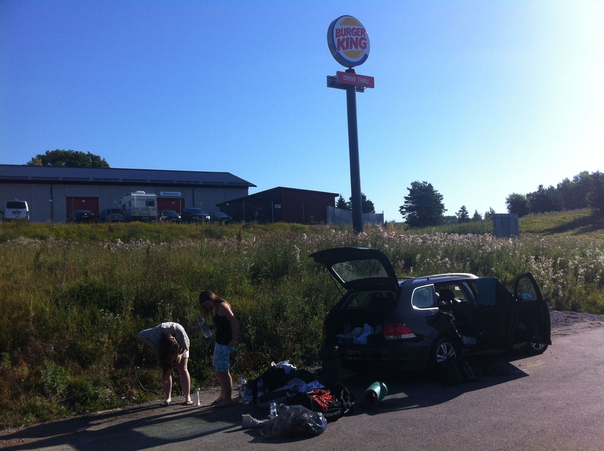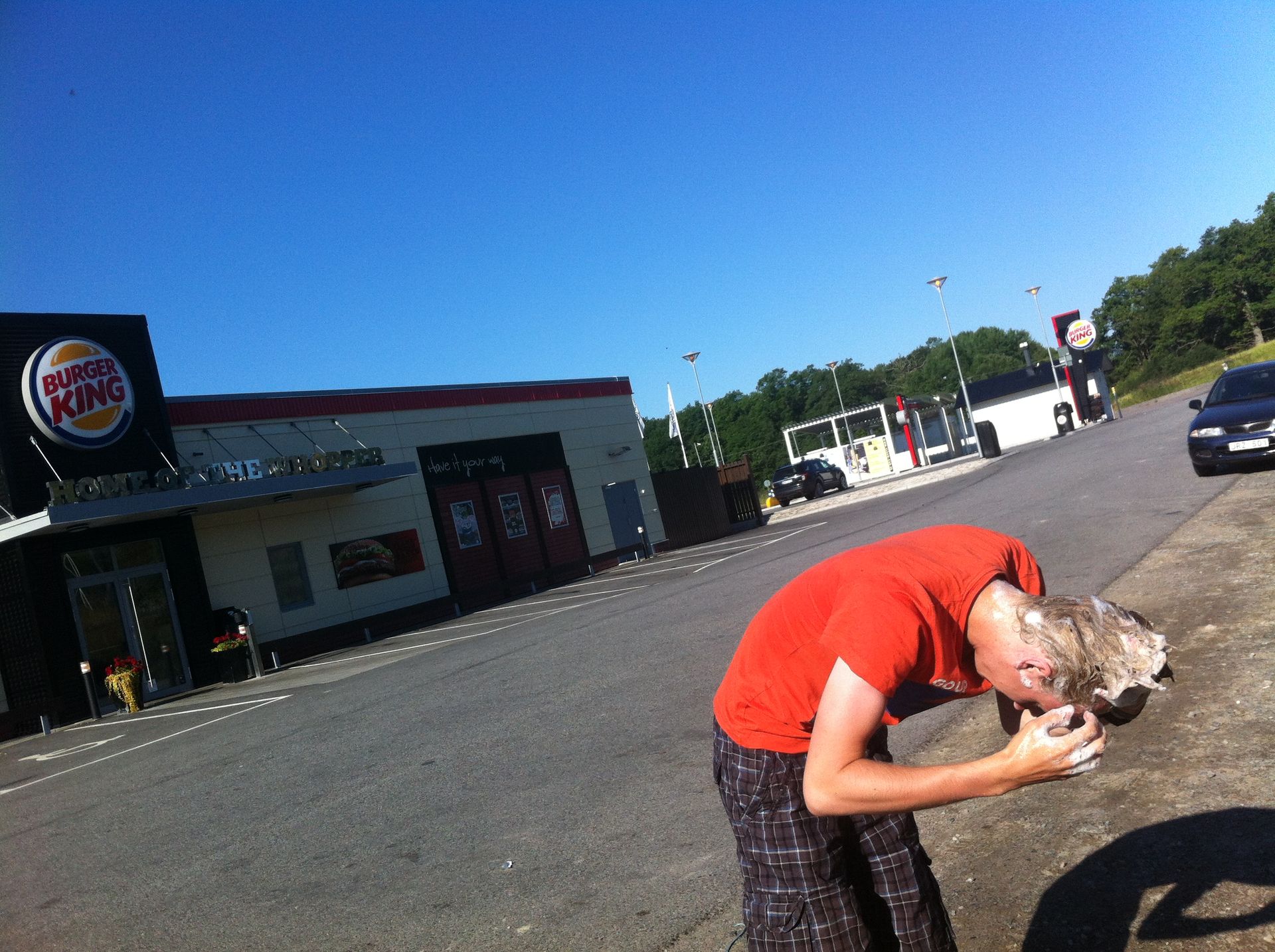 Die Nacht hatten wir ja auf dem Burger King Parkplatz auf dem Autobahn Rastplatz verbracht und wurden glücklicherweise eine Stunde vor Öffnung wach. Im Zoo am Tag zuvor gab es keine Dusche, in Stockholm gibt es keine und auch am Tag nach Stockholm wird es keine geben, also musste improvisiert werden. Und das sah in etwa so aus: