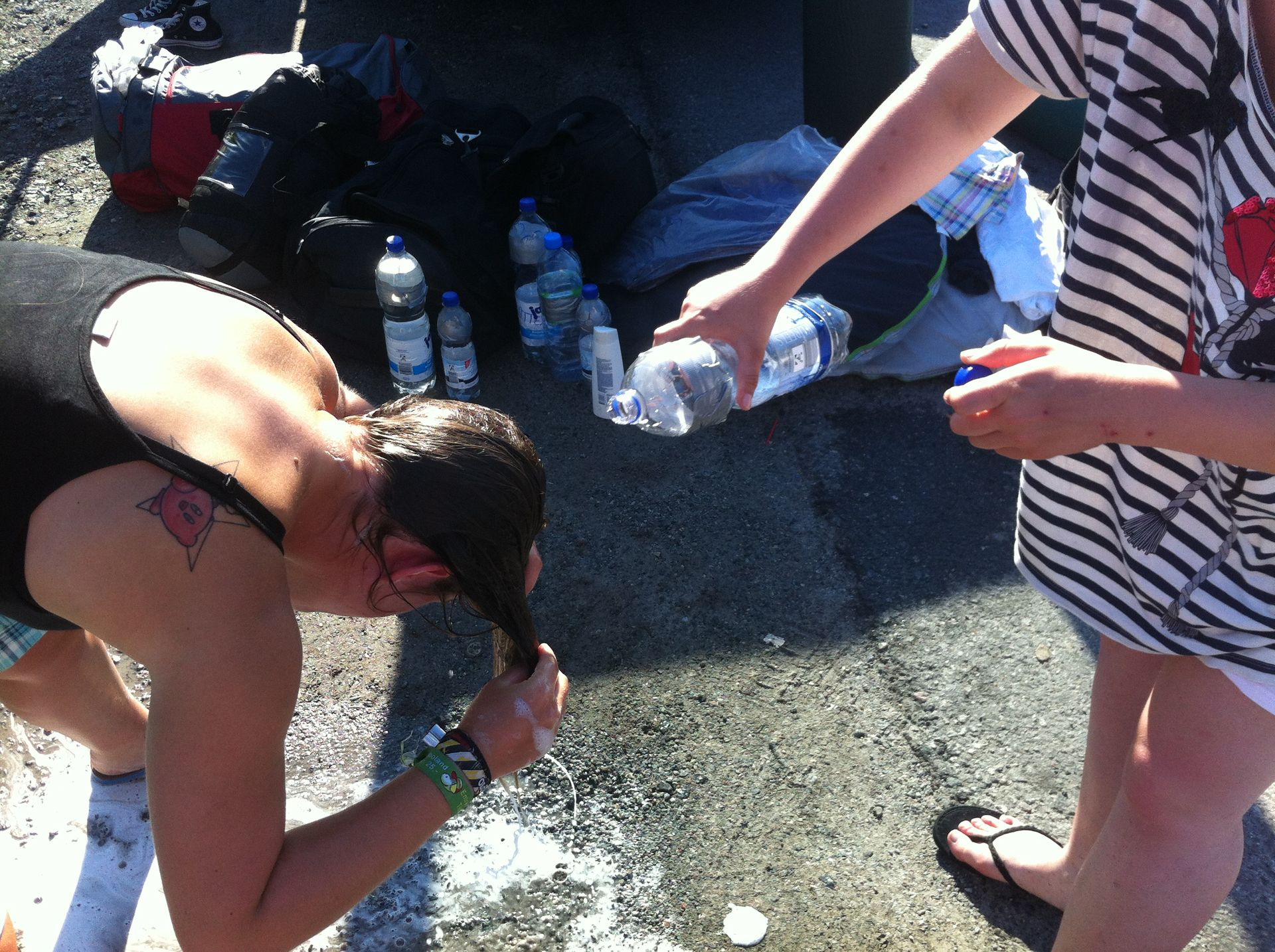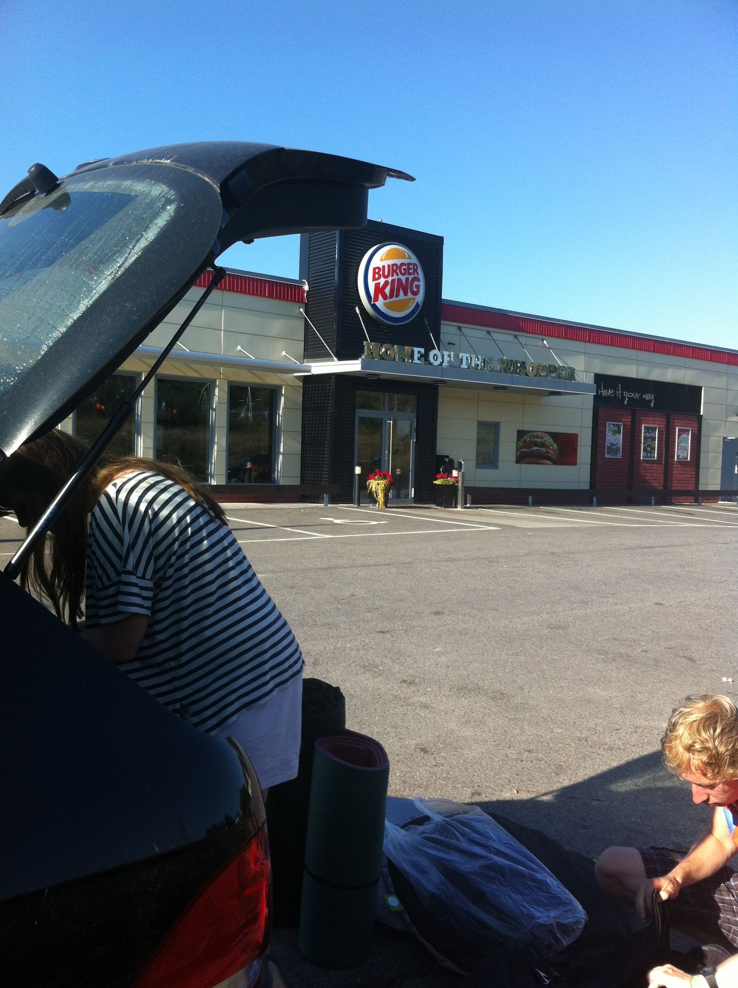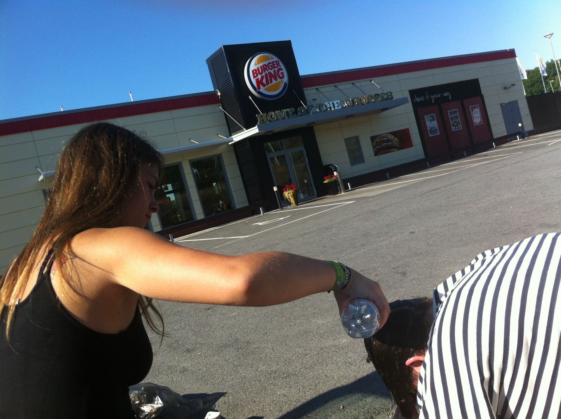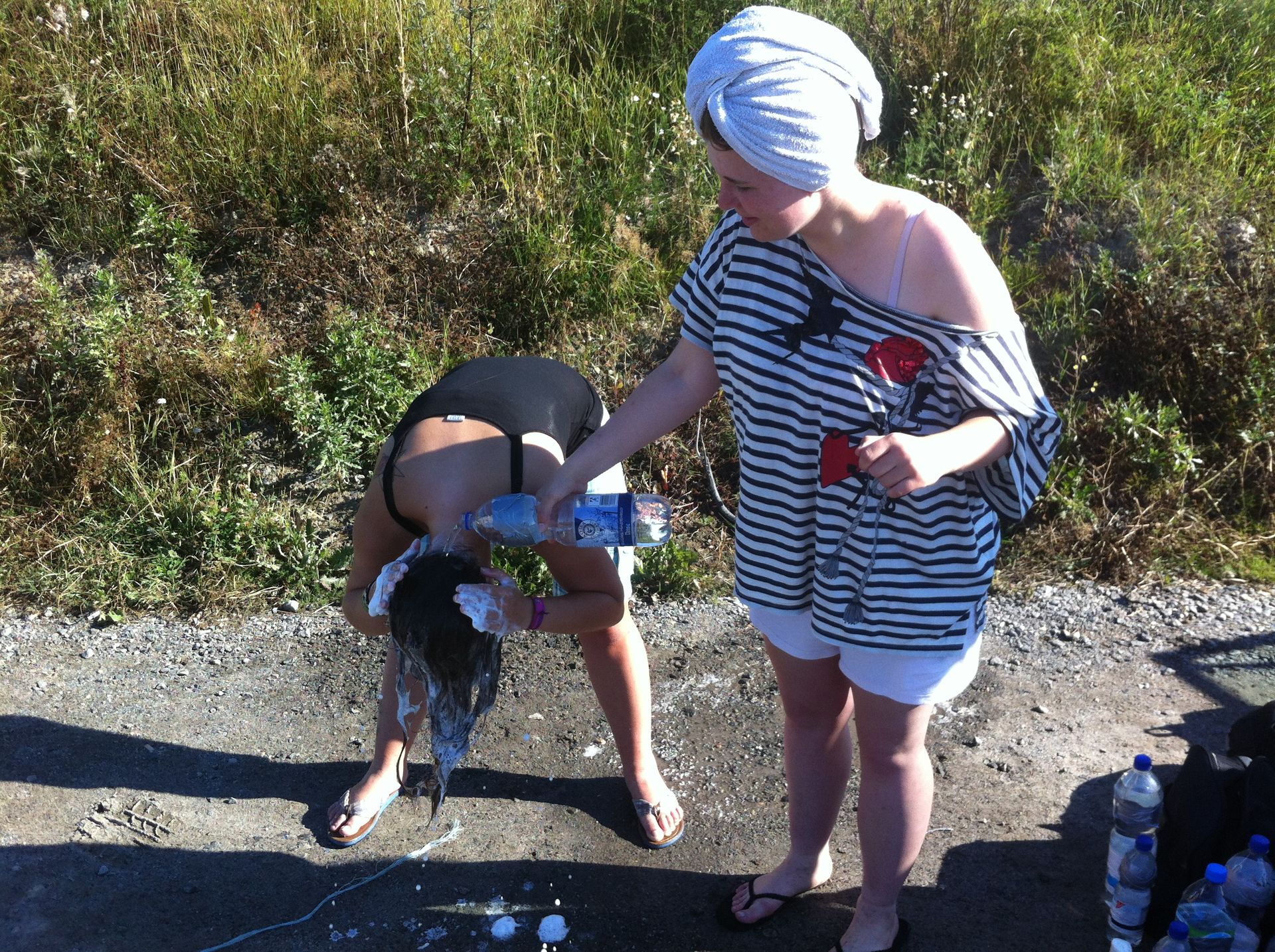 Die Nacht hatten wir ja auf dem Burger King Parkplatz auf dem Autobahn Rastplatz verbracht und wurden glücklicherweise eine Stunde vor Öffnung wach. Im Zoo am Tag zuvor gab es keine Dusche, in Stockholm gibt es keine und auch am Tag nach Stockholm wird es keine geben, also musste improvisiert werden. Und das sah in etwa so aus: