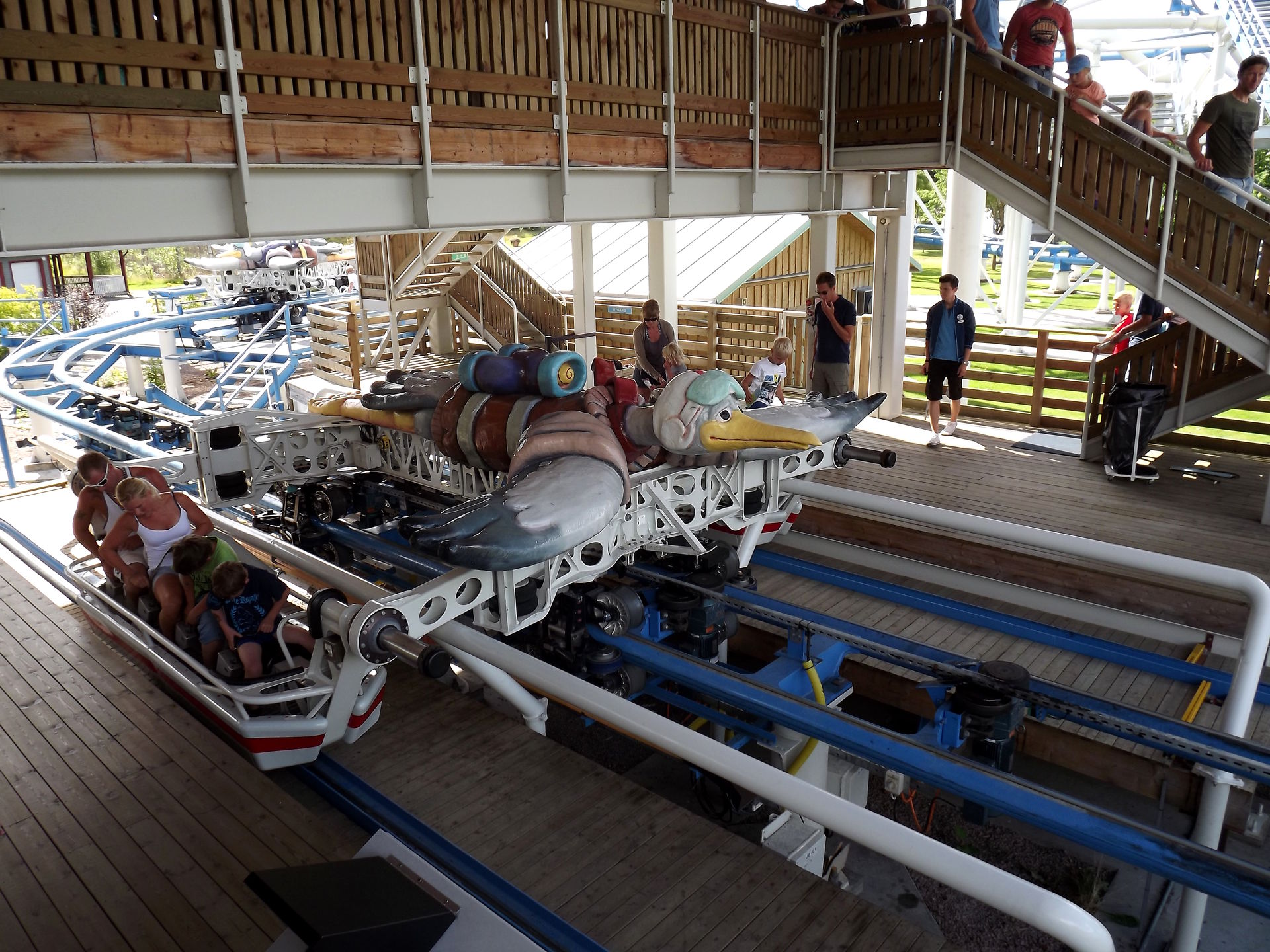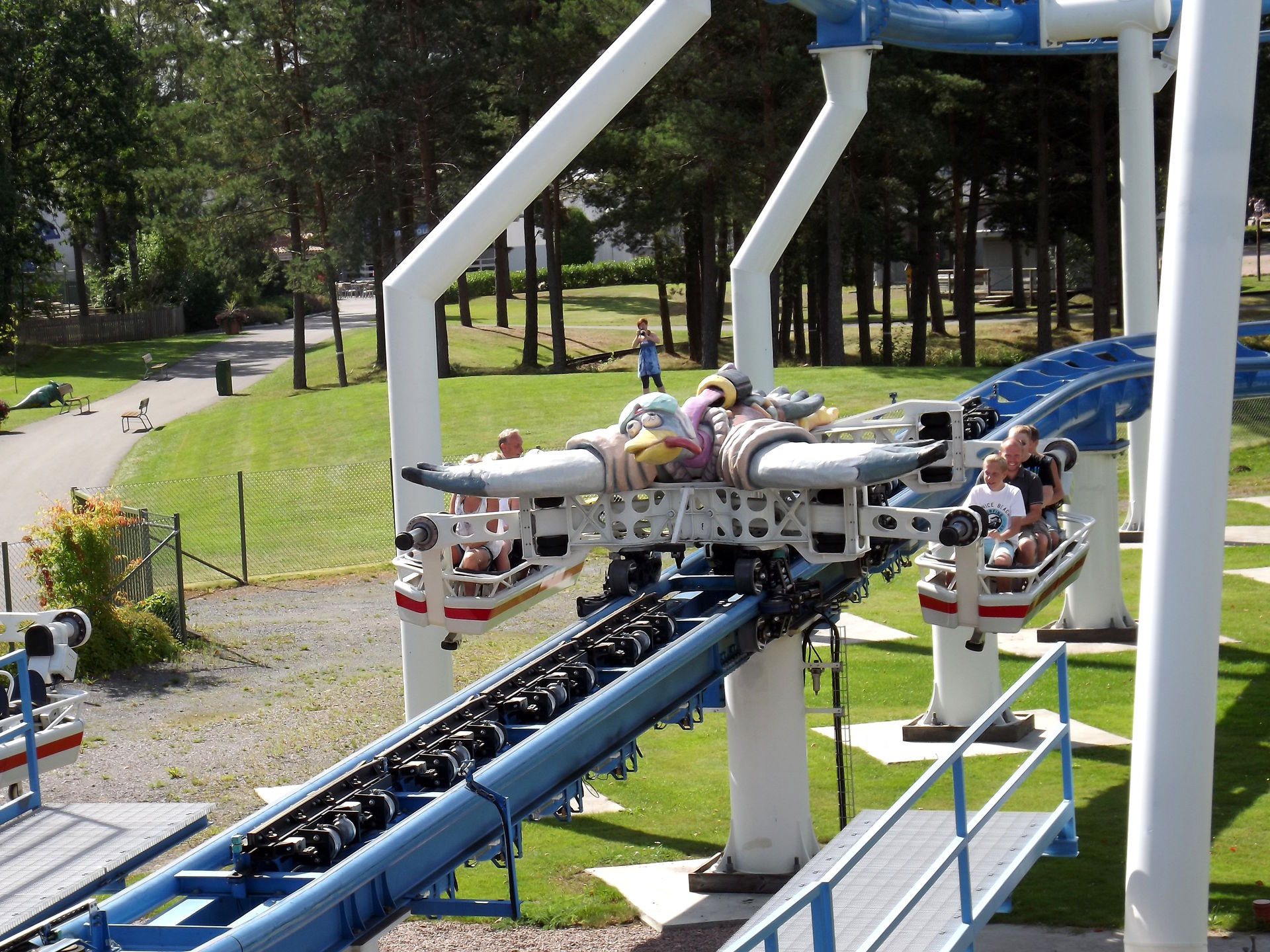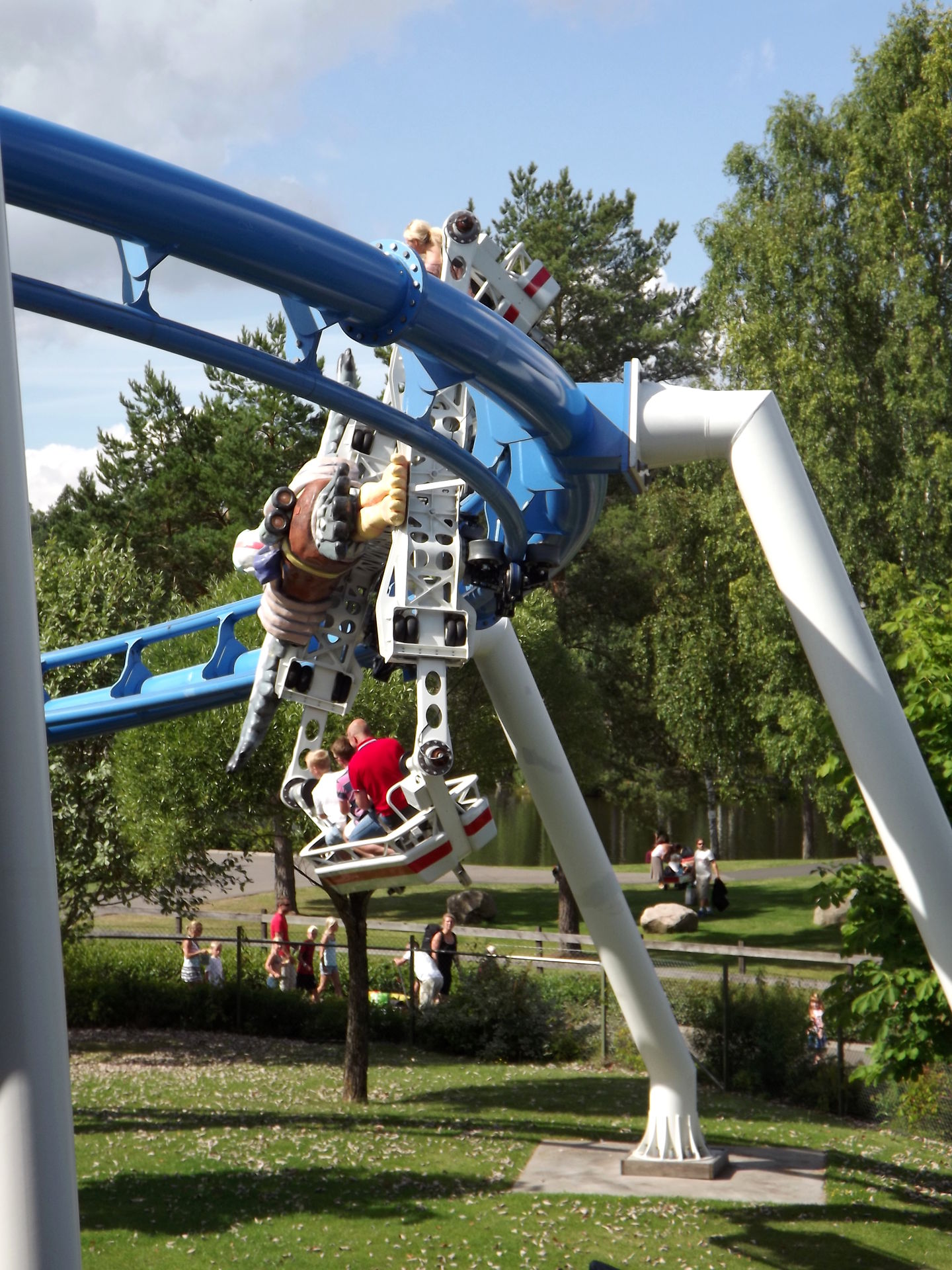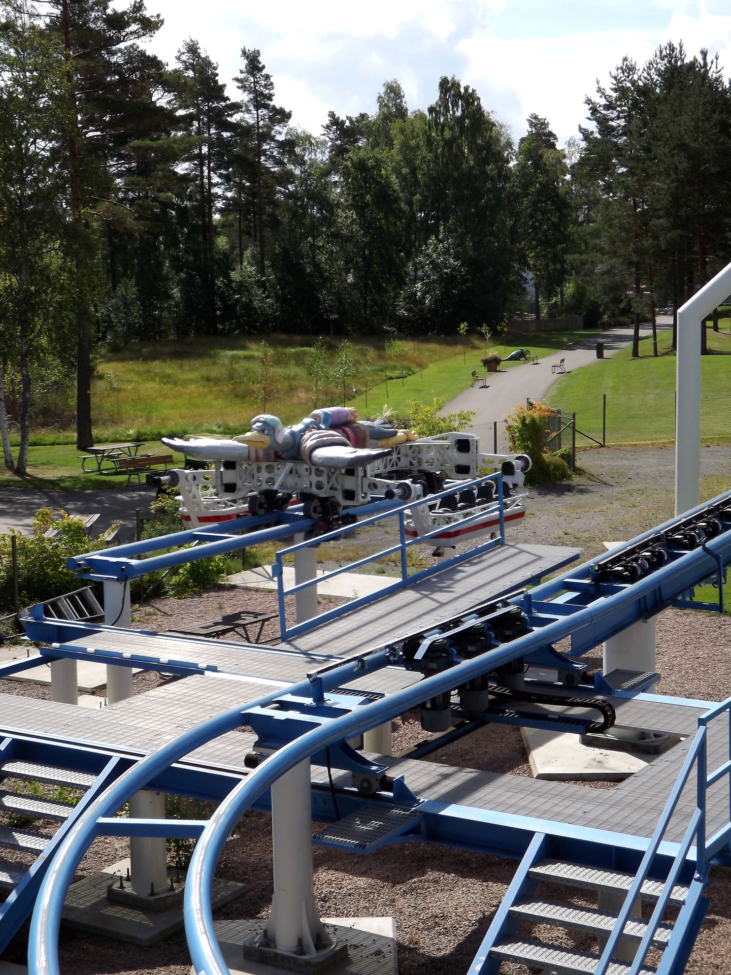 Nicht weit vom Spinner entfernt steht der Hauptbesuchsgrund vom Skara Sommarland, denn S&S bereichtere im Jahr 2009 den Park mit einem echten Unikat, dem Free Fly “Tranan” (Könnte rein optisch auch im BonBon-Land stehen). Die Bahn sieht ziemlich spektakulär und abgefahren aus, quietscht außerdem ohnegleichen und ist einfach nur seltsam. Ja, seltsam trifft es eigentlich am besten, denn so richtig Scheiße ist die Bahn nicht, so richtig toll aber auch nicht. Keine Ahnung. Seltsam eben.