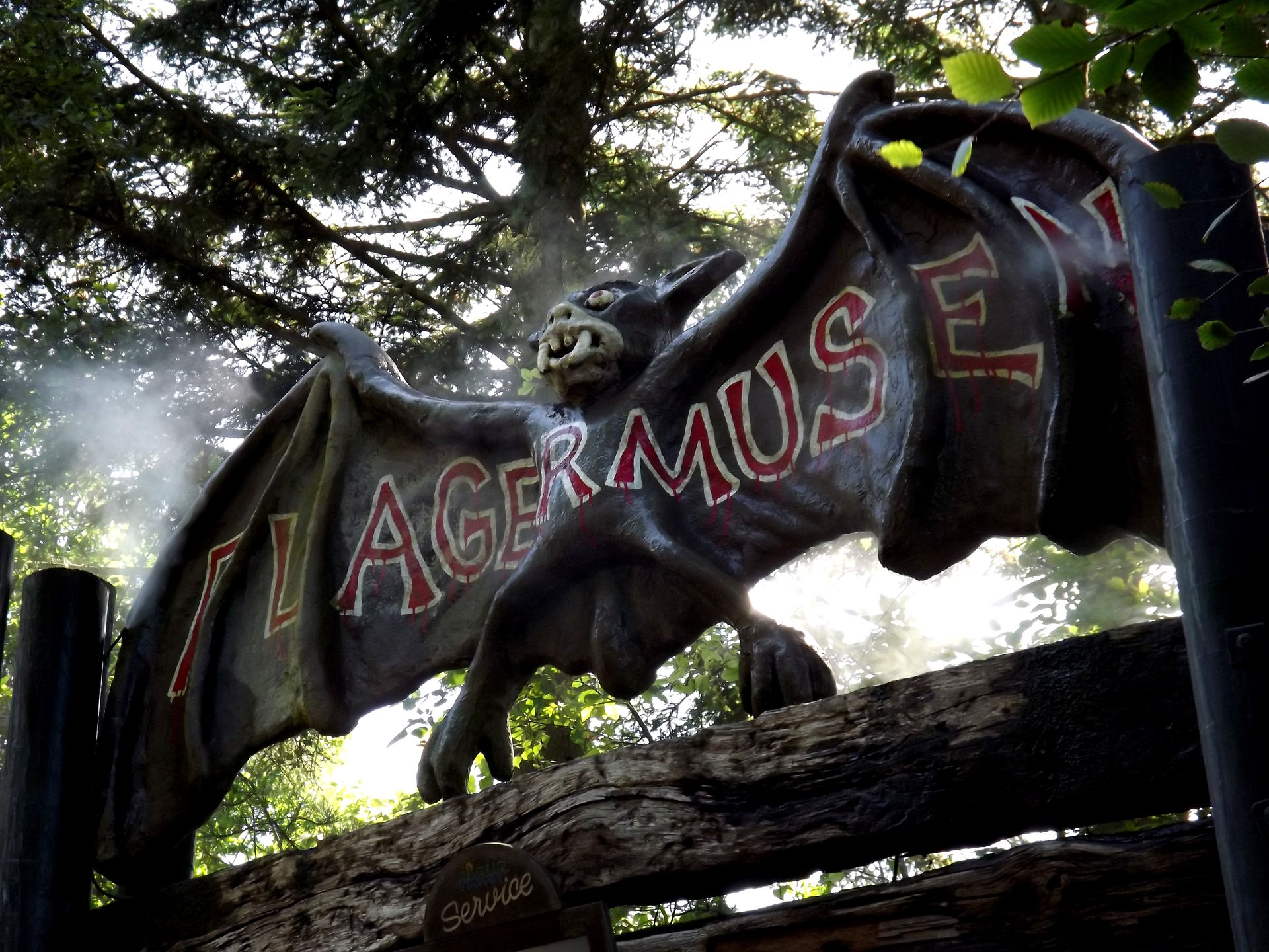 Nach der Mainstreet führt ein weiterer Hauptweg links zu Falken und Orkanen und rechts zu den restlichen Attraktionen. Die erste, die einem auf diesem Weg begegnet, ist die Spinning Mouse Flagermusen. Immerhin sieht die ganz hübsch aus, ein kleiner Trost.