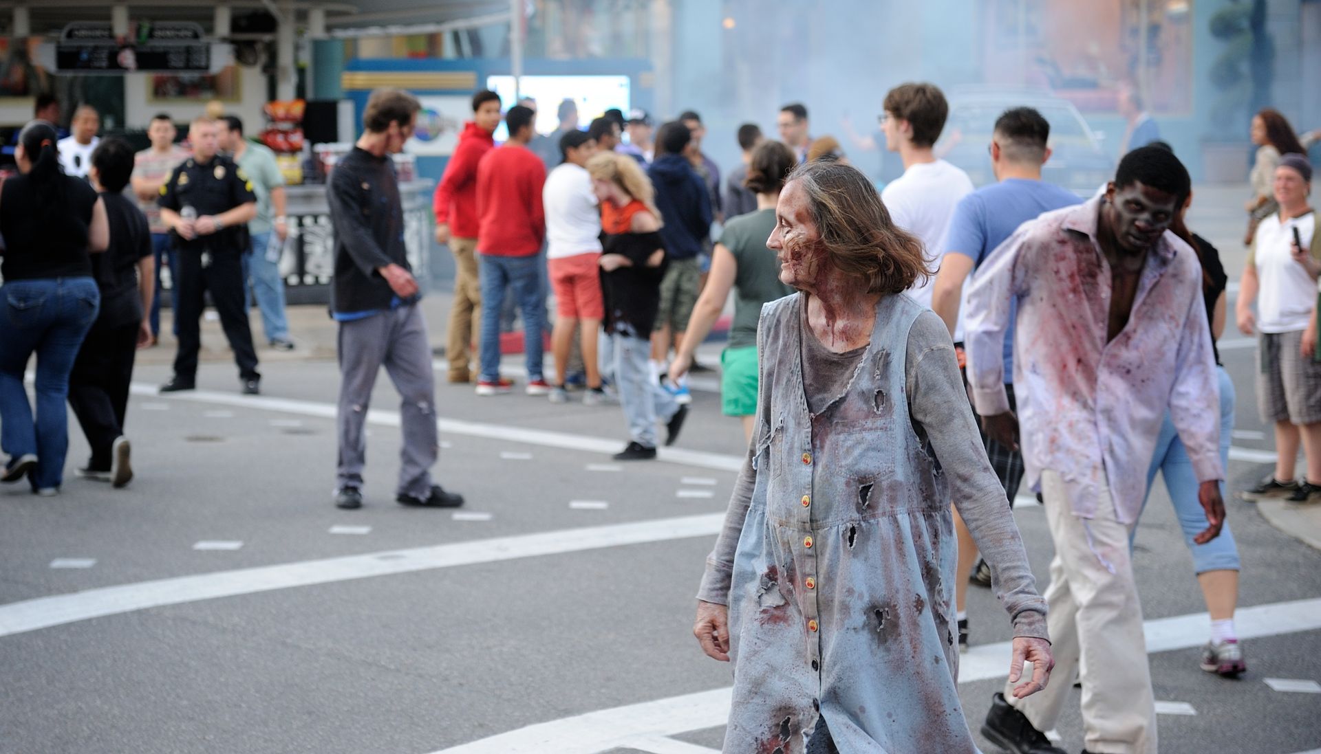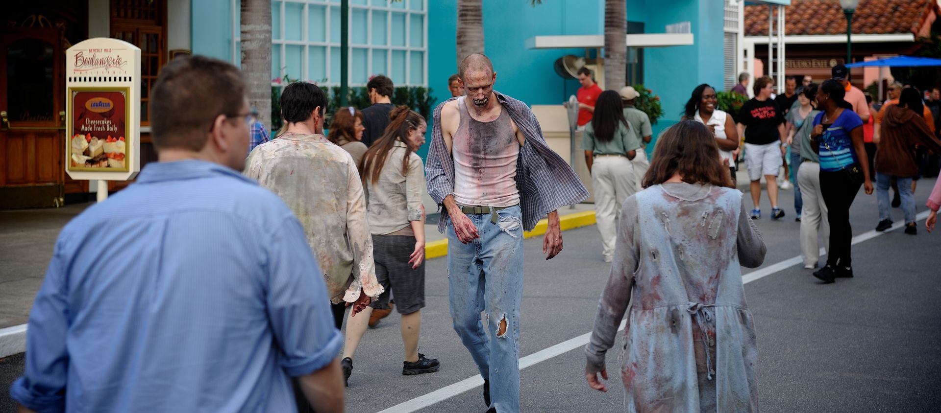 Zombies mischen sich unter die Gäste, kaufen Soft-Drinks und fahren Despicable Me Minion Mayhem. It's so fluffy!