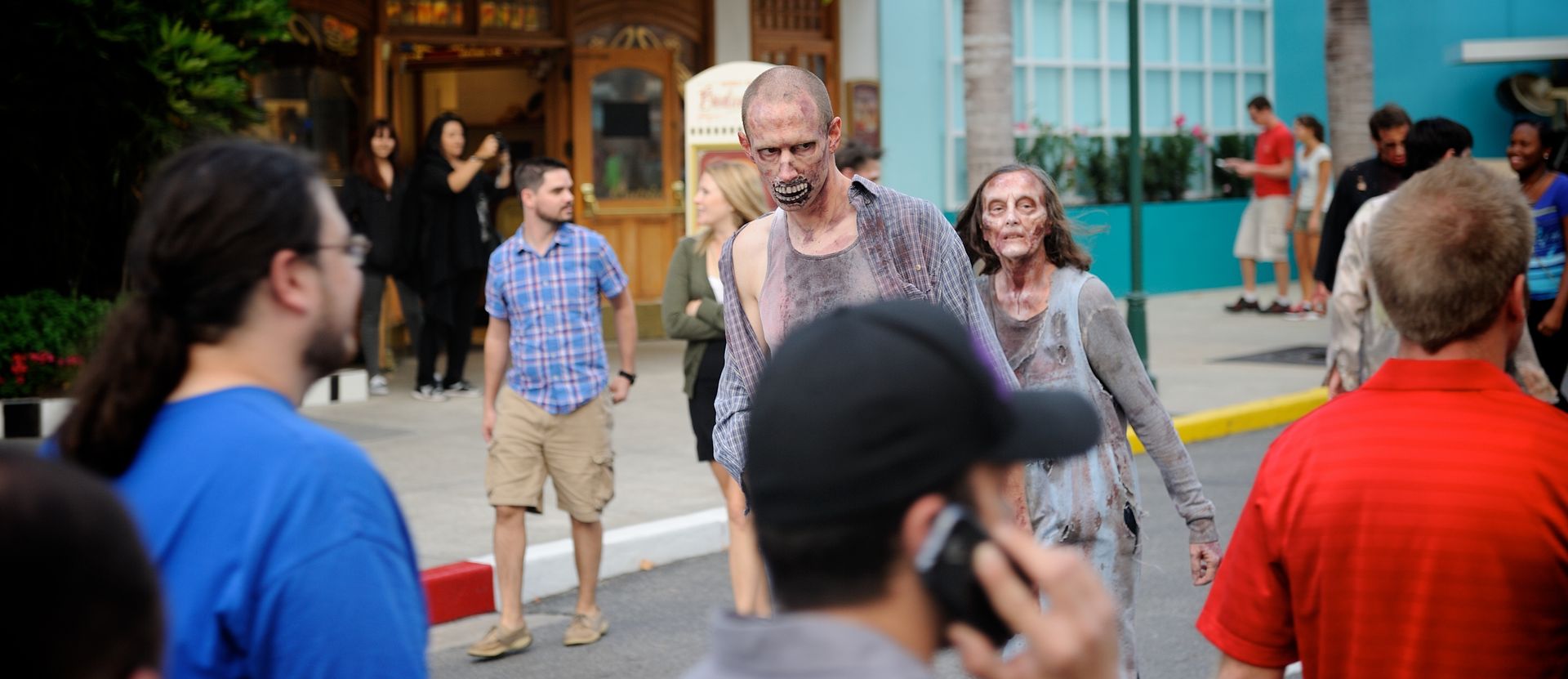 Es ist schon sehr beeindruckend, was die Universal Studios alljährlich für ihr „Halloween Horror Nights“ Event auf die Beine stellen. Neben einem riesigen Cast von Scare-Actors werden hier jedes Jahr acht(!) Mazes komplett neu gebaut. Zu den diesjährigen „Halloween Horror Nights 23“ hat das Kreativ-Team ganz auf Lizenzen gesetzt, allen voran die gegenwärtig extrem erfolgreiche TV-Serie „The Walking Dead“, die in der vierten Staffel auf amc läuft. Weitere IPs: „The Cabin in the Woods“, „Resident Evil“, „An American Werewolf in London“ und „Evil Dead“ (in Deutsch „Tanz der Teufel“, ein Frühwerk von Sam Raimi).