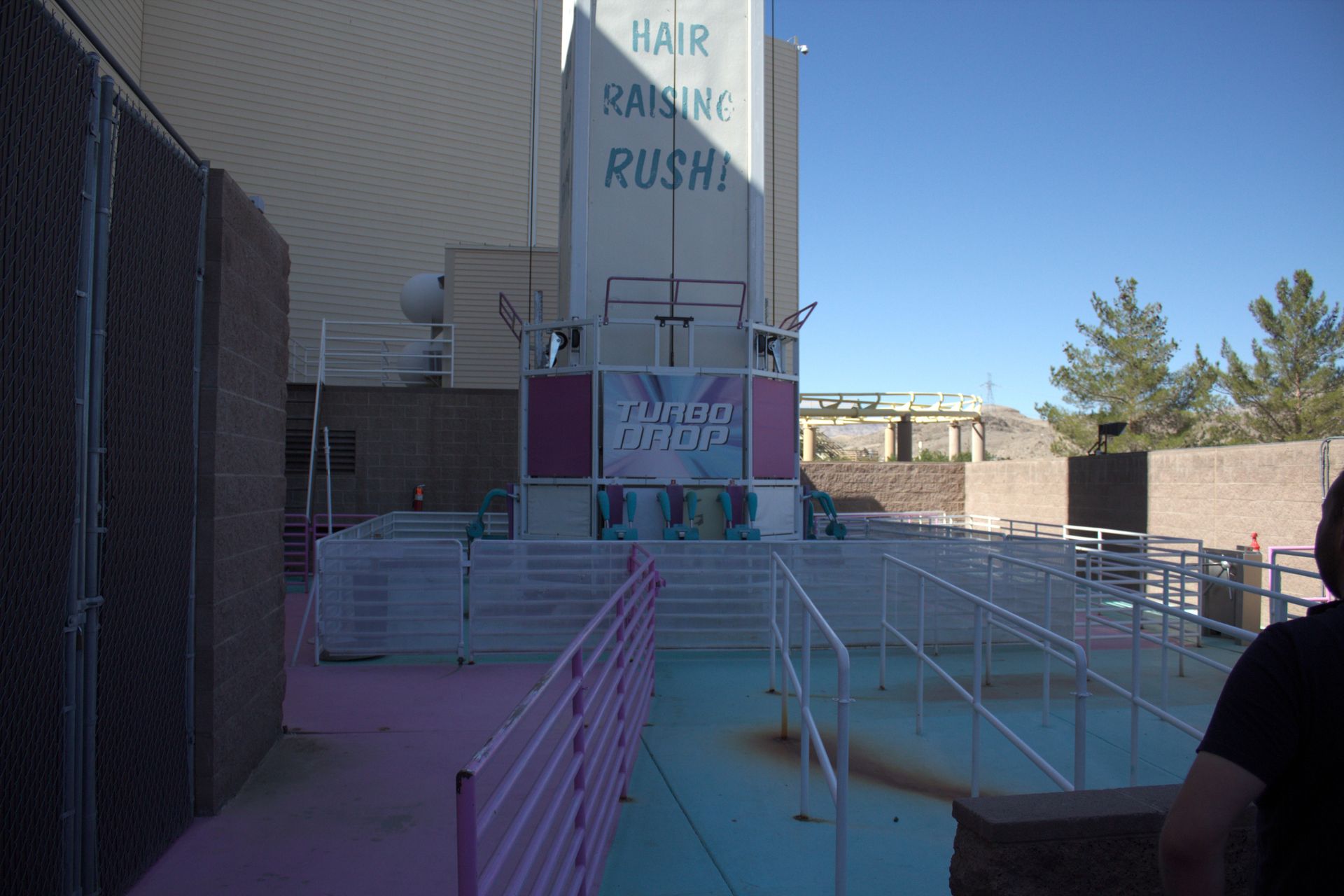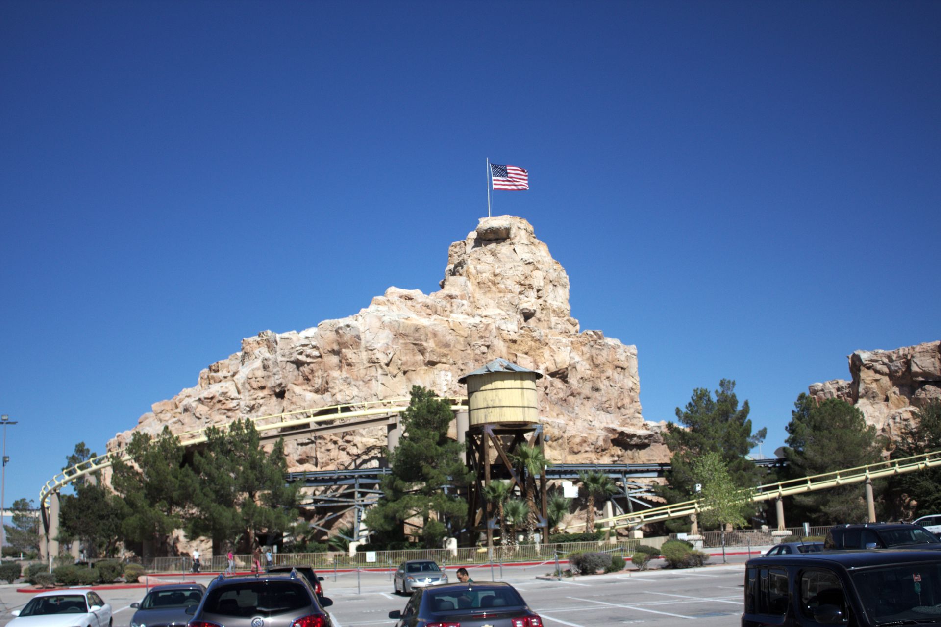 Das Casino an sich ist eigentlich ganz nett gestaltet. Erinnert stark eine Westernstadt. Neben der Achterbahn gibt es hier aber auch noch mehr Attraktionen. Es gibt noch einen Freefall-Tower (war geschlossen), einen Simulator, eine interaktive Wildwasserbahn (keine Ahnung ob offen, ist auf jeden Fall niemand gefahren) sowie eben die Achterbahn. Auf dem Weg dorthin hatte Dirk schon rumtelefoniert und präsentierte uns danach die Hiobs-Botschaft: Dat Dingen fährt nicht! Ein Sachverständiger/Prüfer hatte wohl eine Kitsche in der Bahn gefunden und sie daraufhin geschlossen. Diese musste nun erstmal ausgebessert werden, die Bahn wieder abgenommen werden und erst dann dürfte man wieder fahren. Gut, wir waren zum Glück einige Tage in Vegas, dass ungefähr 40 Minuten mit dem Auto entfernt liegt.