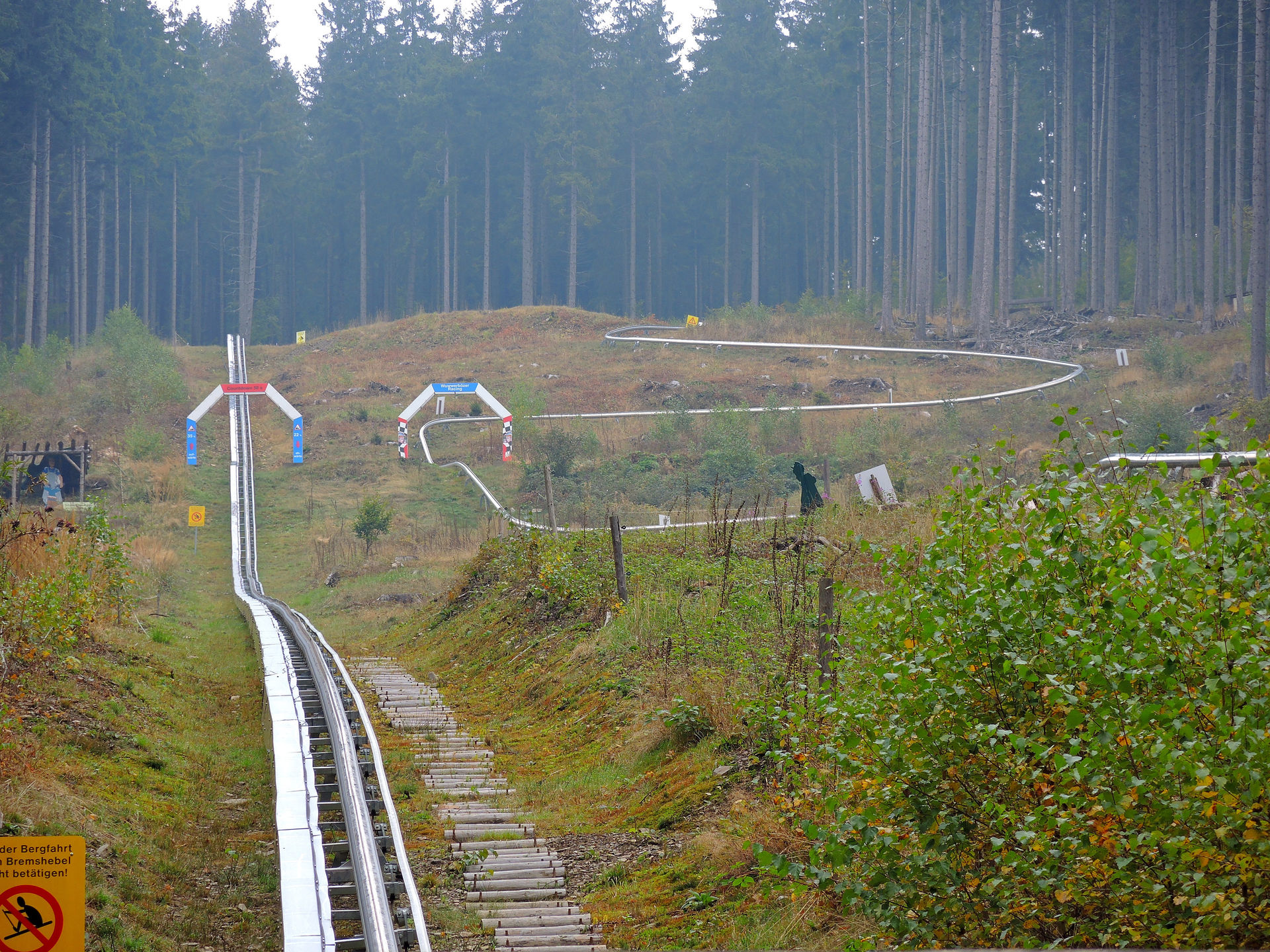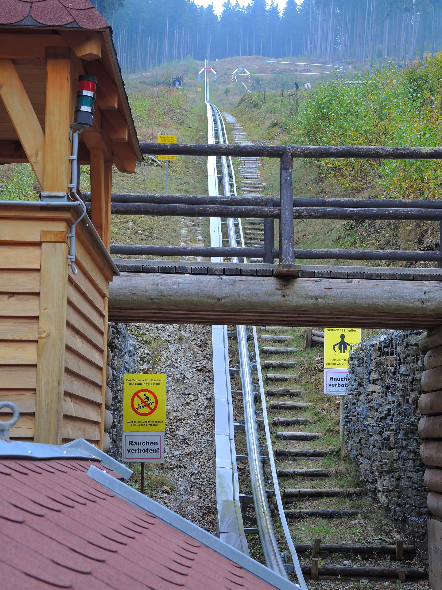 Als wir morgens kurz vor der regulären Öffnungszeit dort ankamen hat es zwar nicht mehr geregnet aber es war noch etwas nass. Uns wurde dann gesagt das die Bahn erst zwei Stunden später öffnet weil die Bremsen nicht richtig funktionieren bei Nässe und es deswegen zu gefährlich sei.