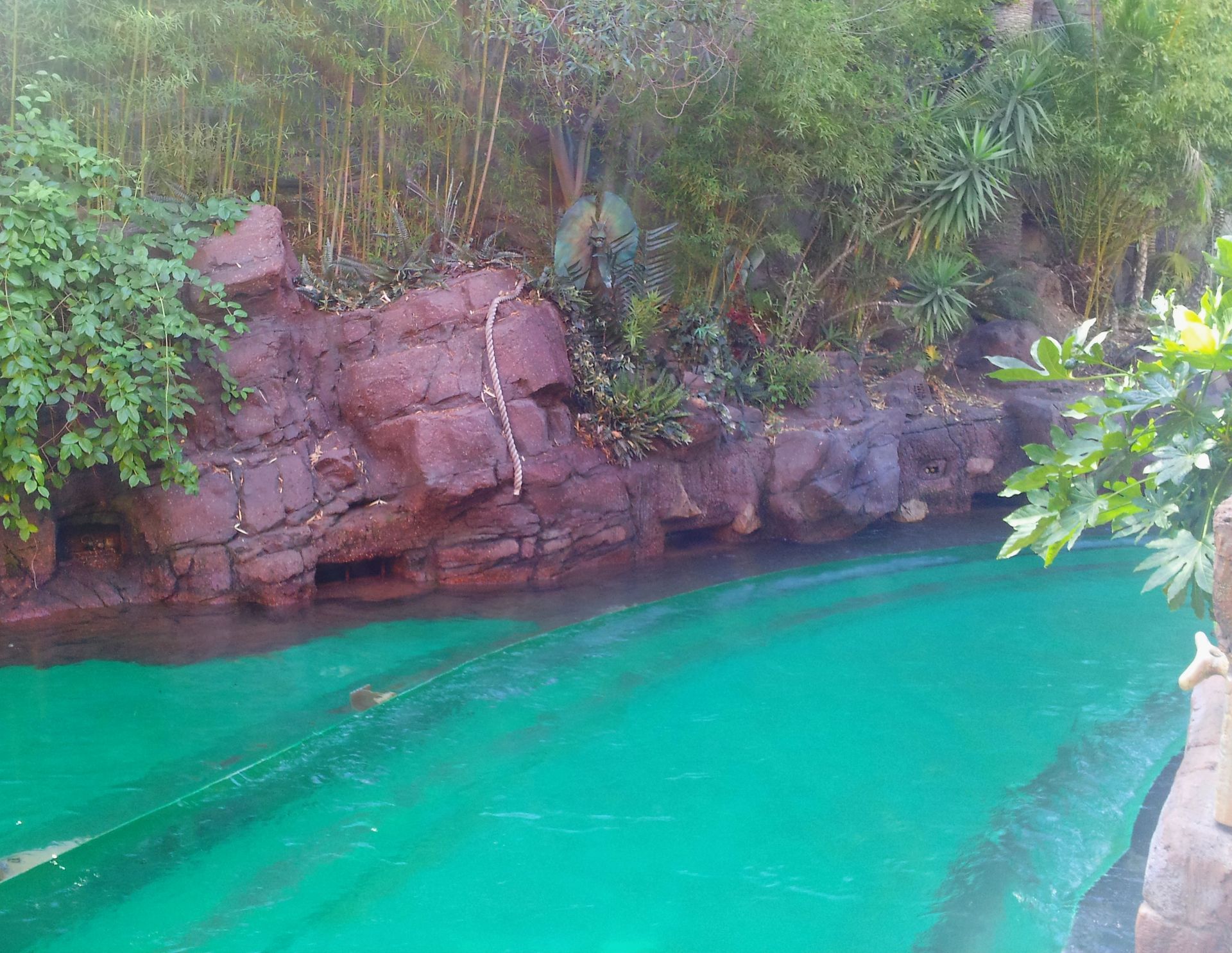 Kaum um die Kurve, sieht man einen der aus dem Film bekannten Jeeps, wie er kopfüber wippend über eine Wand hängt und schließlich in die Tiefe stürzt, um knapp neben unserem Boot im Wasser zu landen. Könnte aber durchaus etwas mehr spritzen.
