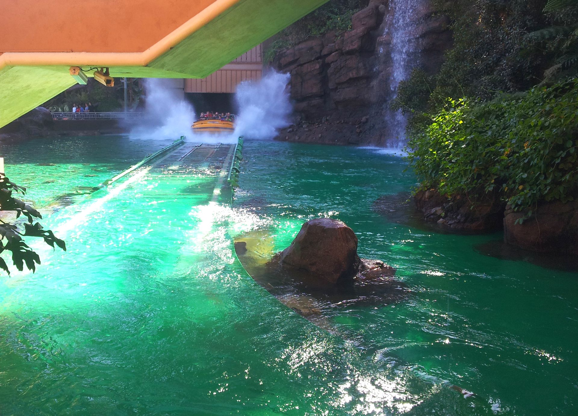 Auch Jurassic Park sind wir nochmals gefahren. Schnell ein Foto, bevor die ersten Wasserspritzer zu erwarten sind.