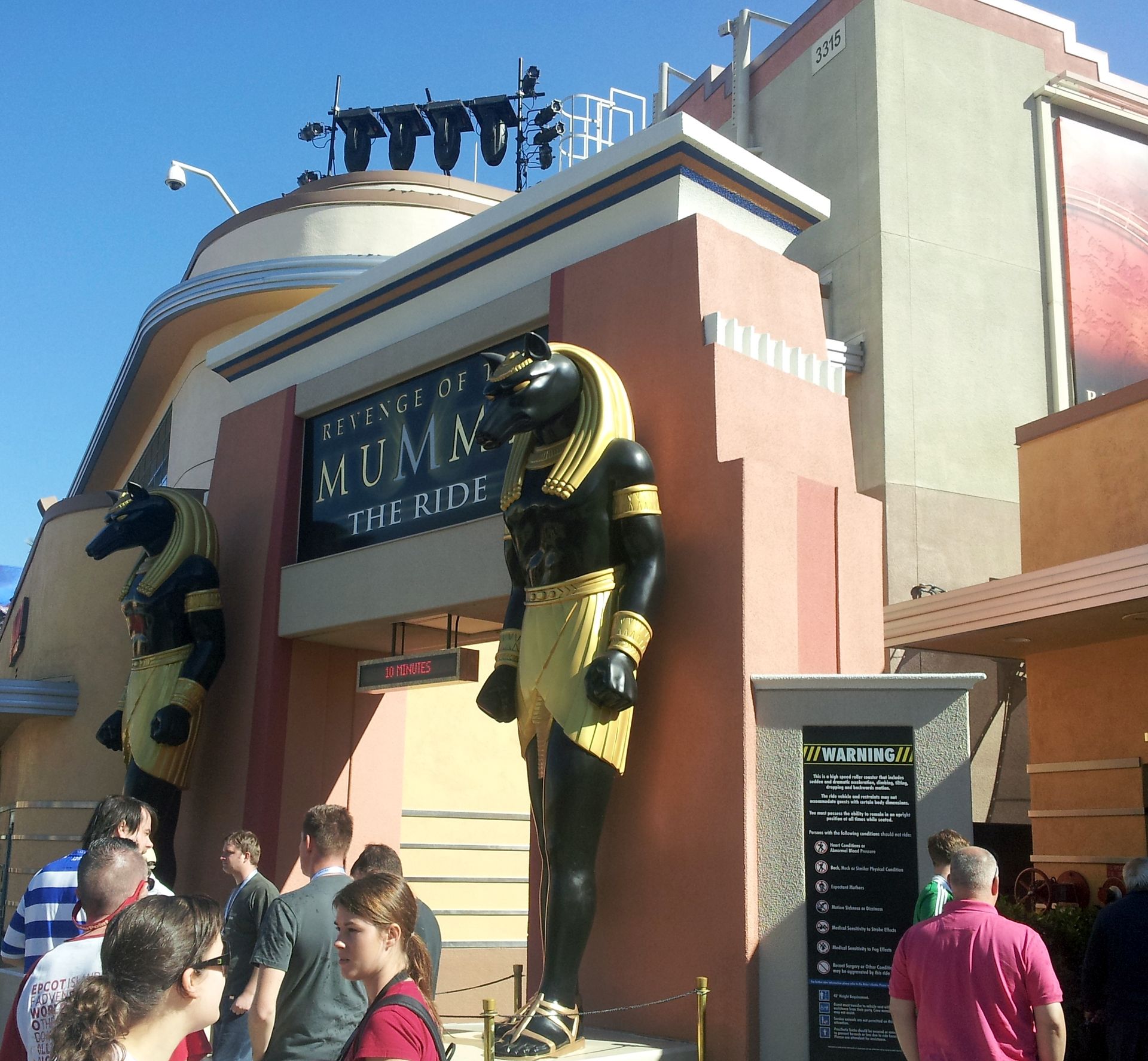 Der eigentliche Grund für unseren Besuch steht aber direkt gegenüber: Revenge of the Mummy - The Ride. Die einzige Achterbahn in diesem Park, und auch diese haben wir mit der gesamten Gruppe gestürmt. Rucksäcke dürfen auch hier wieder nicht mitgenommen werden, die Schließfächer hier sind allerdings 90 Minuten kostenlos - an diesem Tag völlig ausreichend. Man geht an eines der sechs oder sieben Terminals, scant seinen Fingerabdruck und bekommt dann ein Schließfach zugewiesen. Hat man seinen Rucksack verstaut, drückt man das Knöpfchen und das Schließfach ist zu. Zum Öffnen muss man dann erneut seinen Fingerabdruck scanen. Zu beachten ist aber, dass man dies am gleichen Terminal macht, da jedes Terminal einen anderen Schließfachbereich "überwacht".
