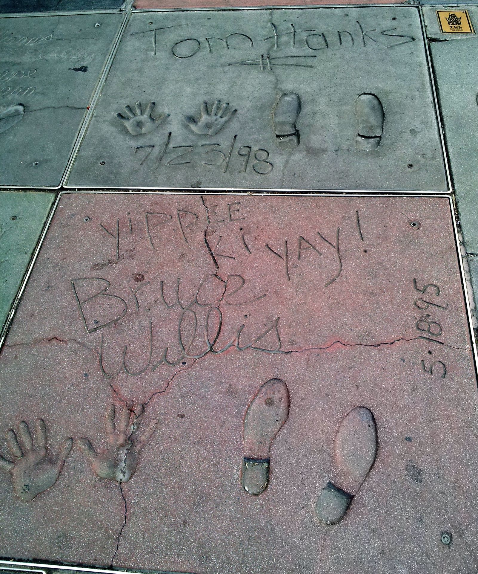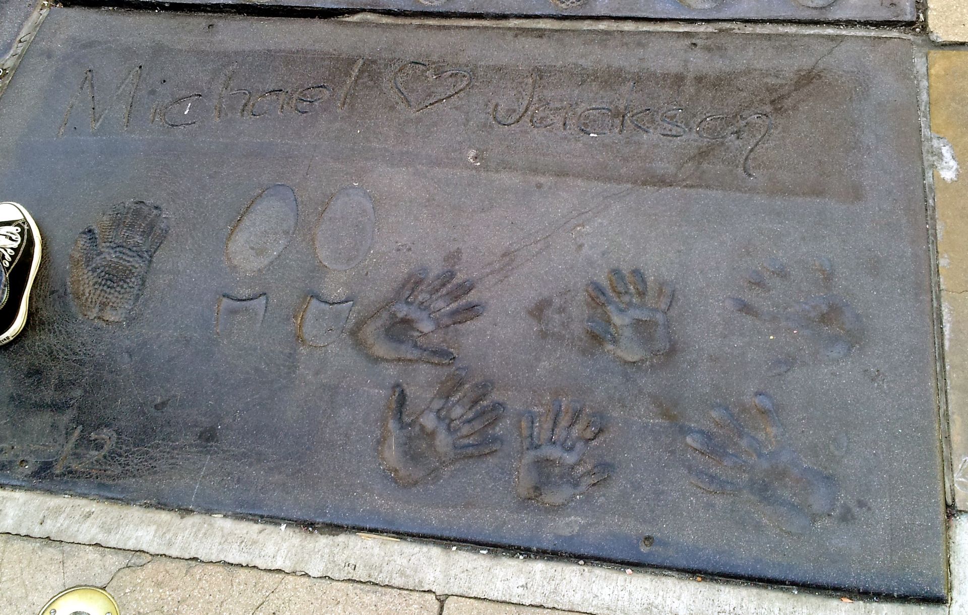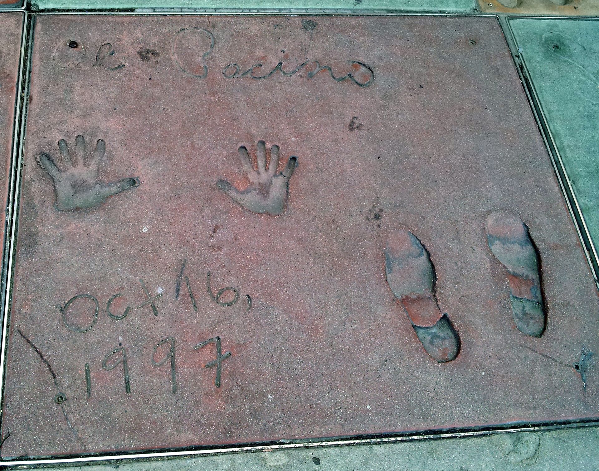 Die Sterne selbst fand ich jetzt nicht so interessant. Da die Namen mal sorum und mal sorum sind, ist es ziemlich schwierig, so im Vorbeigehen zu lesen, "wer" da so liegt. Zumal man ja auch noch aufpassen muss, dass man nicht jemand anderes über den Haufen rennt. Unser Bus hielt aber nicht weit vom Chinese Theatre. Dieses selbst ist schon imposant, die Betonplatten davor fand ich aber um einiges Interessanter, denn dort kann man wirklich in die Fußstapfen der Hollywoodstars treten. Und wem das nicht reicht, der kann auch noch vergleichen, ob auch seine Hand in den entsprechenden Handabdruck passt.