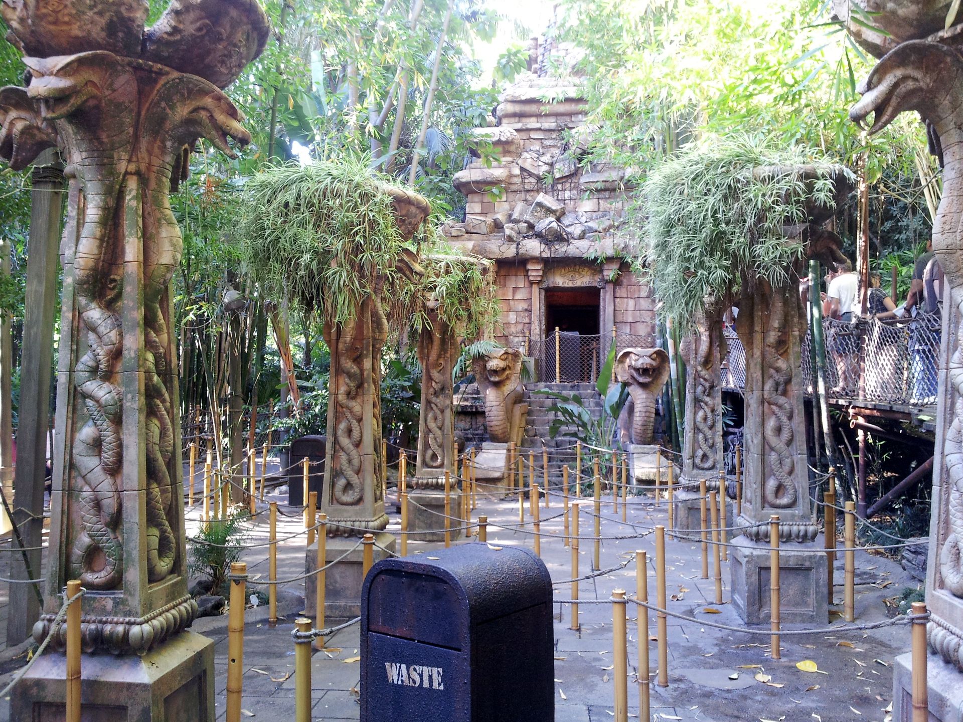 Zwischendurch gibt es auch noch eine kurze Pre-Show, dann besteigt man endlich einen der zwölf Personen fassenden Jeeps. Die sind beweglich auf dem Fahrwerk befestigt und können beliebig nach vorne, hinten und zu den Seiten geneigt werden. So werden bei der Fahrt durch die geheimnisvolle Tempelanlage Bodenwellen und dergleichen simuliert. Und die großartige Szenerie bildet dann noch das Tüpfelchen auf dem I. Natürlich darf auch die Szene, in der ein großer Felsbrocken auf den Jeep zurollt nicht fehlen. Wie ich jetzt lesen musste, fährt der Jeep dabei gar nicht rückwärts, sondern die Wände bewegen sich nach vorne.