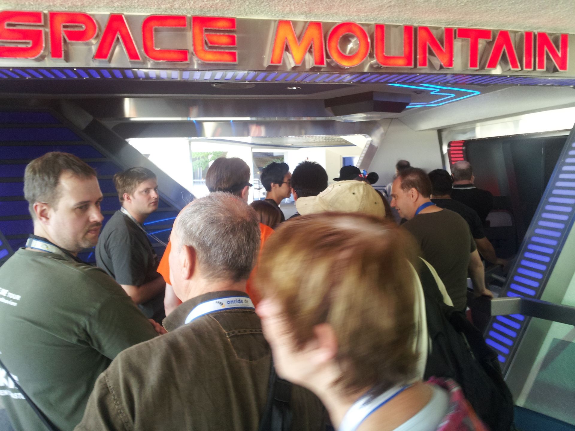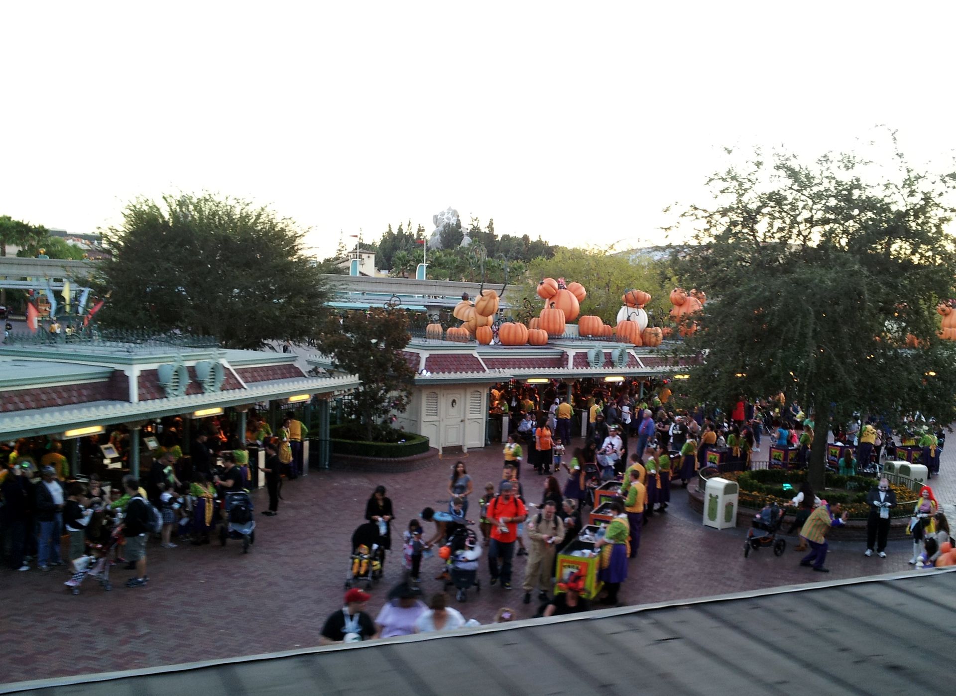 Andere onrider konnte ich jedoch zunächst nicht sehen. Also folgte ich dem Besucherstrom Richtung Ausgang, wo ich tatsächlich Marc vorfand. Gemeinsam gingen wir wieder zurück in den Park, wobei wir dann auch auf den Rest der Gruppe trafen. In der Abenddämmerung nutzten wir dann zunächst einen der vielen Treat Trails. Das sind abgesperrte Wege, auf denen man an mehreren Ständen vorbeigeht, an denen man Süßigkeiten in seine Tüte gefüllt bekommt. Gleich zwei davon wurden in der Mainstreet geplündert, ehe wir Space Mountain als erste Fahrt des Abends auserkoren.