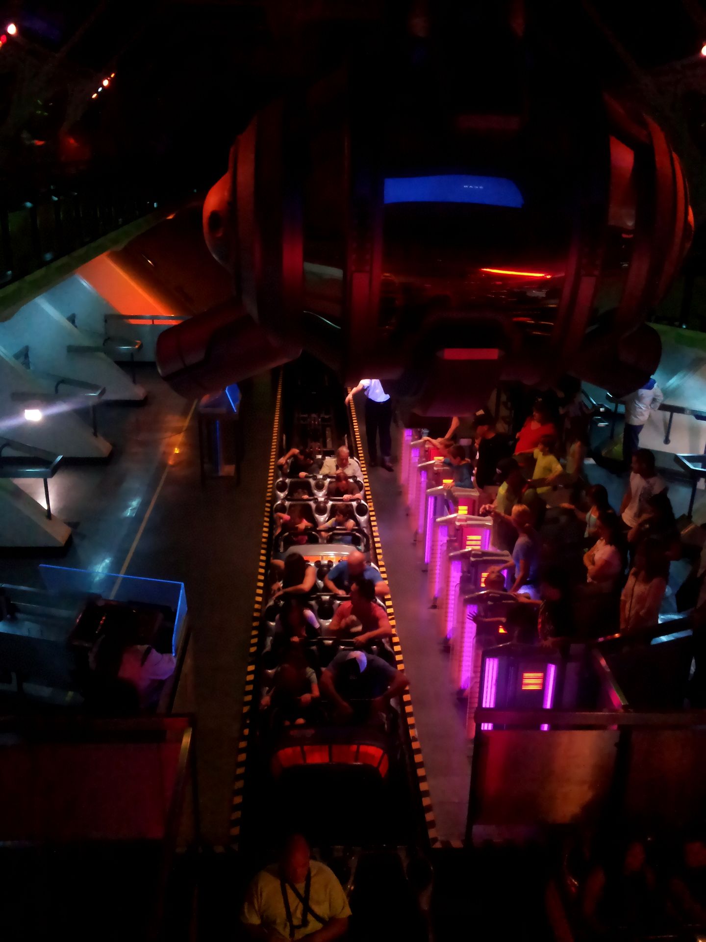 An der dortigen Haltestelle wurde bereits kontrolliert, dass nur Gäste mit Wristband aussteigen. Auch wenn einige nicht ganz verstanden haben, weshalb sie nicht austeigen durften. Hinter Space Mountain verschwindet der Zug dann in einem Tunnel.