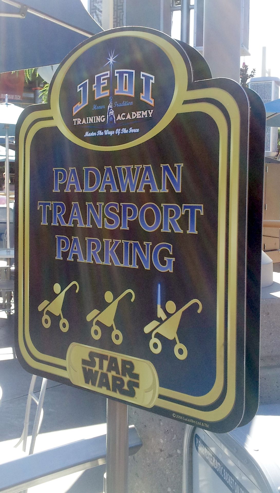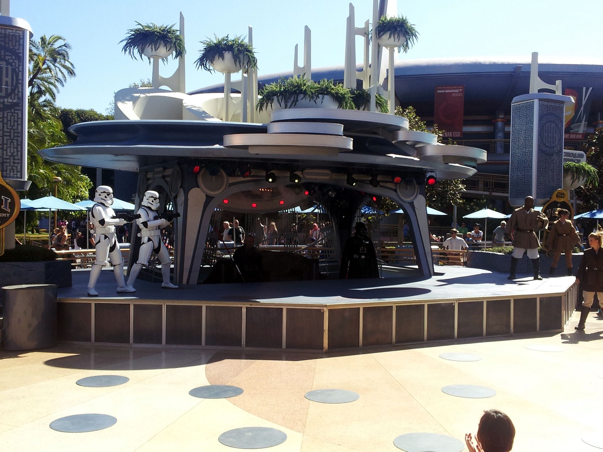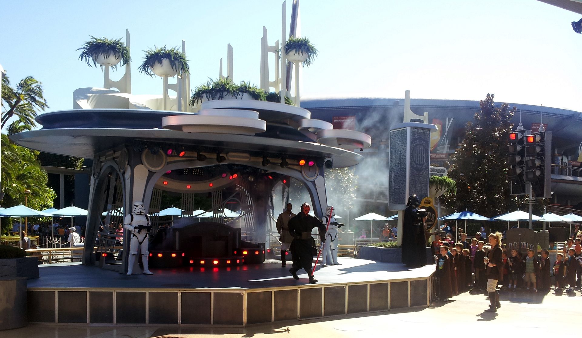 Elke hatte noch nichts gegessen, und so setzten wir uns auf die Terrasse neben einem Imbiss, vor der gerade die Jedi Training Academy startete. Das ist eine Art Show, bei der Kinder aus dem Publikum ausgewählt werden, die dann einen Jedi-Umhang und ein Laserschwert bekommen. Natürlich kein echtes, sondern ein Übungsschwert aus Plastik, das wie ein Teleskop "ausgeklappt" werden kann. Dann wird eine Choreografie einstudiert und plötzlich tauchen Darth Vader und Darth Maul auf, die die jungen Padawan zur Dunklen Seite der Macht bekehren wollen. Der Reihe nach kämpft dann jedes Kind mit einem der beiden, wobei die vorher einstudierte Choreografie zum Einsatz kommt. Also ich fand's süß, schade, dass ich doch schon etwas zu alt bin.