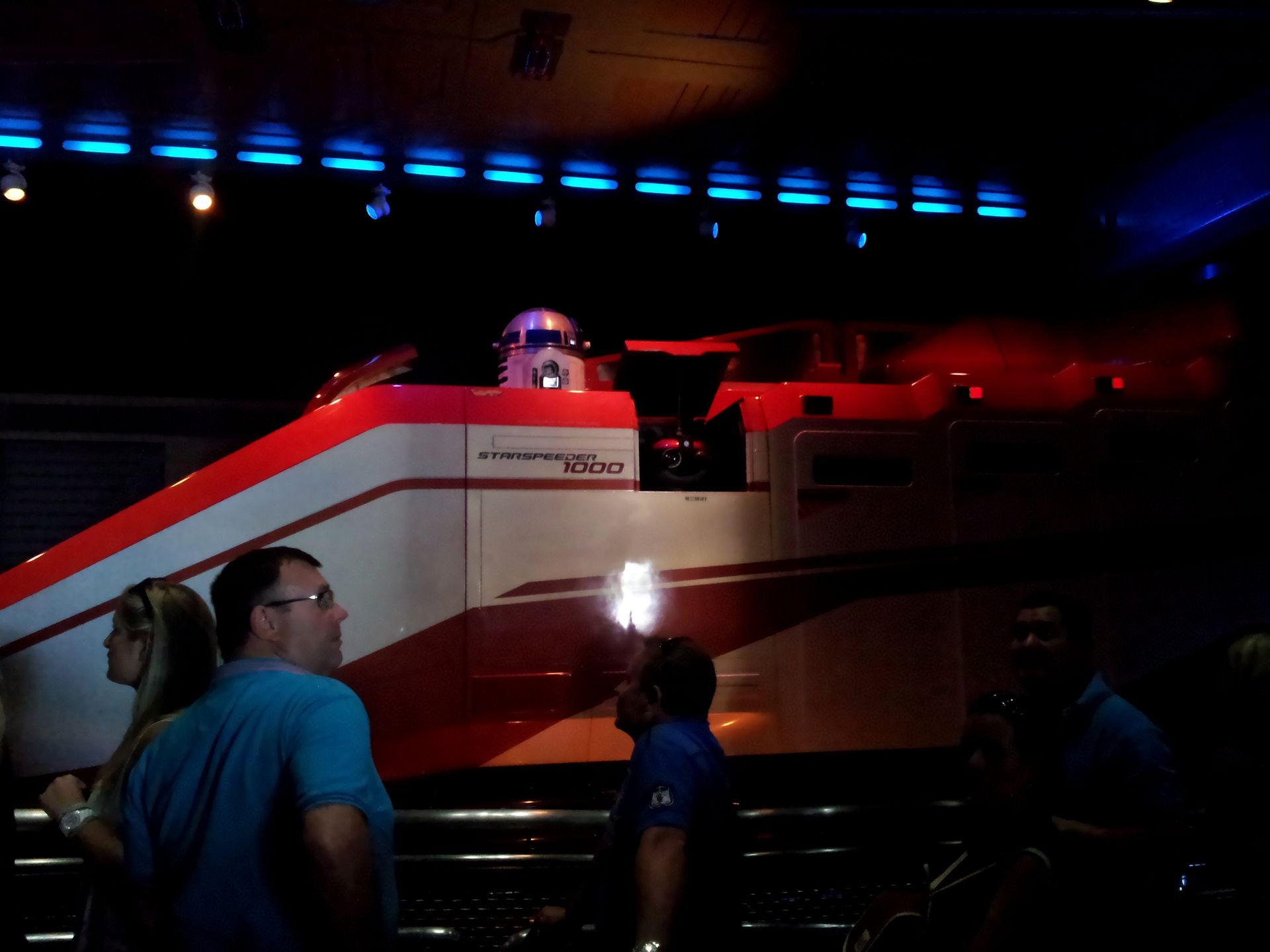 Sind die Türen geschlossen, öffnet sich das Tor, das den Blick ins Cockpit und eben auf die Leinwand freigibt. Dort sitzt C-3PO, der gerade die letzten Systemchecks vor dem Start durchgeführt hat. Obwohl er mehrfacherklärt, dass er nicht der Captain ist, wird die Startsequenz eingeleitet und das Schiff gleitet in Richtung Startrampe. Der Film ist dabei modular aufgebaut. Es gibt wohl zwei Startszenen, drei Mittelszenen und drei Endszenen, dazwischen geht es jeweils mit Lichtgeschwindigkeit durch die Weiten des Weltraums. Insgesamt sind damit 54 verschiedene Abläufe möglich. Wer da zweimal den gleichen Flug erwischt, hat wirklich Pech.
