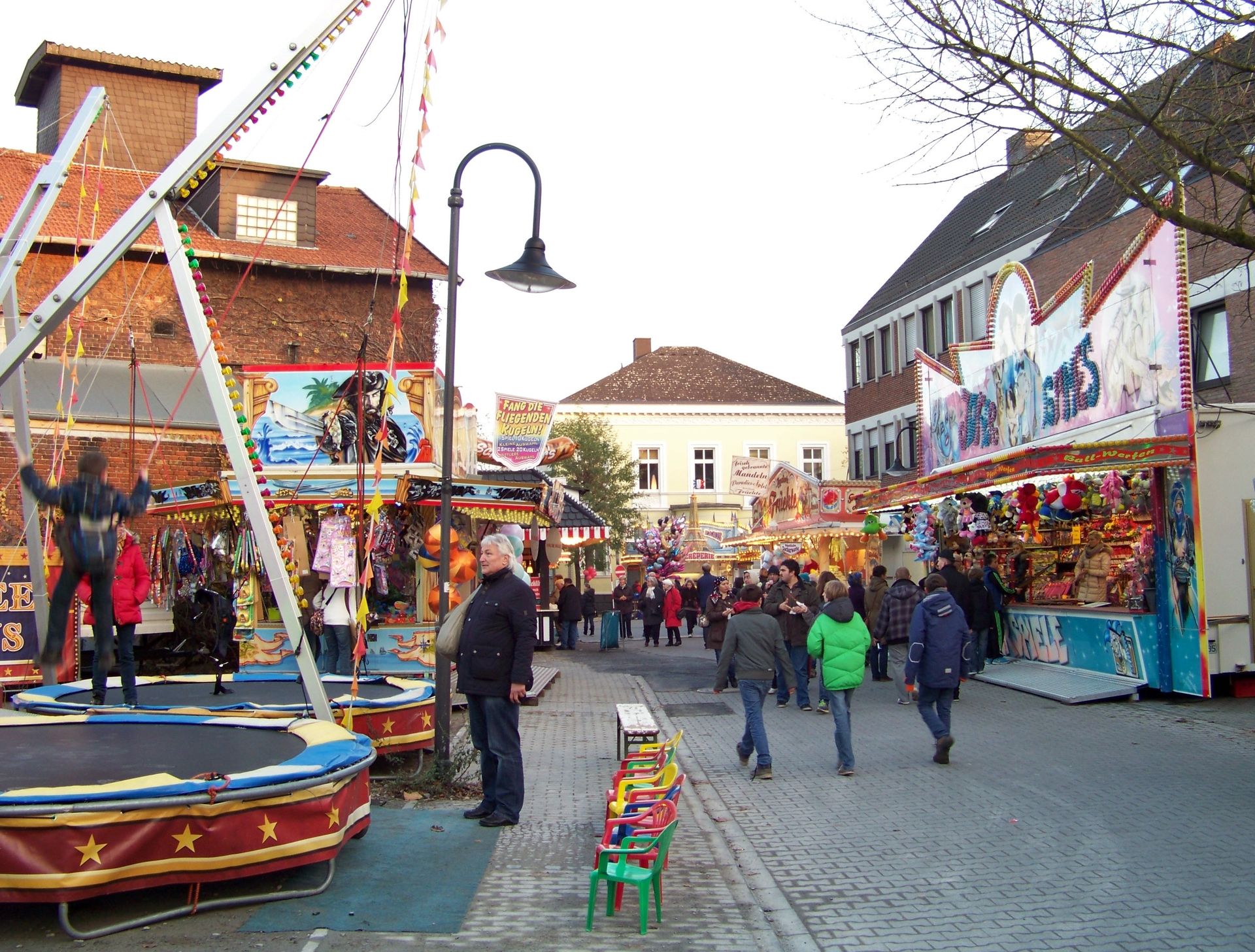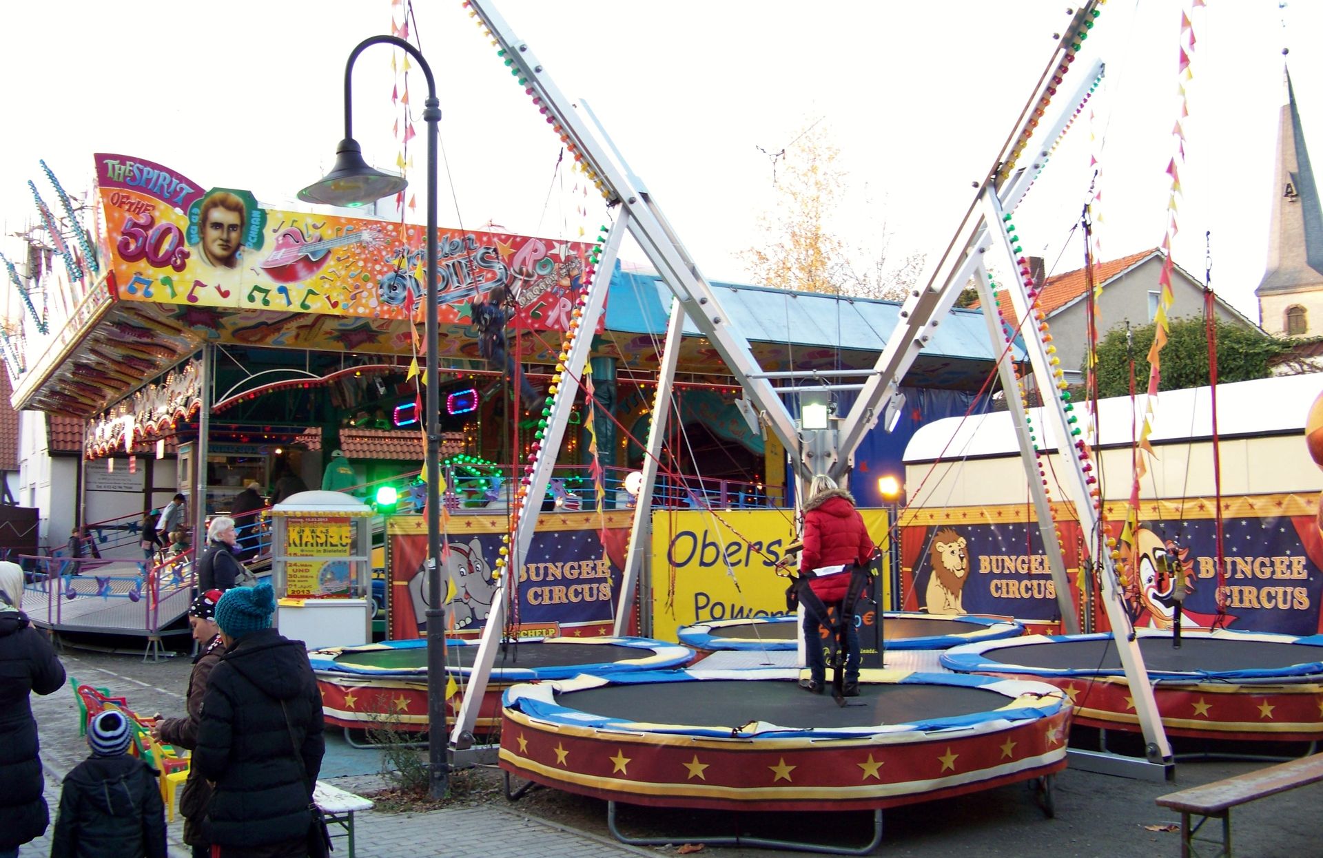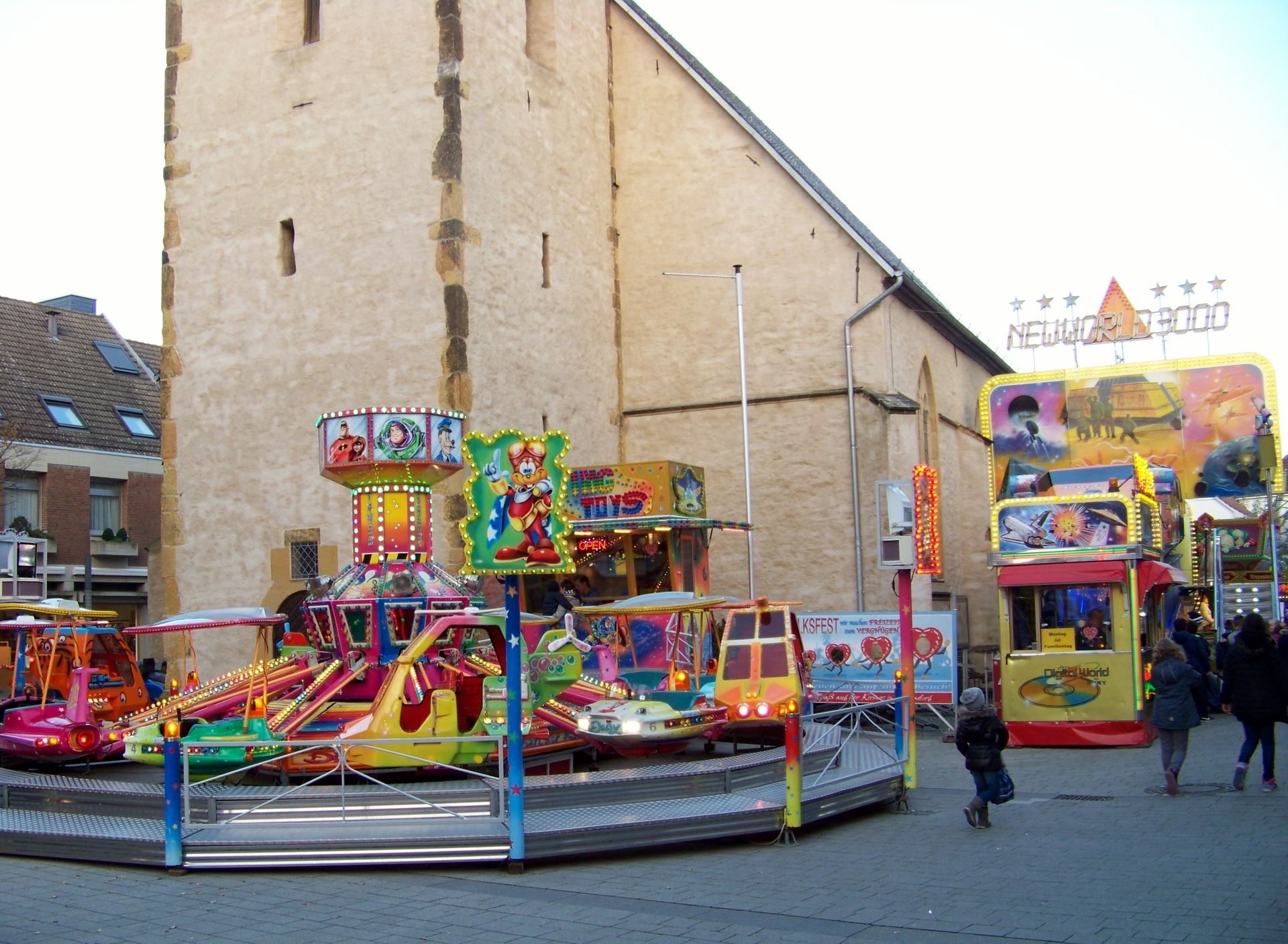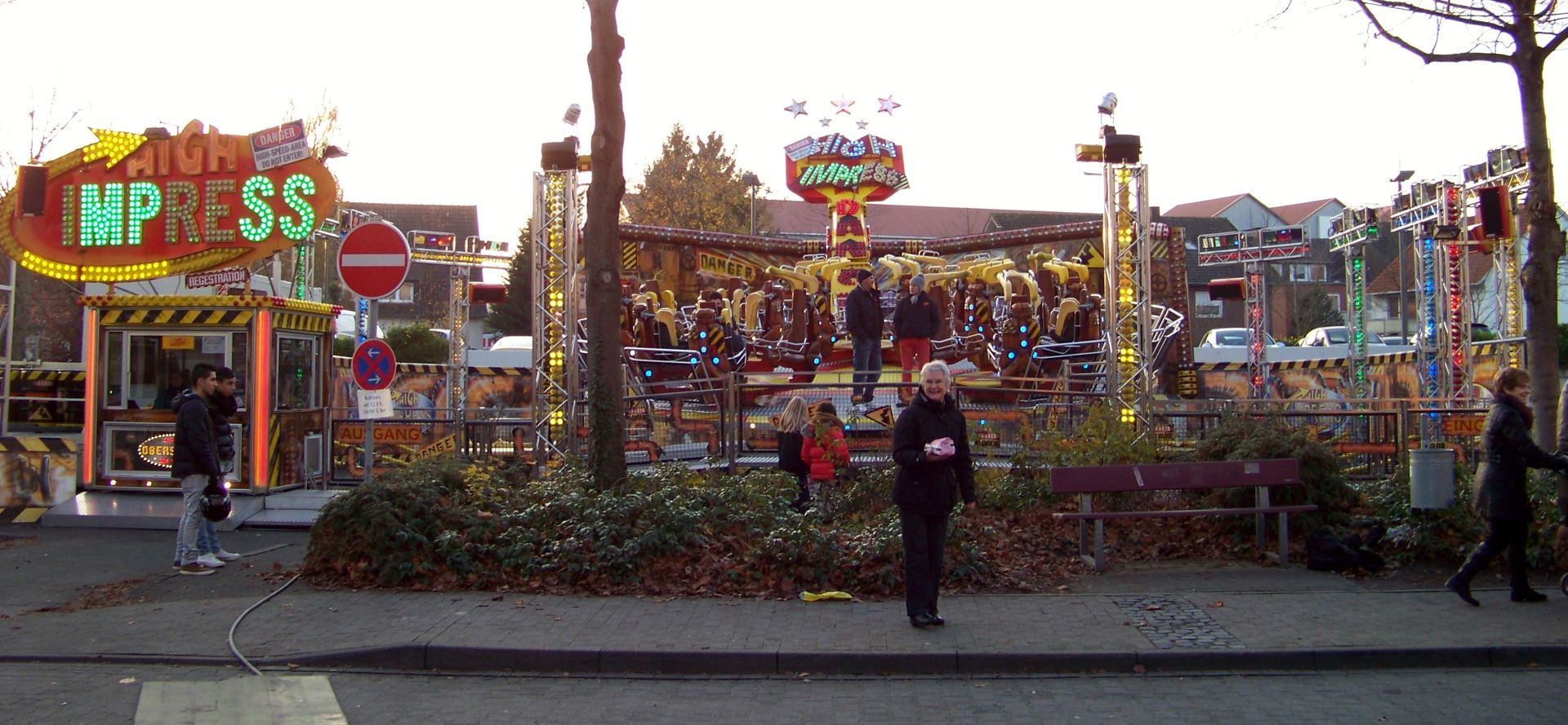 Den Anfang macht die Andreaskirmes in Rheda: Die etwas kleinere und - aufgrund der Jahreszeit - kühlere Kirmes in der Doppelstadt. Wie auch der Herbstmarkt in Wiedenbrück ist die Andreaskirmes eine Innenstadtkirmes, die leider in Sachen Kulisse und Flair nicht mit der Veranstaltung im anderen Stadtteil mithalten kann. Auch in Sachen Beschickung fällt Rheda gegenüber Wiedenbrück immer ein wenig ab, was auch daran liegt, dass einer der Festplätze mittlerweile nur noch für einen kleinen Krammarkt und nicht mehr für große Kirmesattraktionen genutzt wird. Auch sonst ist die Besetzung mit Fahrgeschäften doch sehr durch die Stammbeschicker Jumpstreet, Autoscooter, New World 3000, Star Club und Montgolfiere (die im Vorjahr aussetzte) geprägt, die auch in (fast) jedem Jahr die gleichen Plätze einnehmen. Übrig bleiben nur noch jeweils ein Wechselplatz für ein Fahrgeschäft, den bei der aktuellen Ausgabe High Impress einnahm, und einen für ein Laufgeschäft, der in diesem Jahr durch eine kurzfristige Absage nur noch mit einem Trampolin besetzt werden konnte. Sehr schade für die an sich ganz nette Veranstaltung, die dadurch in diesem Jahr verhältnismäßig schwach besetzt war.